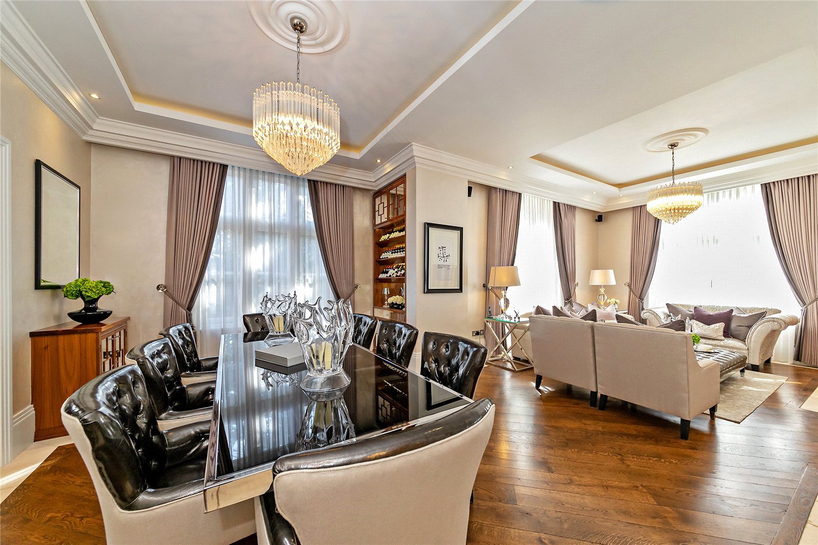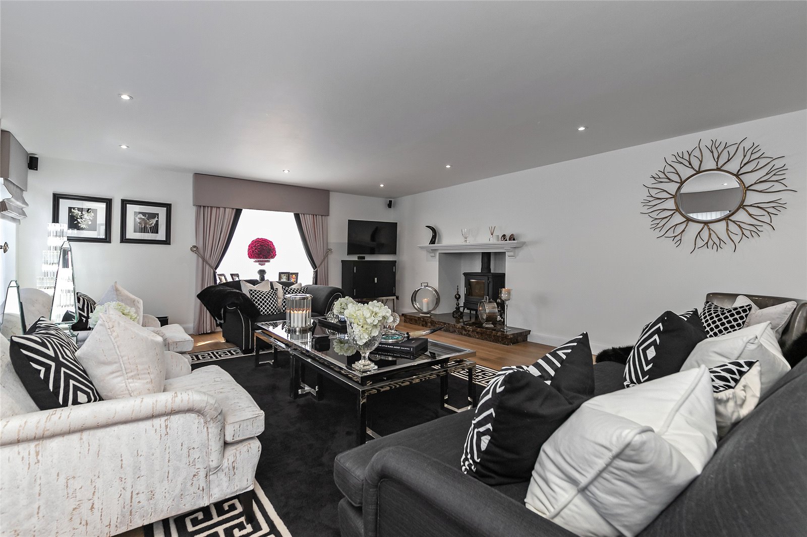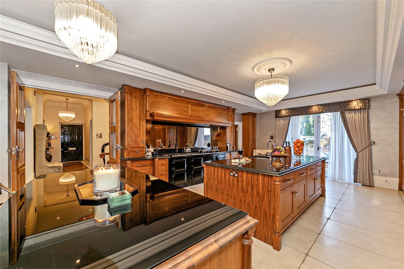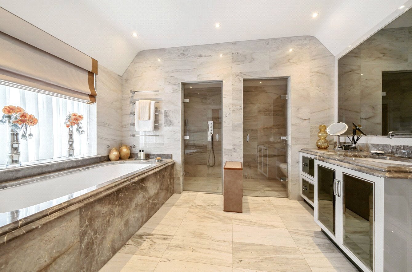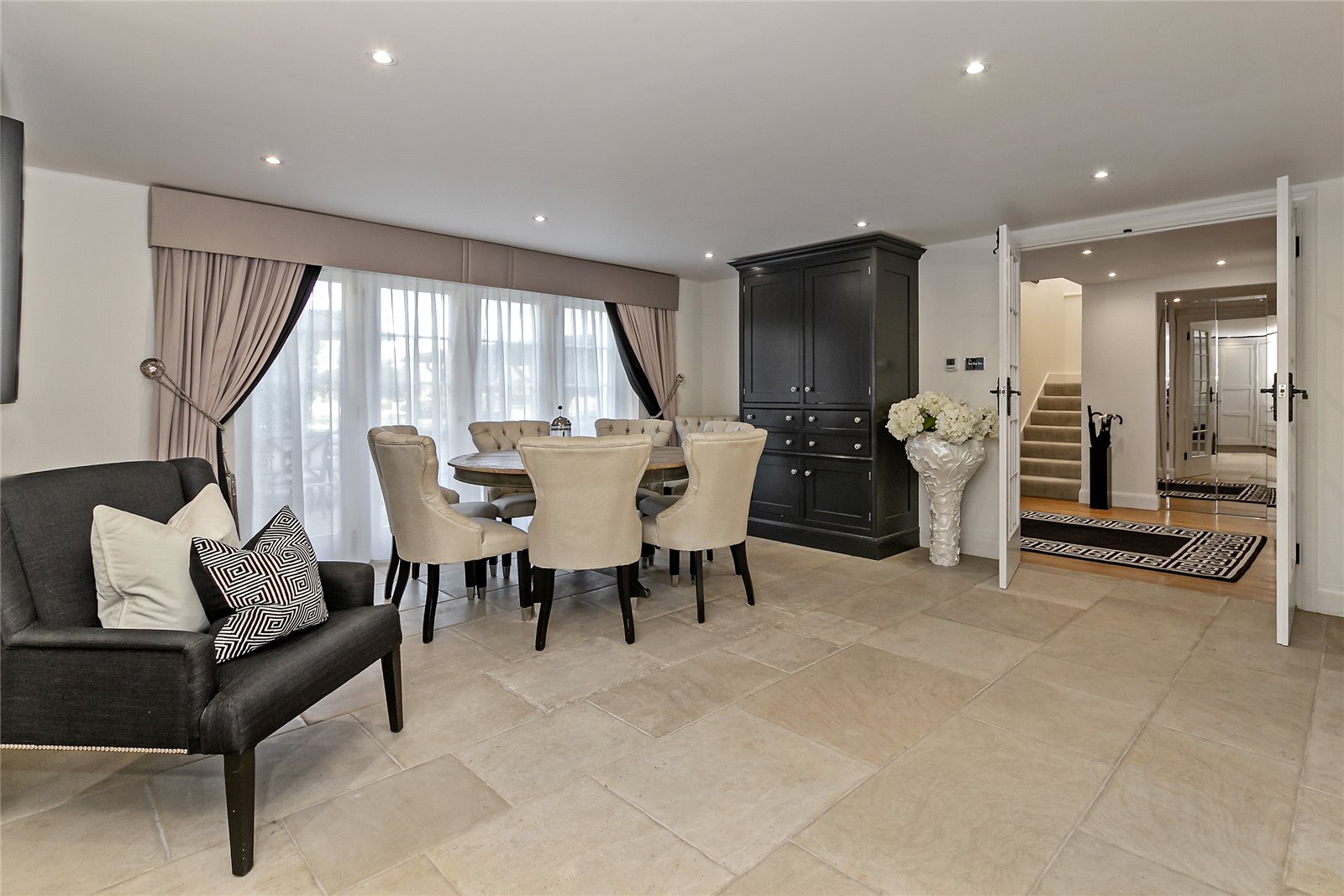 You are welcomed on the ground floor into a spacious reception hallway which opens into sitting/dining room, stunning 56' bespoke fitted Kitchen/lifestyle room, study, utility room and guest cloakroom. A choice of two staircases leads down to a superb Entertainment/Games/Cinema Room.