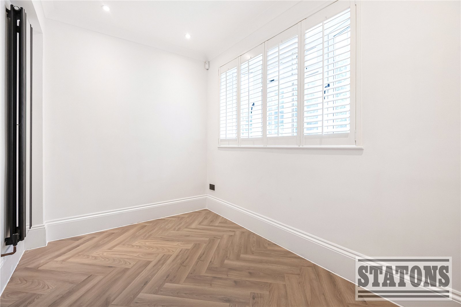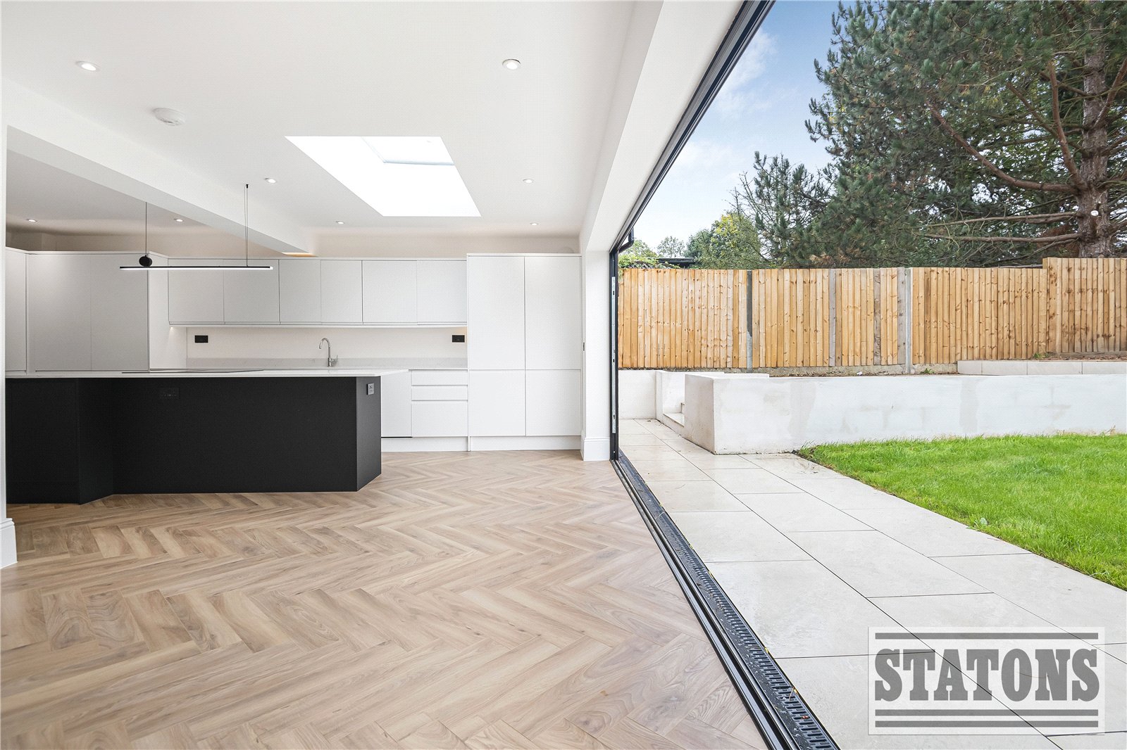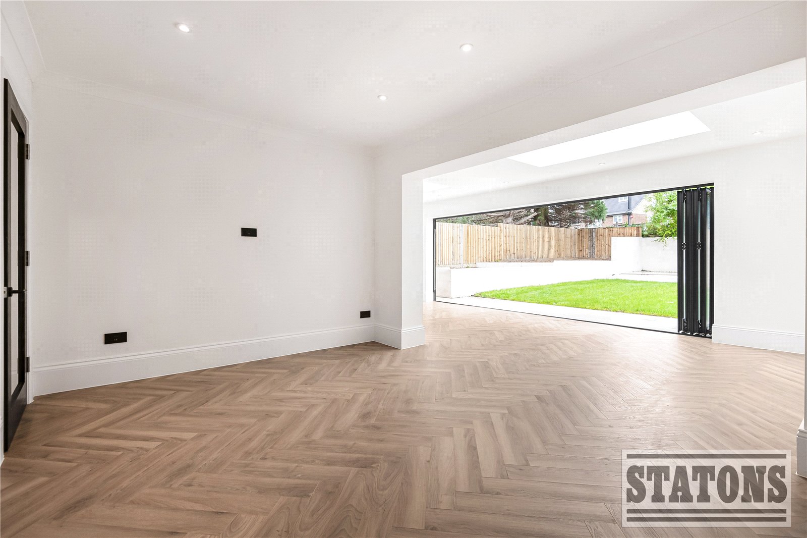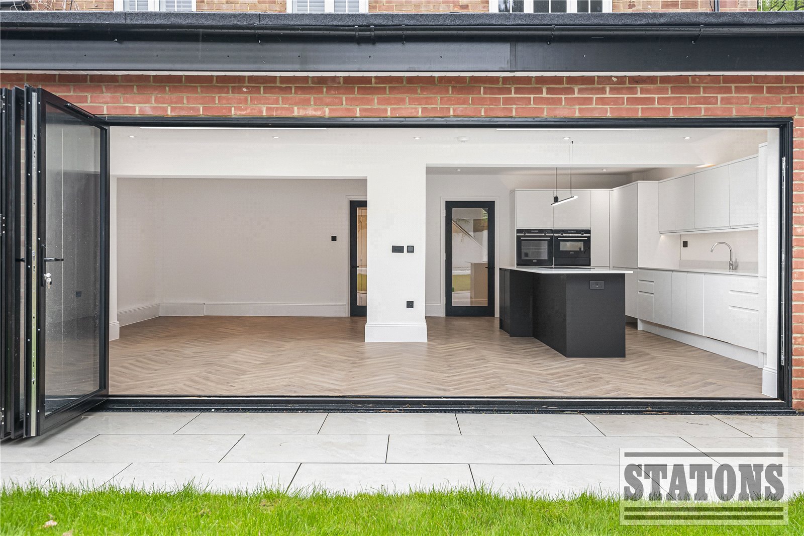 The extended kitchen has been fitted with a bespoke range of units, quartz worktops, and Siemens integrated appliances, creating a sleek and contemporary feel. Bi-folding doors open onto the landscaped rear garden, flooding the room with natural light and providing a seamless transition between indoor and outdoor living.
