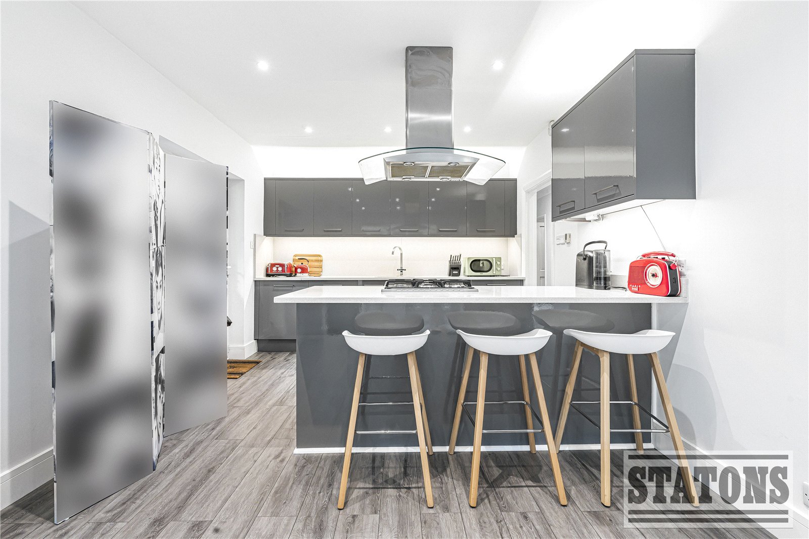 The contemporary kitchen is fitted with quartz worktops, a breakfast bar, and integrated Bosch appliances, blending style with practicality. Adjacent to this is the partially converted garage, currently offering an additional bathroom and more convenient storage space.