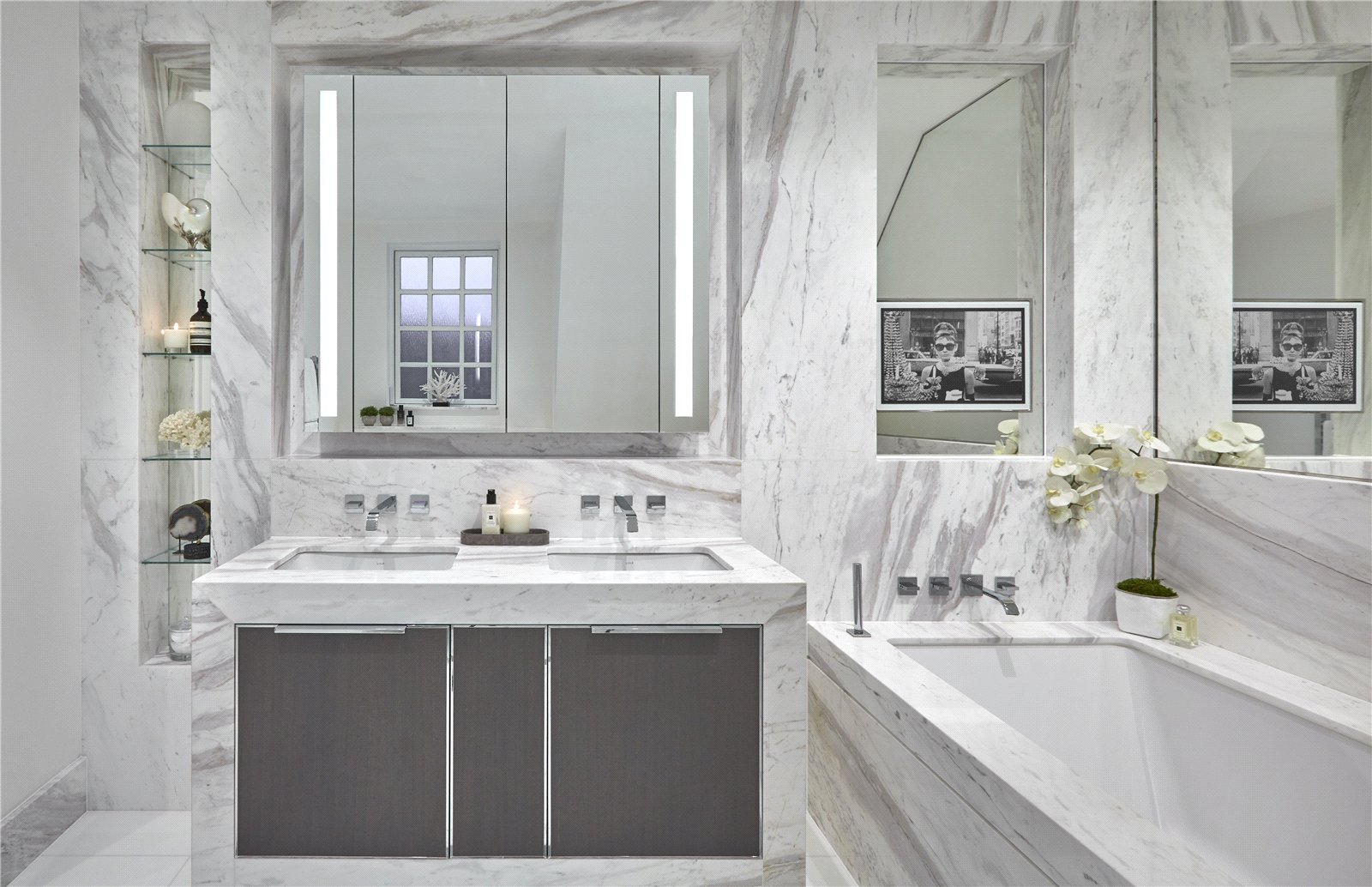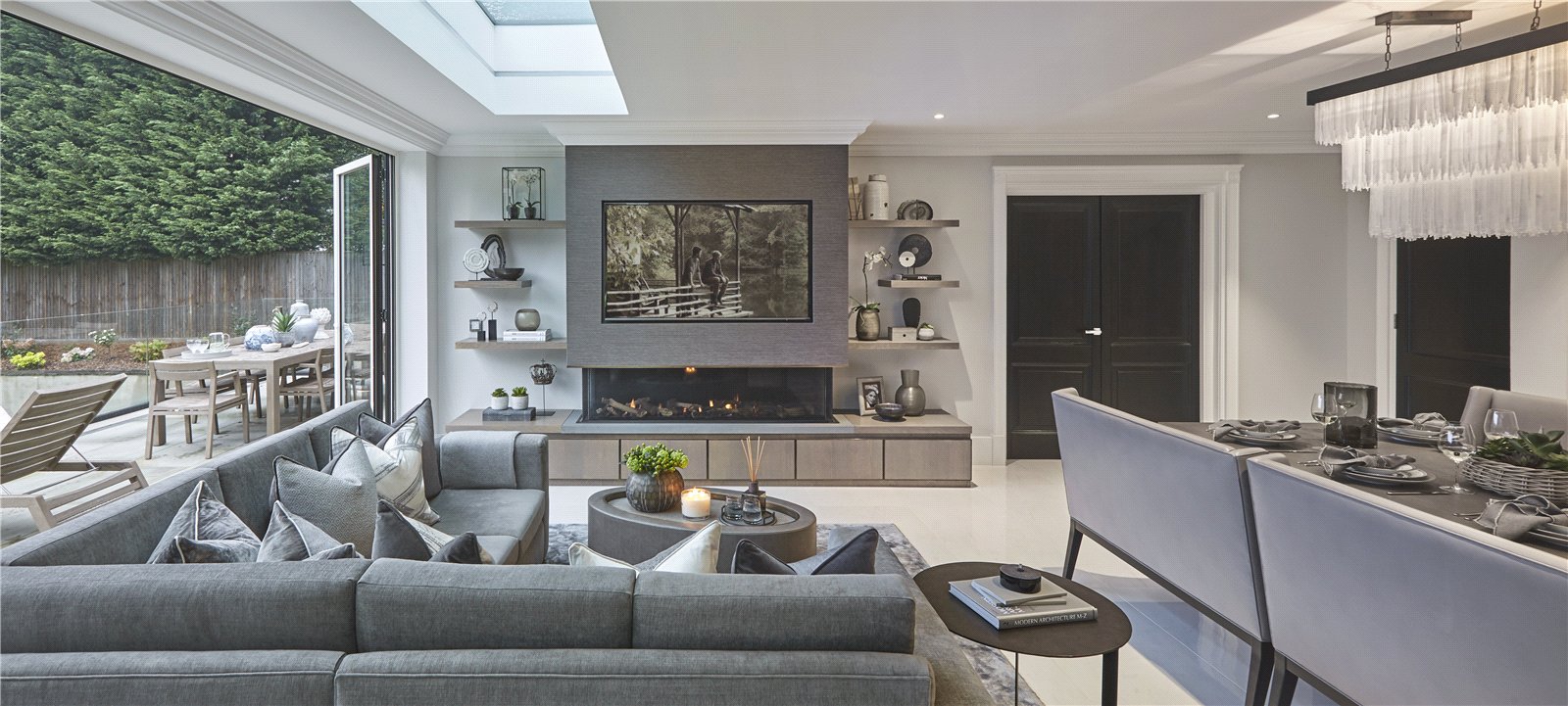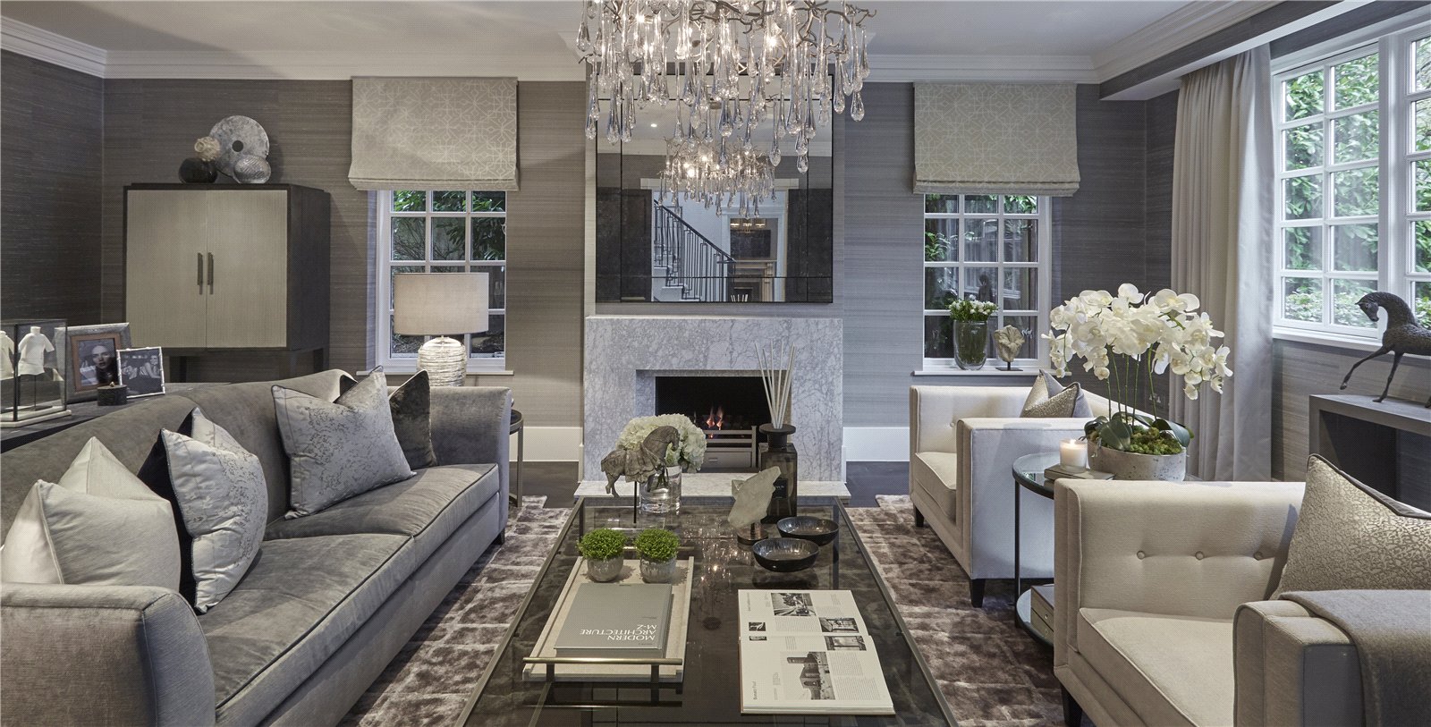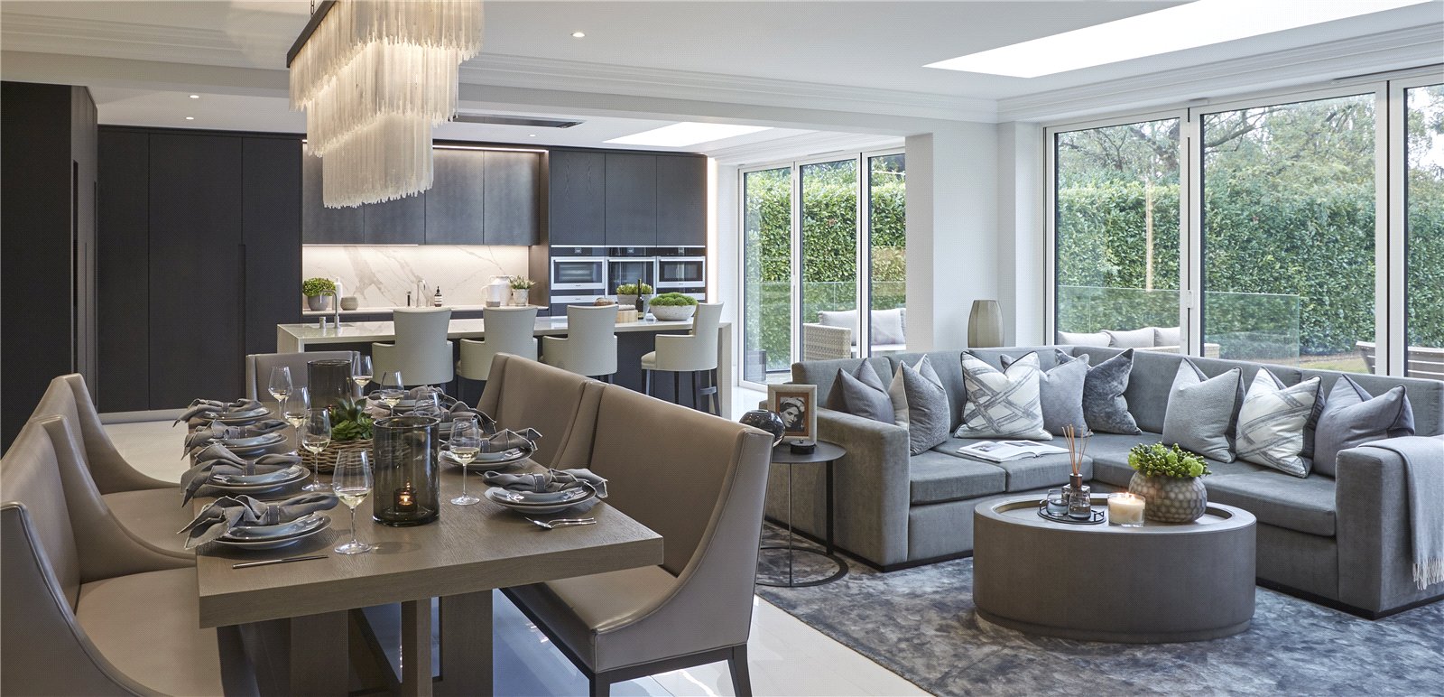 Outside, a beautifully sized garden which is mainly laid to lawn must be seen to appreciate the privacy and seclusion it offers and is framed by a selection of mature shrubs and trees. This beautifully designed outdoor space is perfect for entertaining on a grand scale.