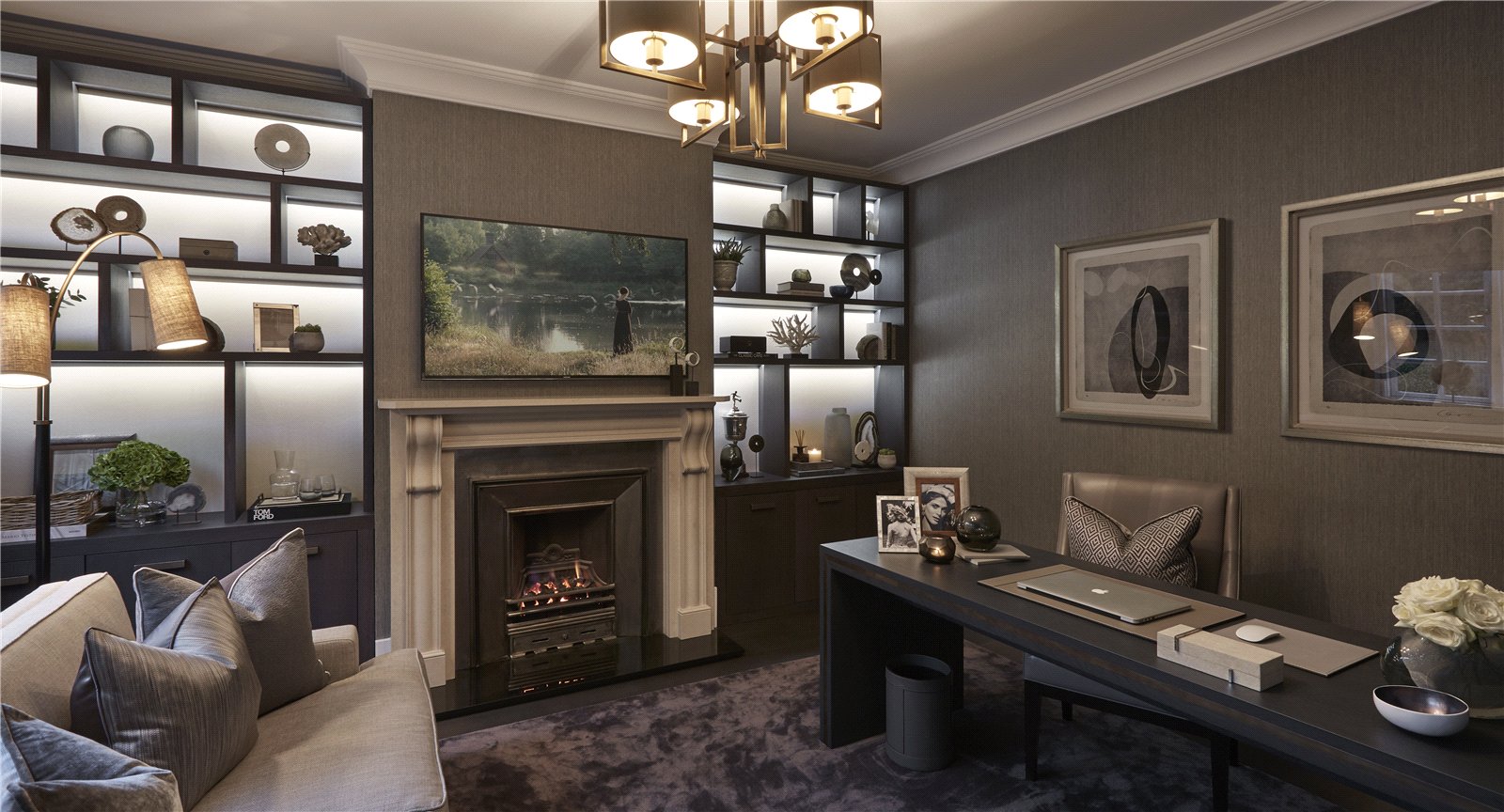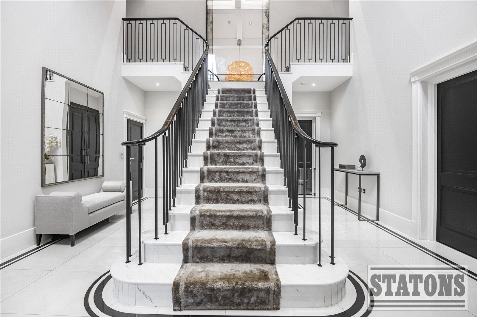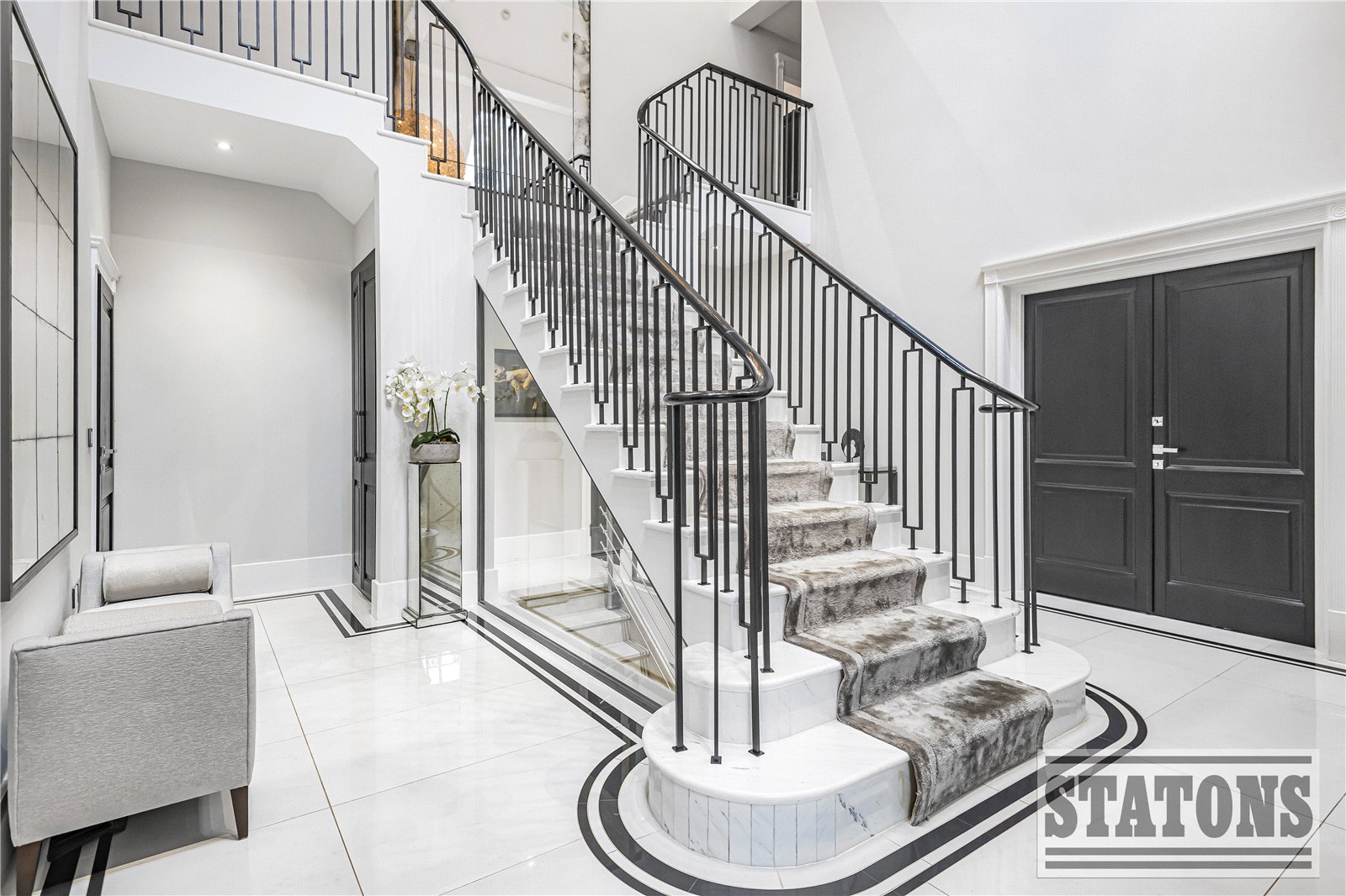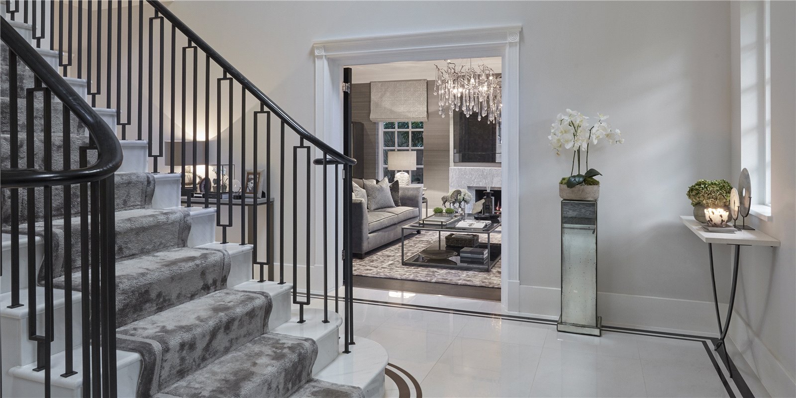The impressive entrance hallway creates an immediate sense of grandeur and provides access to a study, a formal reception room, play room and a beautifully designed kitchen/dining/lounge super room. The kitchen features sleek finishes and opens onto the landscaped patio and garden through bi folding doors perfect for entertaining. This floor is further complemented by a well-appointed utility room and a stylish guest WC.