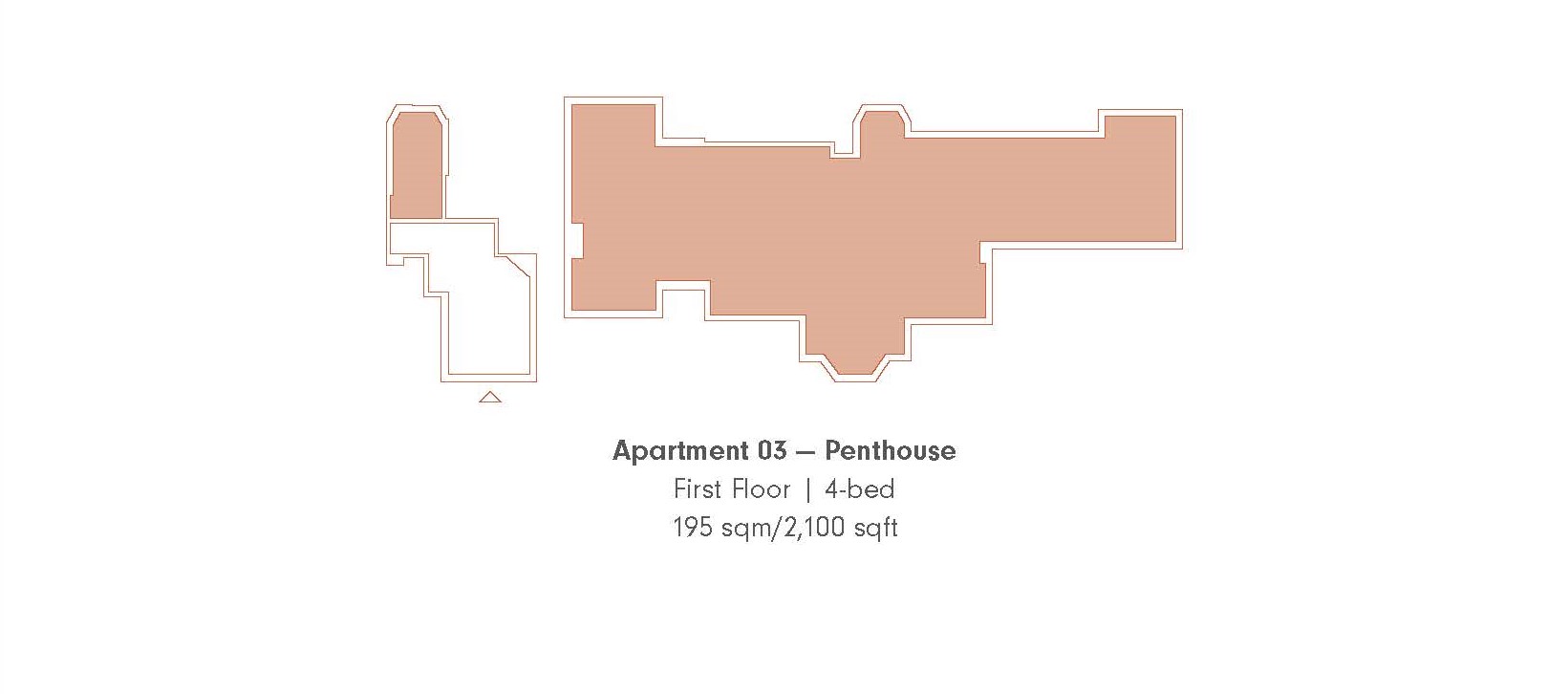 With over 195 sqm of accommodation the unique luxury penthouse occupies the first floor as a lateral apartment spanning over 25 meters. Access from the ground level foyer leads to the private entrance vestibule and a dedicated stairway. This also offers exclusive access to the private landscaped rear garden. The living accommodation is concentrated to the west wing with sleeping areas to the east wing.