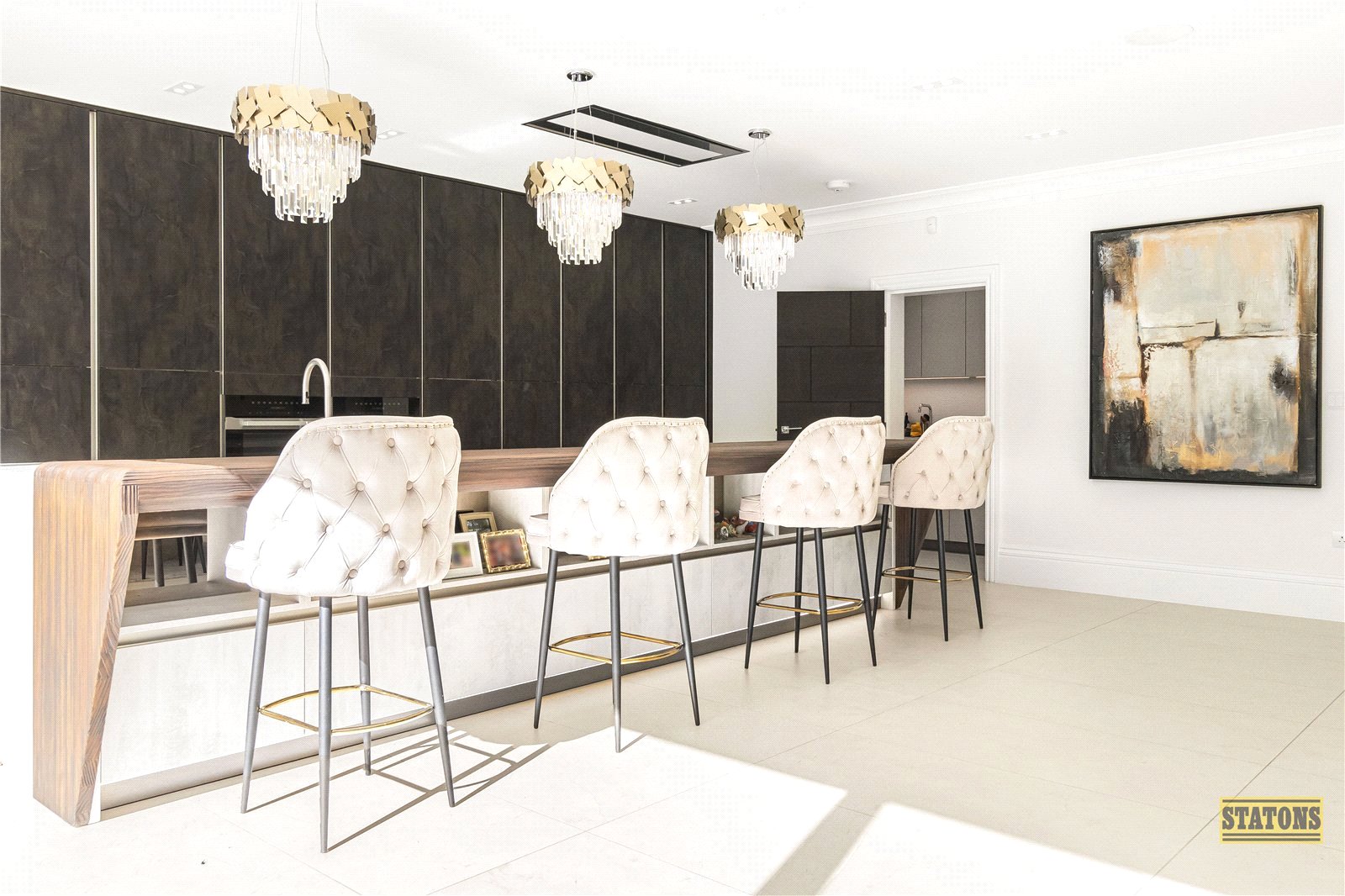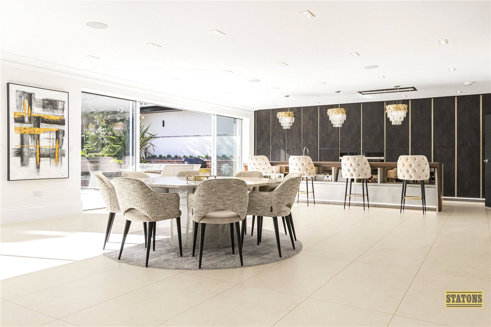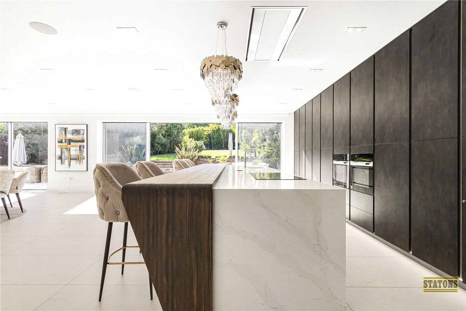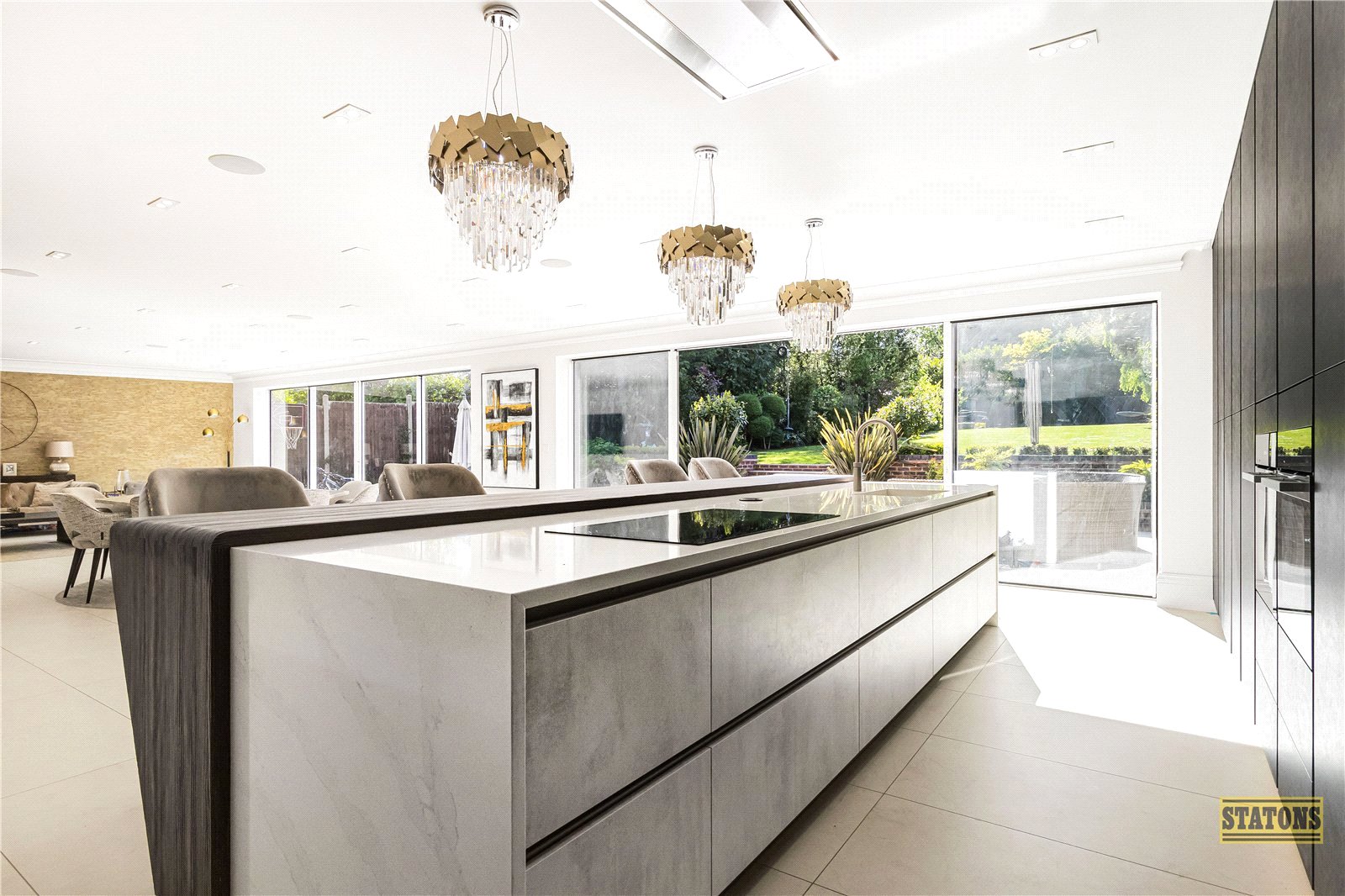 The heart of the home lies to the rear: an awe-inspiring open-plan super room where daily life and entertaining converge in spectacular style. The Beckermann kitchen exudes sleek German precision, with Dekton quartz worktops, a bespoke Sepkva breakfast bar, Miele appliances, and a Quooker boiling water tap for everyday luxury. Adjacent, the prep kitchen and utility area are equally refined, equipped with integrated Siemens appliances.