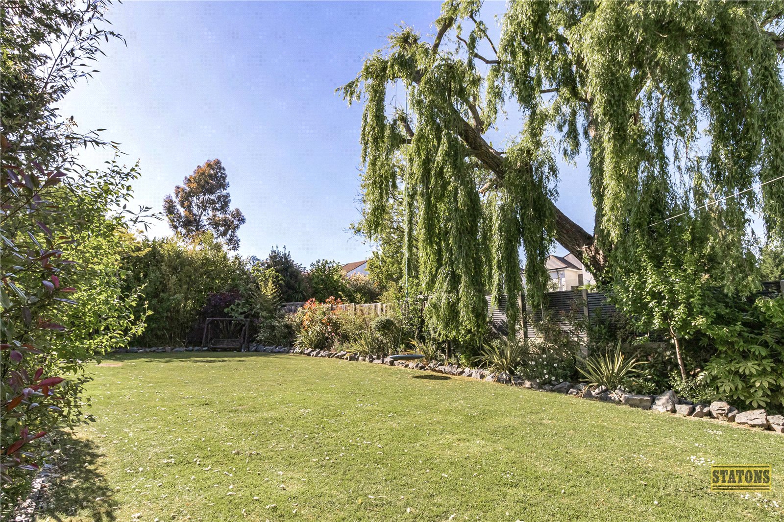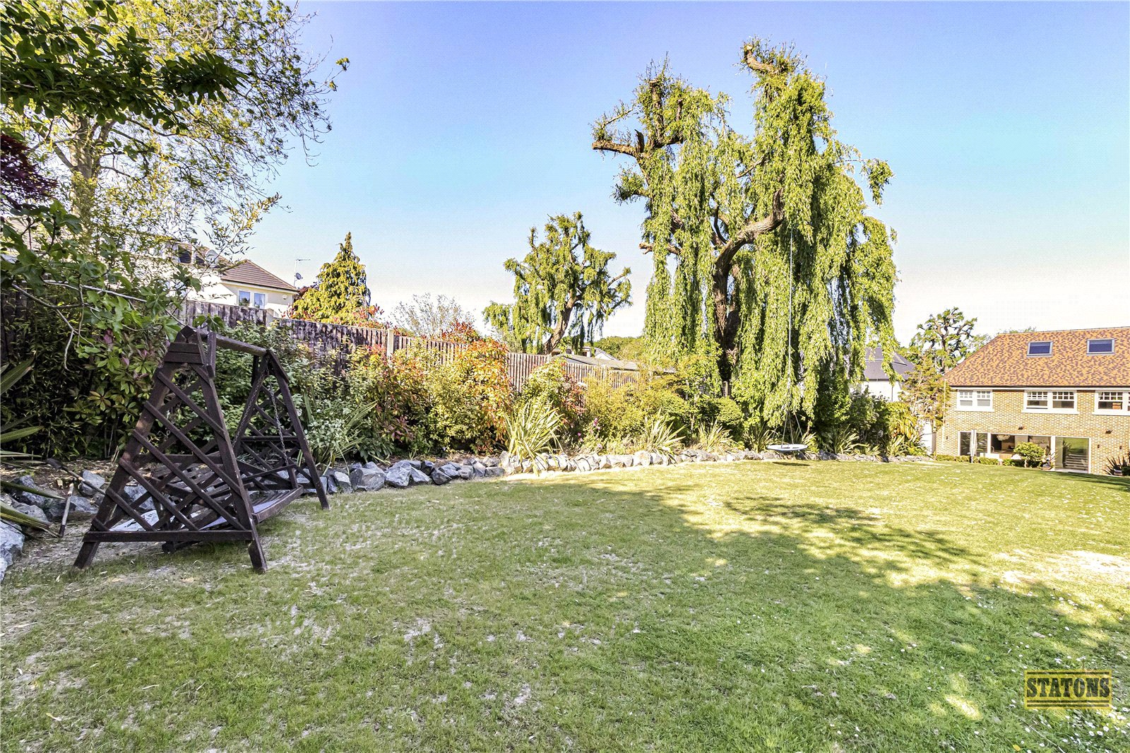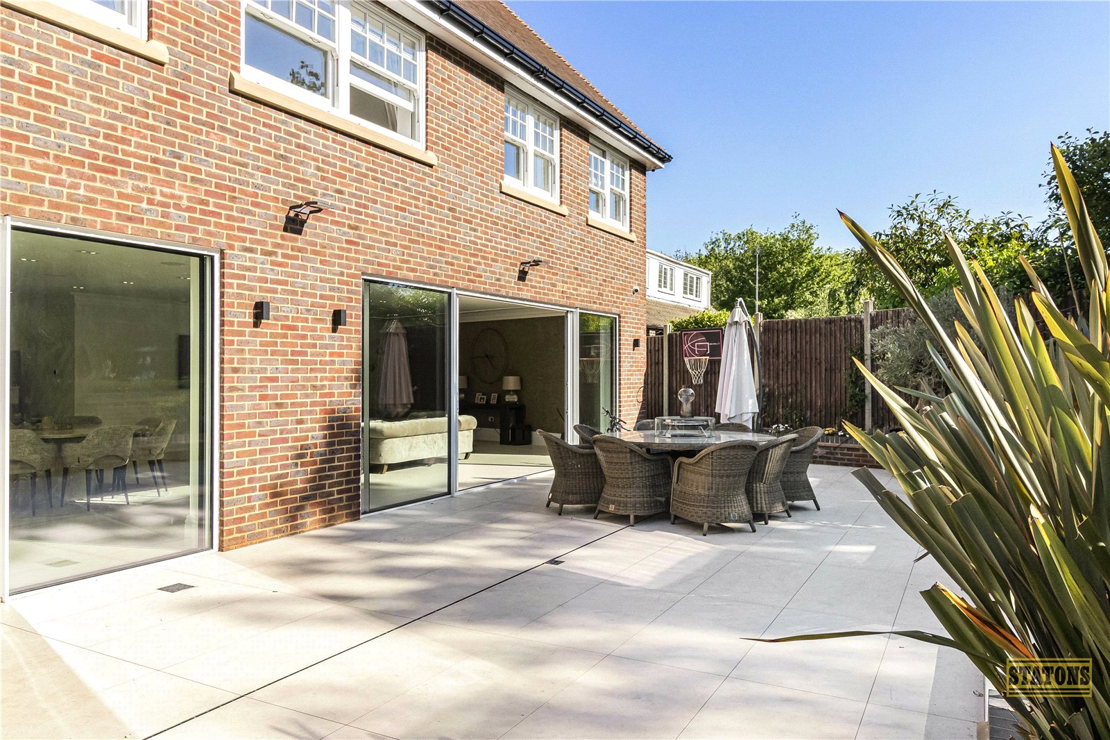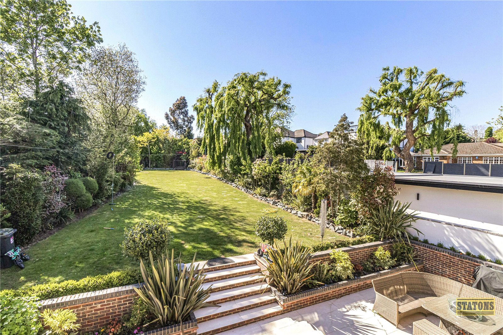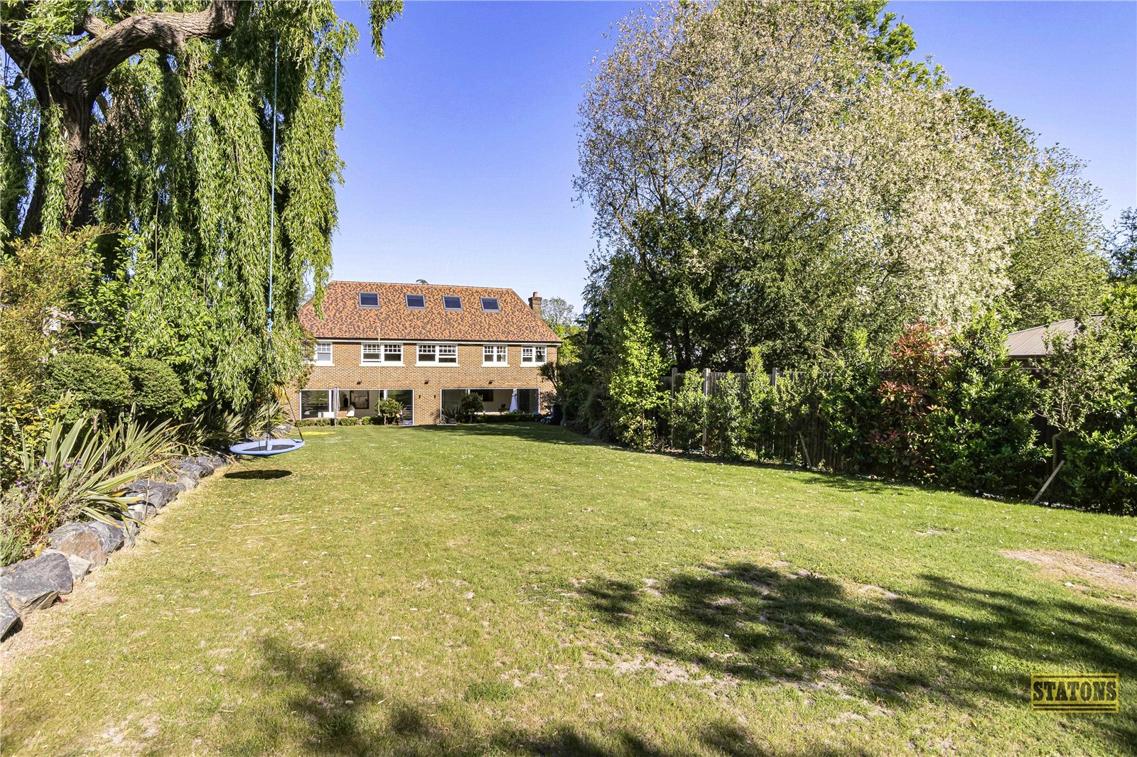 To the rear, the west-facing garden is an entertainer’s paradise. A spacious terrace sets the scene for al fresco dining, while sweeping steps descend to a manicured lawn bordered by mature trees and lush planting.