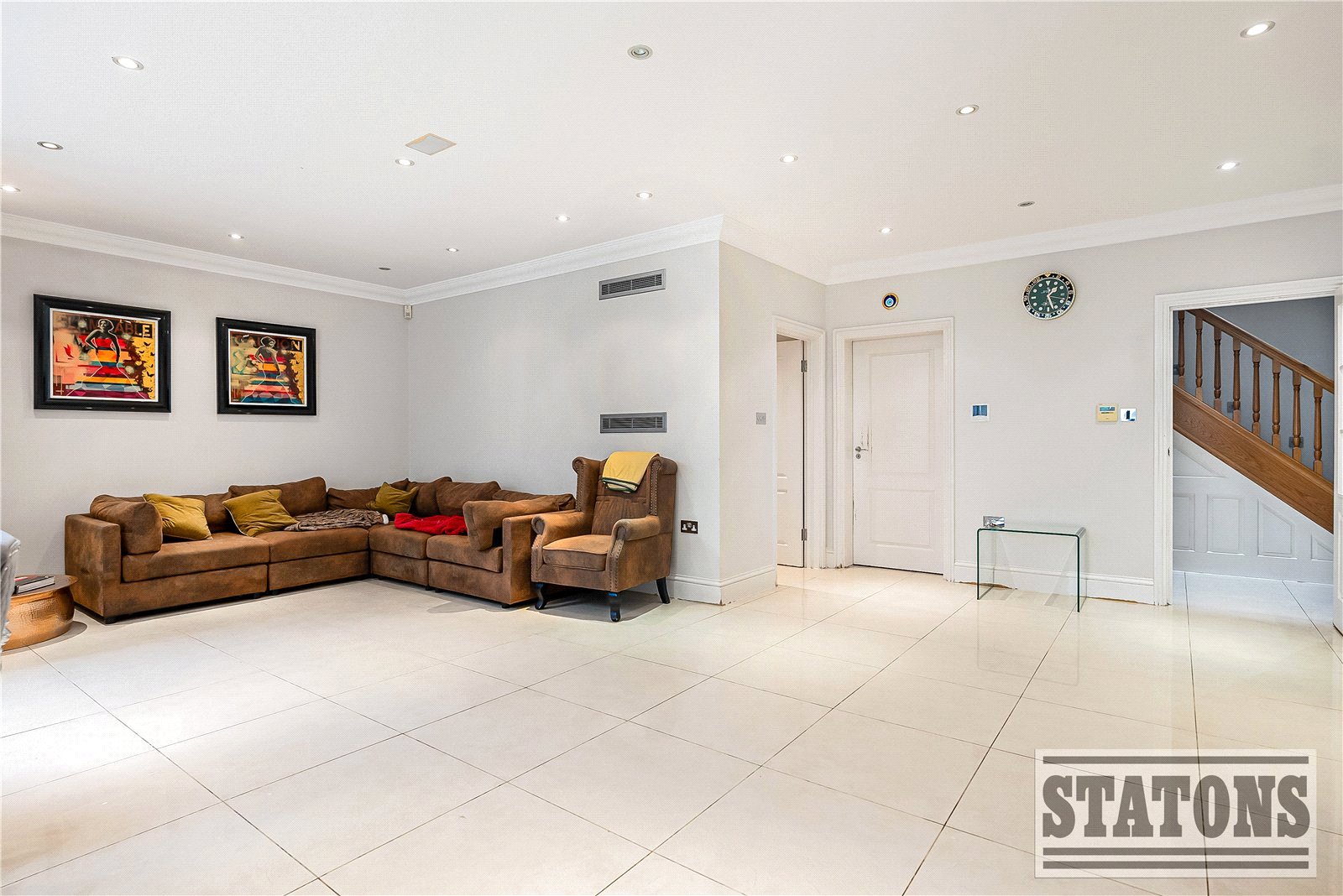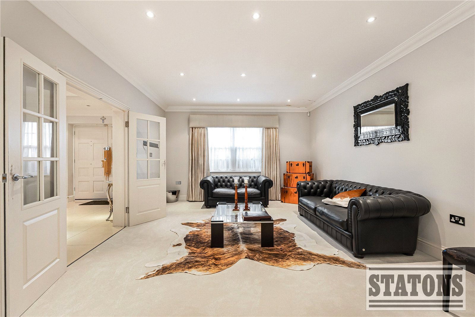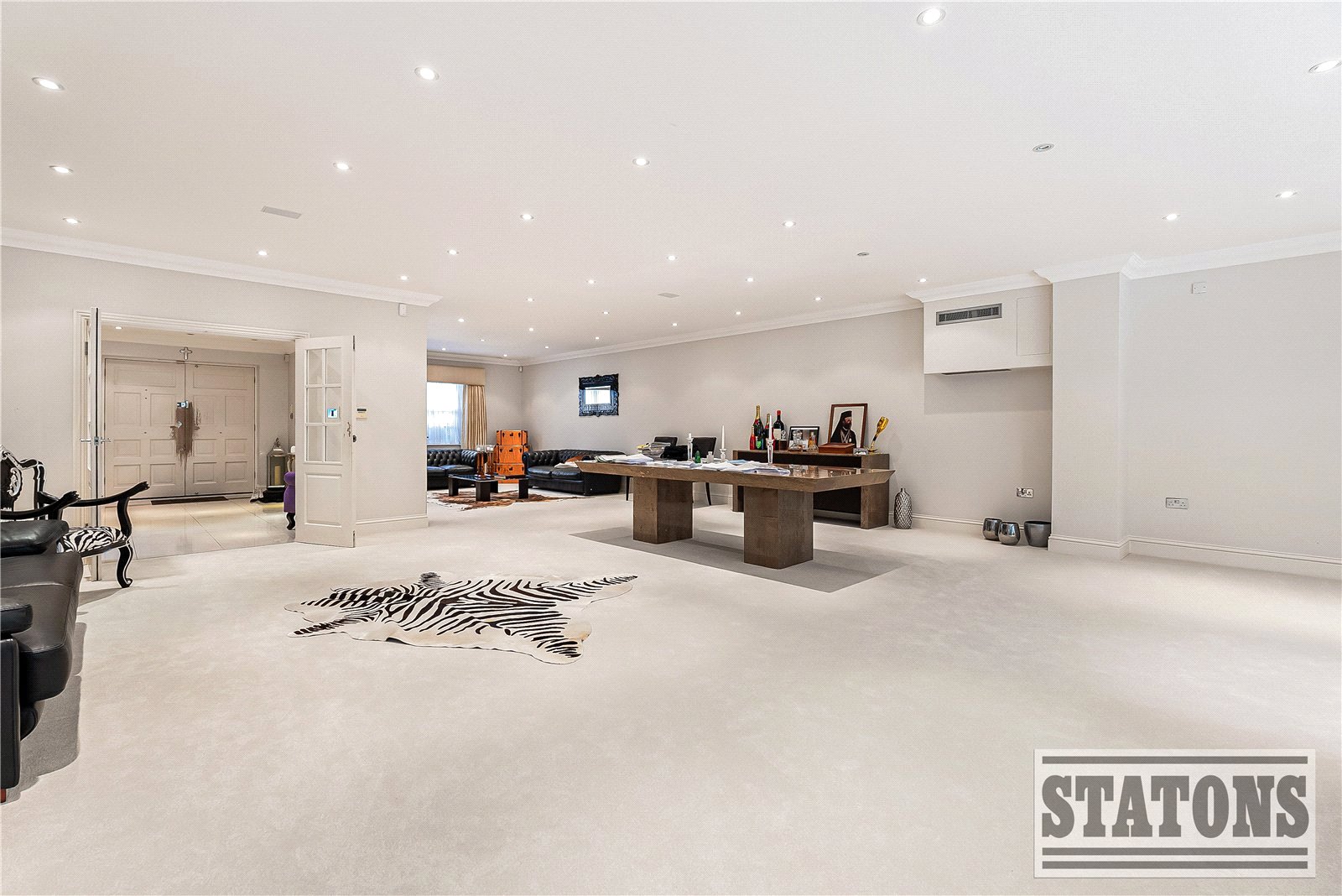 A grand entrance door opens into an impressive reception hallway, immediately showcasing the home’s scale and elegance. Two refined formal reception rooms unfold from here, currently arranged as an opulent open-plan lounge/dining area and an elegant TV room, both opening onto the rear terrace, allowing a seamless connection between indoor and outdoor living.