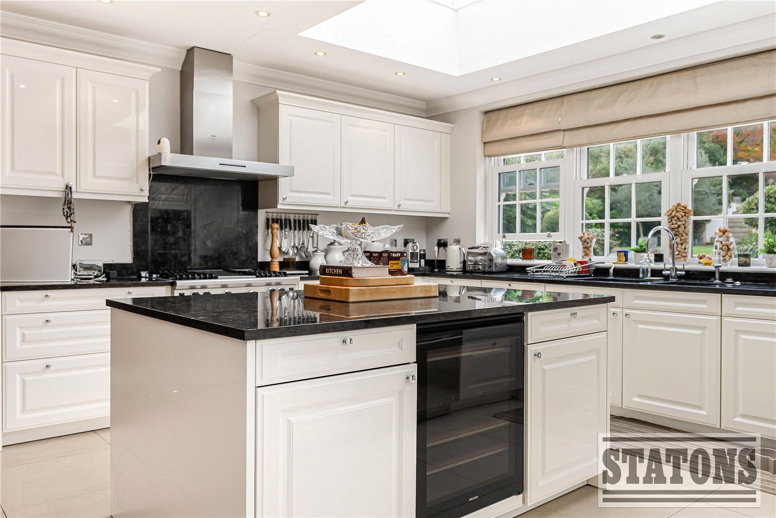 Double doors lead to the showpiece kitchen super room, appointed with bespoke Poggenpohl cabinetry, sleek contemporary worktops, and a full suite of integrated Miele, Wolf, and Sub-Zero appliances. A spacious utility room with internal garage access and a guest cloakroom with adjoining WC complete the sophisticated and practical ground-floor layout.