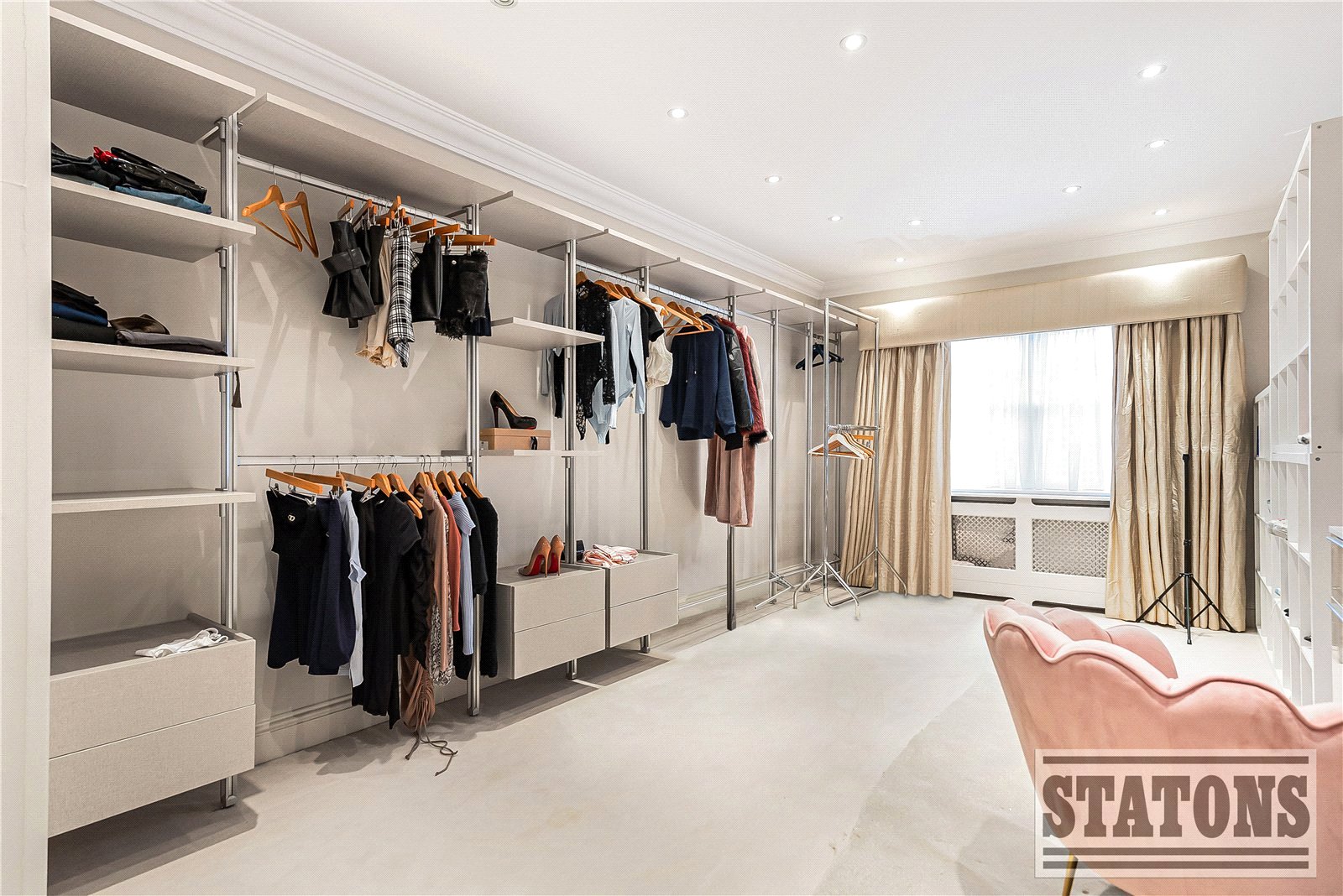 The first floor comprises four generously proportioned bedrooms, each with a luxurious en-suite bathroom and either bespoke fitted cabinetry or walk-in dressing rooms. The principal suite features an expansive dressing area and a sumptuous four-piece en-suite bath and shower. Additional suites include built-in wardrobes with en-suite showers, elegant Carrara marble finishes, and spacious walk-in dressing areas. A further room, currently a bespoke study, offers an ideal home office environment.
