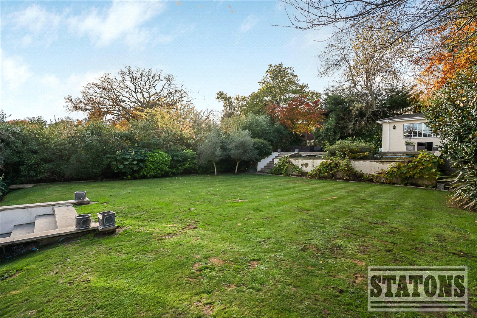 The west-facing rear garden is a true sanctuary, extending approximately 117 ft in depth and 63 ft at its widest. Directly adjoining Hadley Woods, it features a large principal terrace, a beautifully landscaped formal lawn, and an upper-level terrace with a substantial outbuilding, ideal for an outdoor kitchen, studio, or garden room.