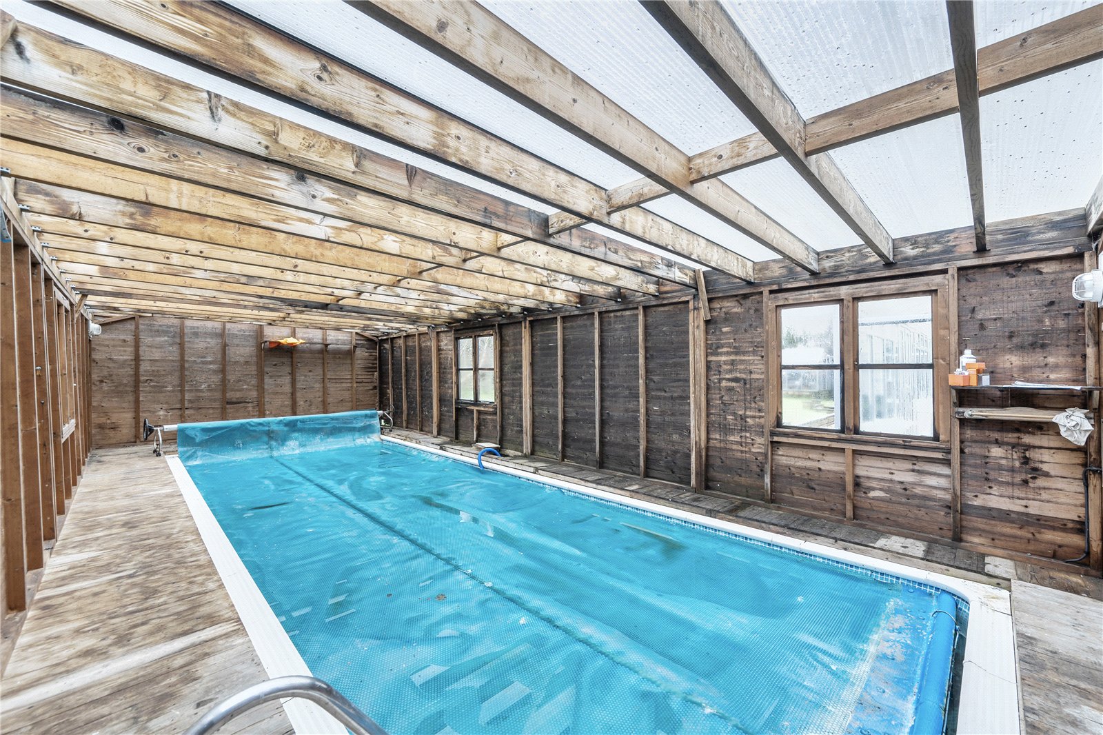 Outside, the wraparound gardens create a pleasing sense of privacy and openness. The swimming pool, while now requiring attention, offers the chance to reinstate a striking leisure feature or redesign the space entirely to suit modern outdoor living.