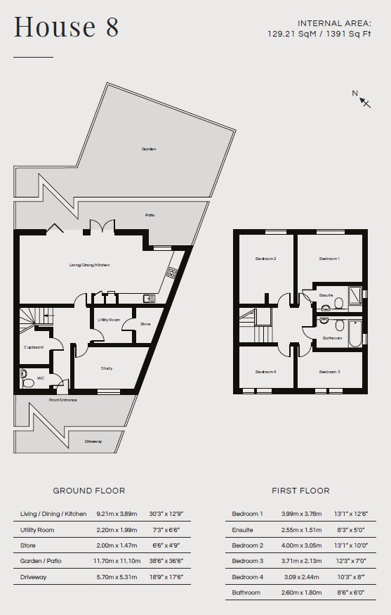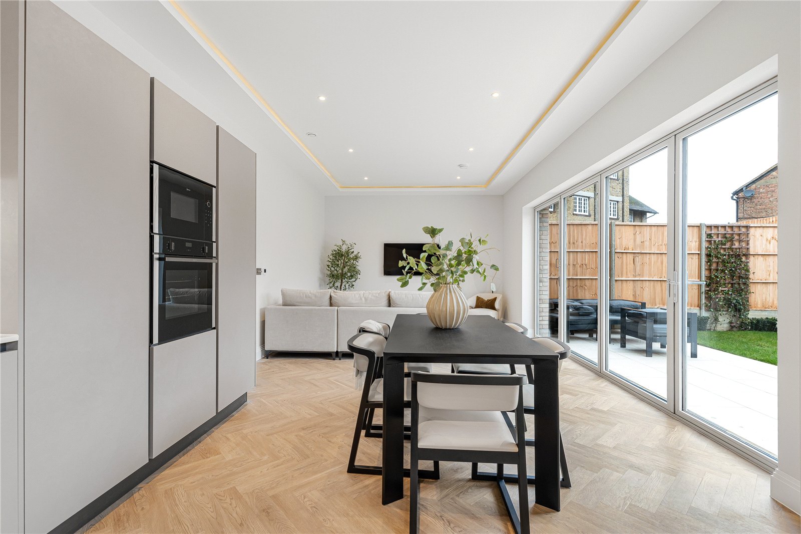 House 1 is a four bedroom house of approximately 1,391 sq ft, offering well-balanced living space across two floors. The ground floor features a fitted kitchen with integrated appliances, opening into a spacious open-plan dining and living area. Bi-fold doors provide access to the rear landscaped garden, creating a practical connection between indoor and outdoor space suited to both everyday living and entertaining.