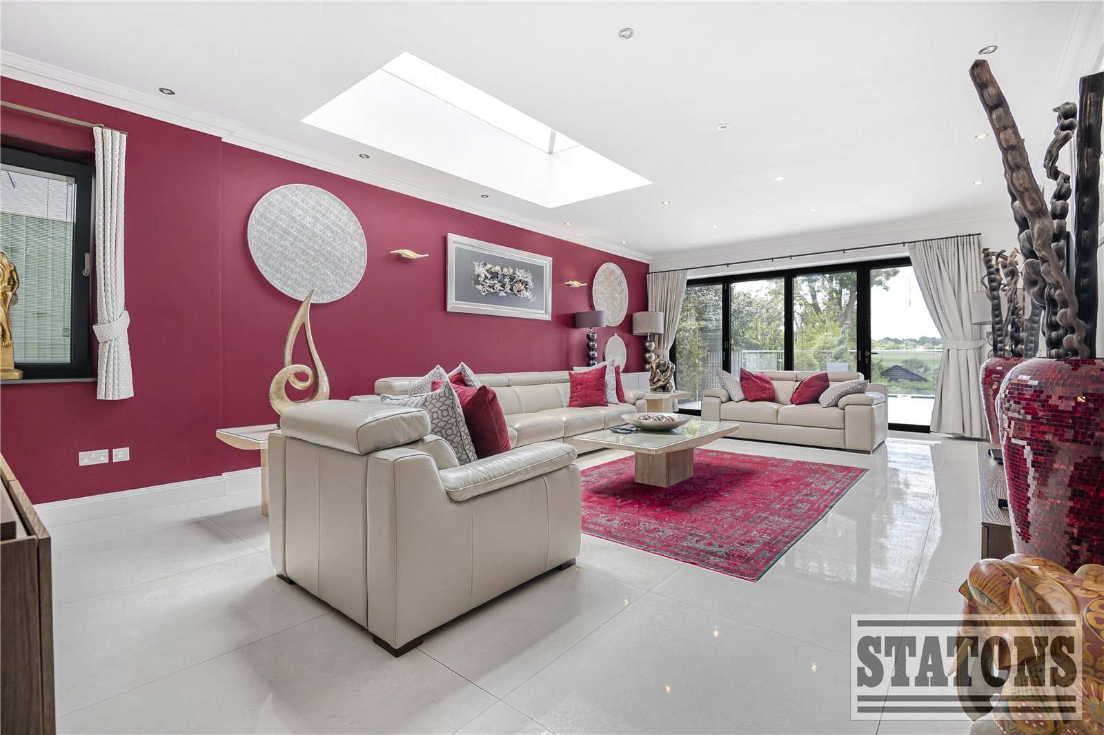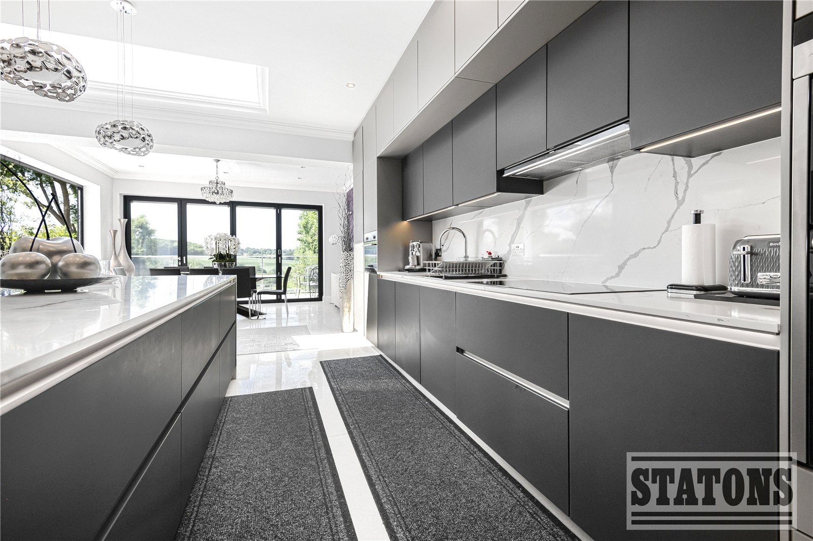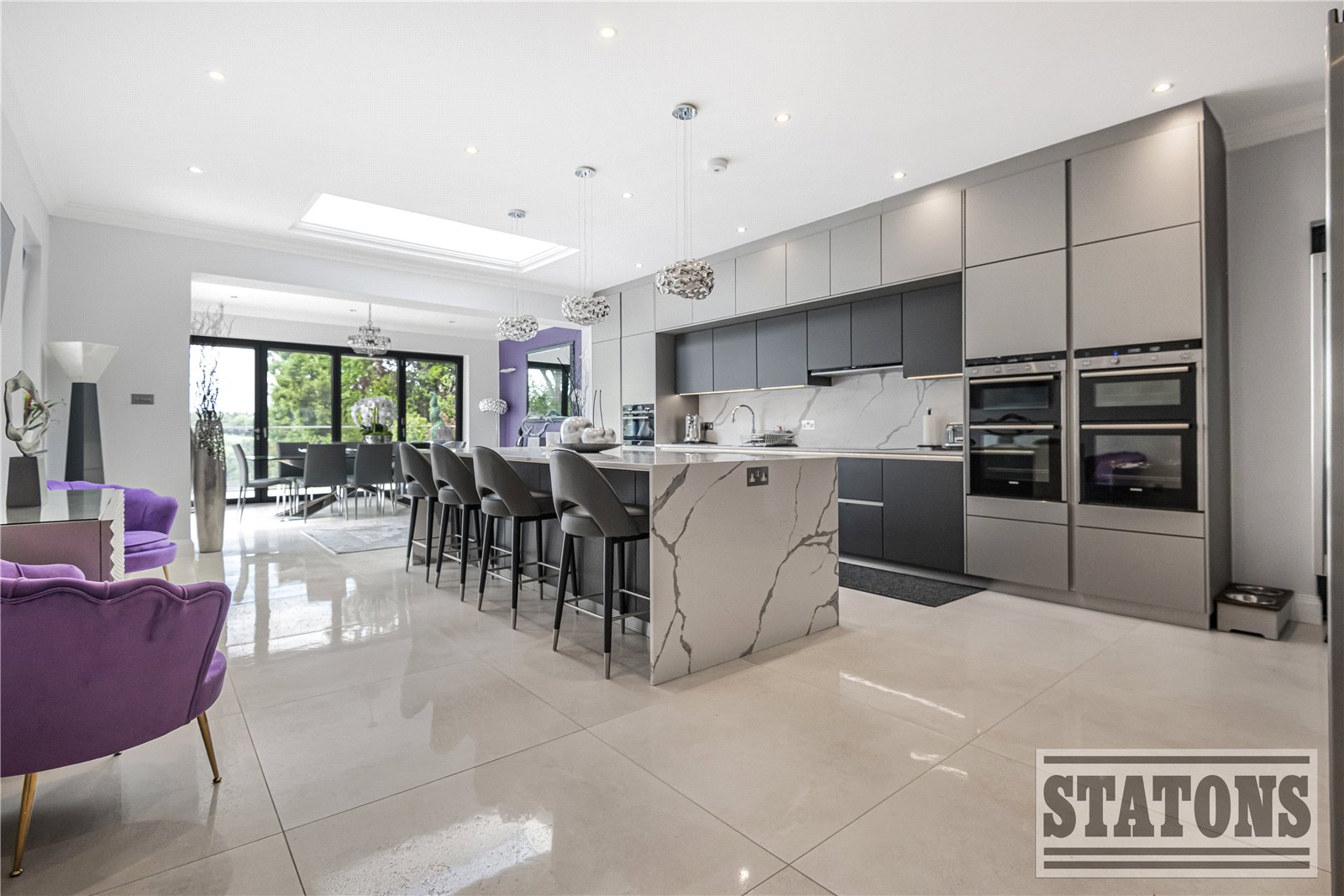 At the heart of the home lies a spectacular open-plan kitchen and dining area, where contemporary design meets everyday luxury. The bespoke, high-spec kitchen is fully equipped with premium integrated appliances, framed by a stunning floor-to-ceiling glazed wall that floods the space with natural light. Bi-folding doors open seamlessly to the sun-drenched patio and landscaped garden beyond—perfect for entertaining in effortless style.