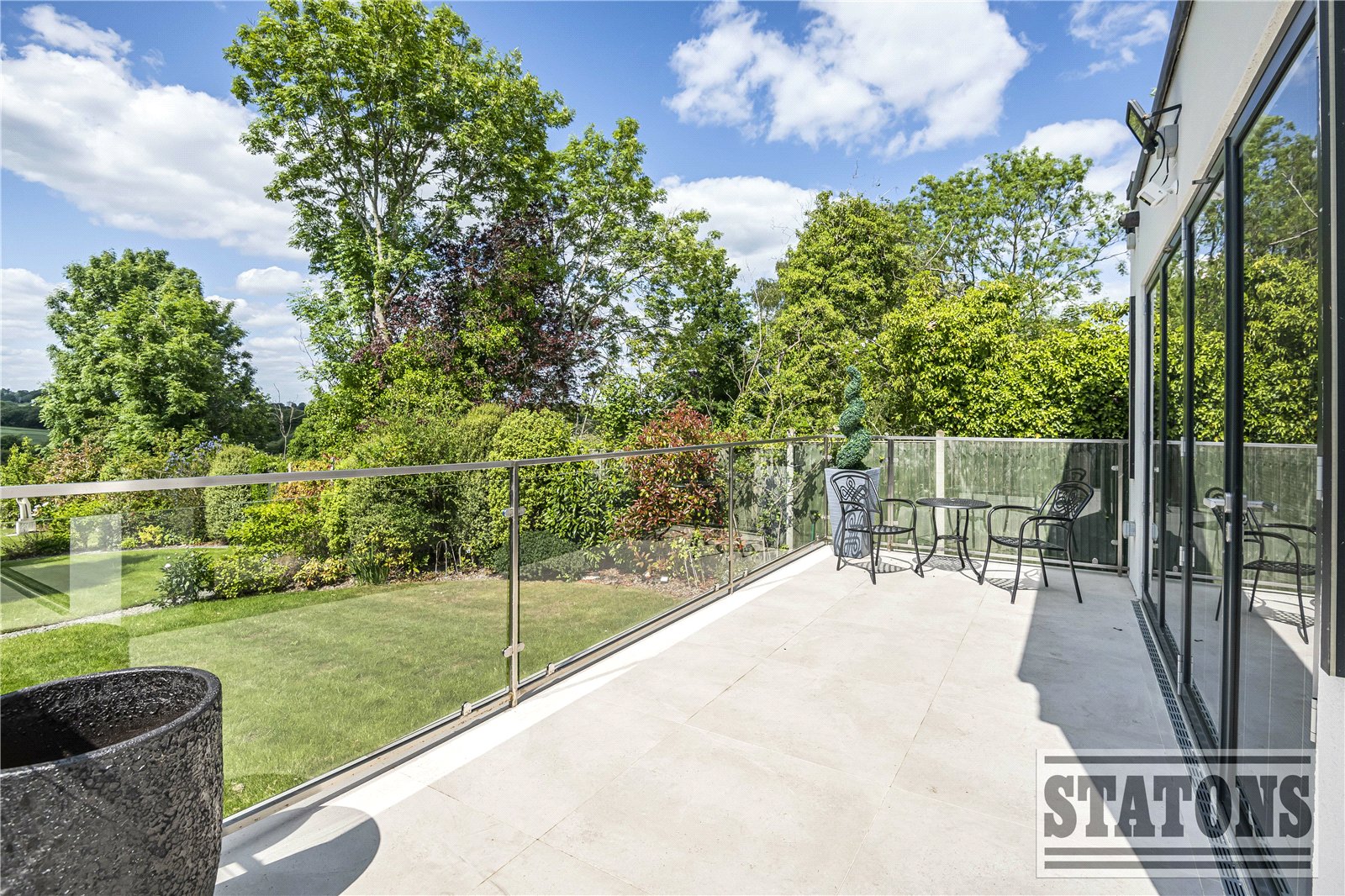 To the rear, a beautifully elevated glass-balustraded terrace creates a stunning alfresco living and dining area, cascading down to a thoughtfully landscaped garden. Manicured lawns, mature trees and shrubs, and winding pathways provide a sense of privacy and serenity—an idyllic setting for both entertaining and relaxation.