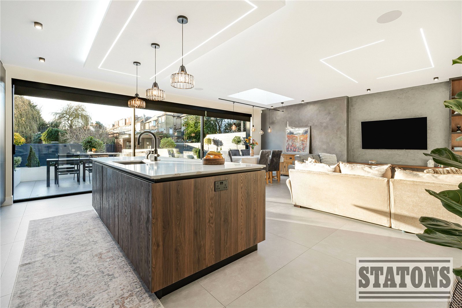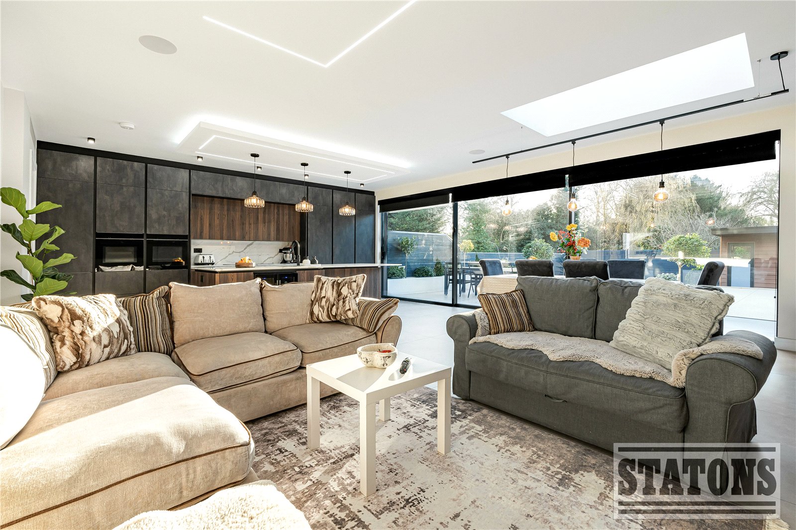 The ground floor features three separate reception rooms, providing superb versatility for family living, entertaining, or creating dedicated workspaces. A spectacular kitchen and dining room forms the heart of the home, beautifully appointed and opening directly onto the landscaped garden.