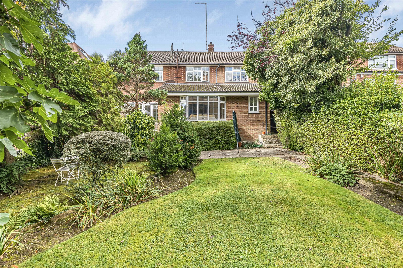 The rear garden has a large terrace and lawn with an array of mature plants and shrubs.