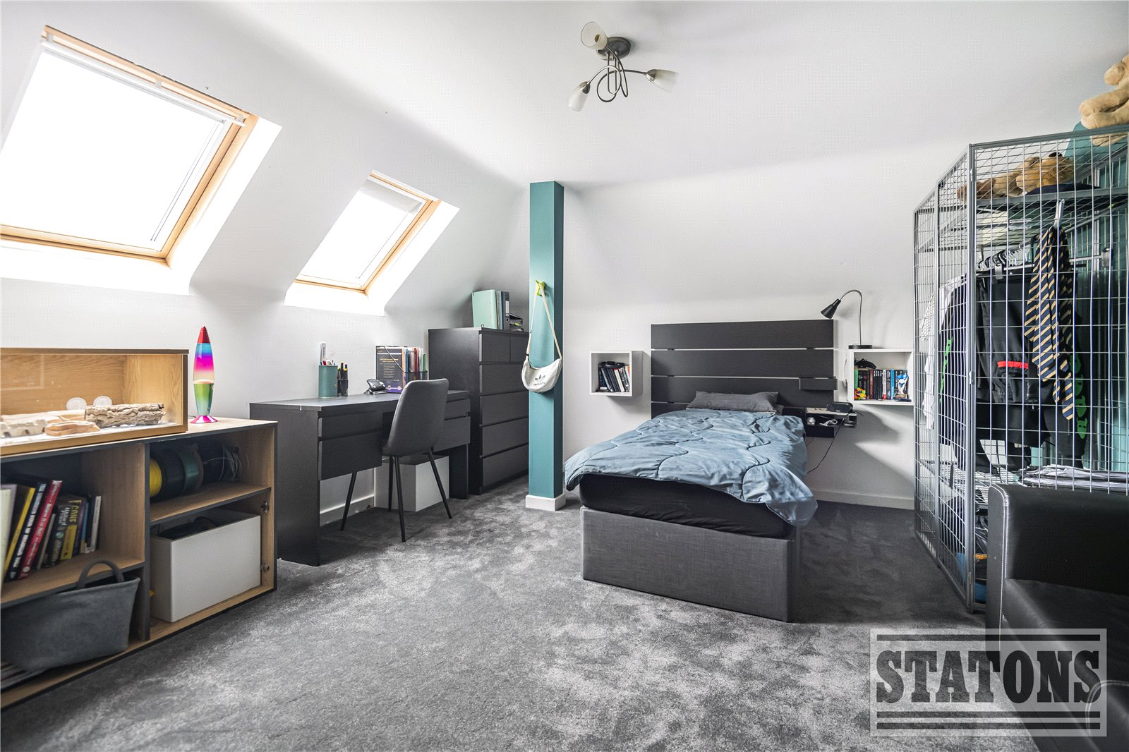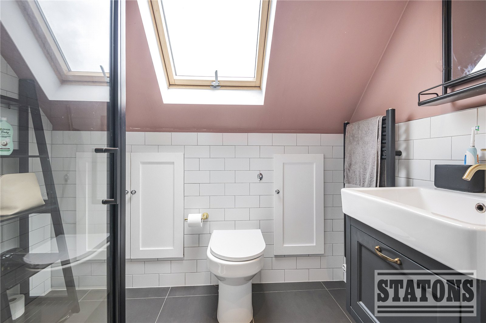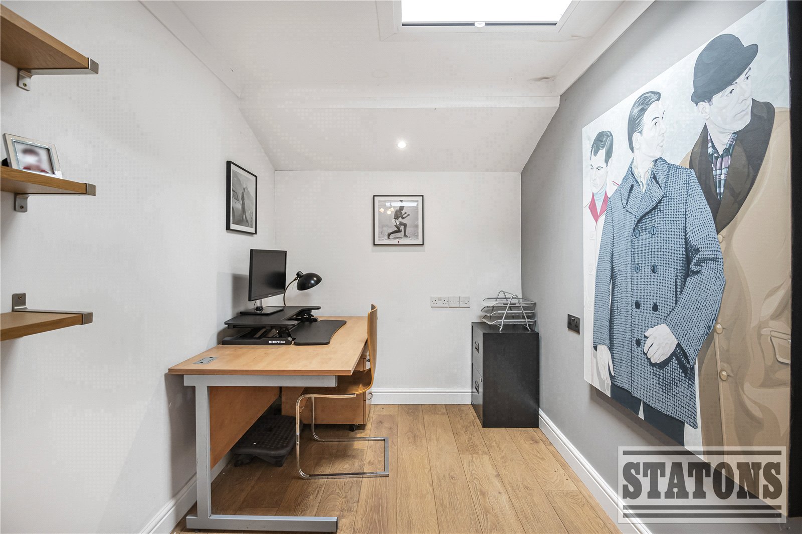 To the front, a large bay-fronted double bedroom offers plenty of natural light, while a second downstairs room (currently used as a home gym) has direct access to the garage. The garage is a bright space thanks to recently installed skylights and ideal for storage.