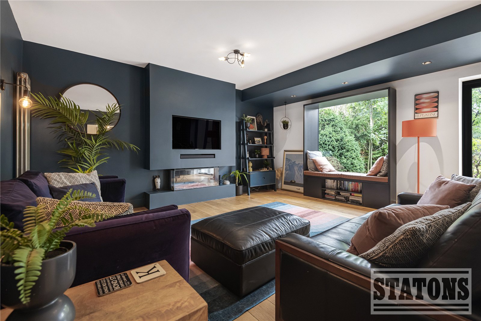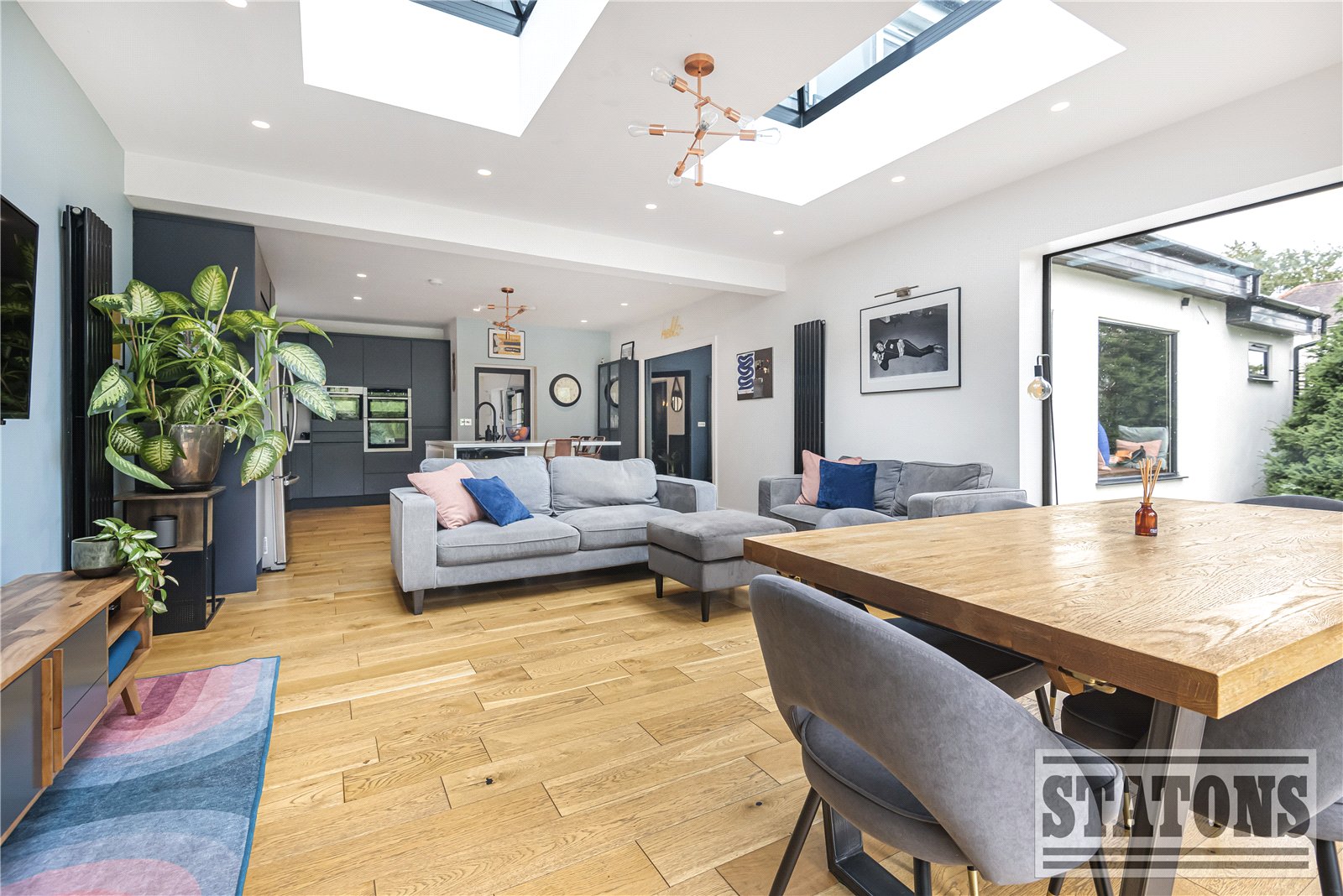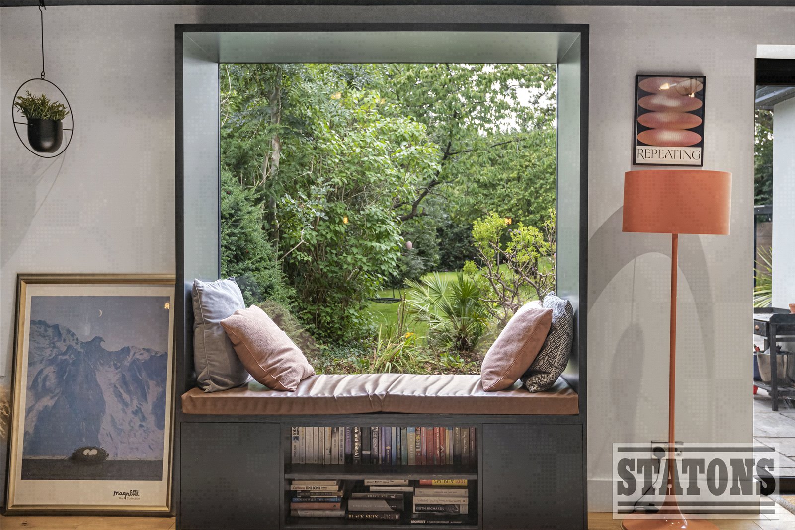 The kitchen features a copper splashback, dual ovens, drinks cooler and other integrated appliances. The extended kitchen is flooded with light from large roof lanterns and bi-folding doors and seamlessly connects to the well maintained large rear garden. The kitchen and lounge have solid oak flooring and are separated by a pocket sliding door. The large lounge has a feature fireplace and designer picture window seat overlooking the garden.