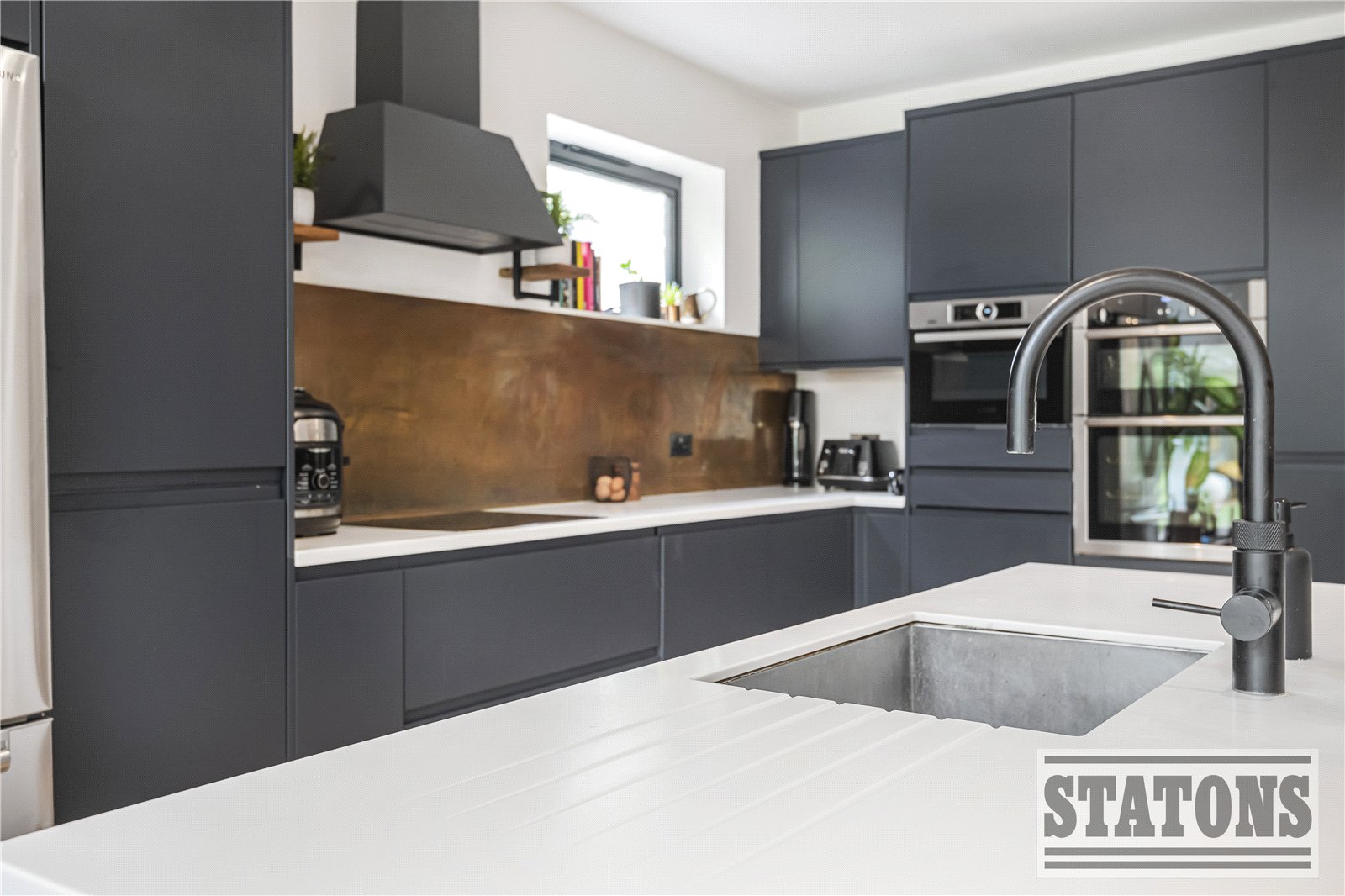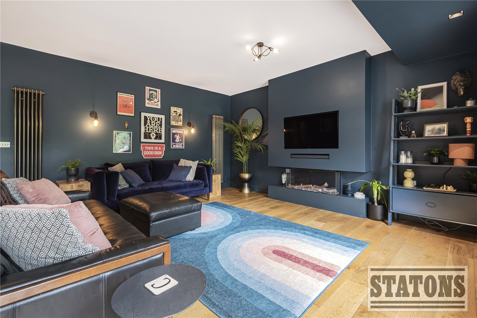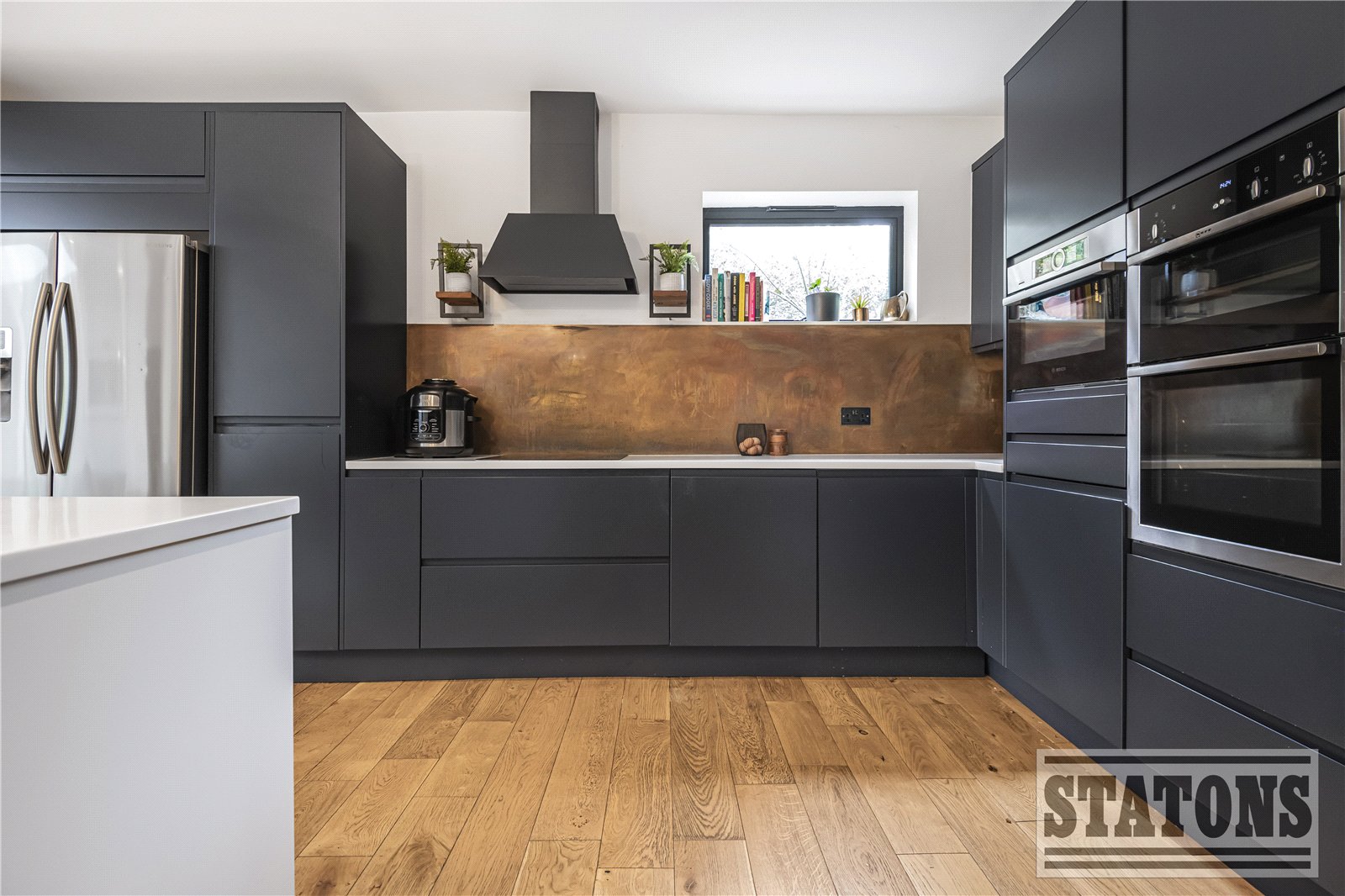 The kitchen features a copper splashback, dual ovens, drinks cooler and other integrated appliances. The extended kitchen is flooded with light from large roof lanterns and bi-folding doors and seamlessly connects to the well maintained large rear garden. The kitchen and lounge have solid oak flooring and are separated by a pocket sliding door. The large lounge has a feature fireplace and designer picture window seat overlooking the garden.