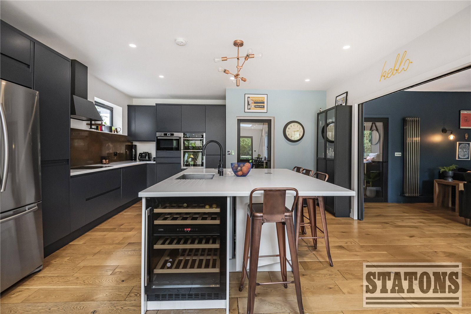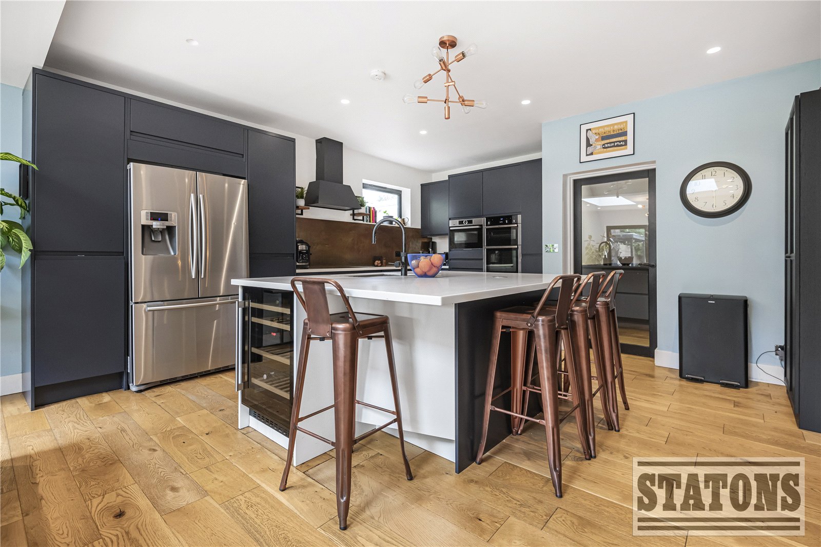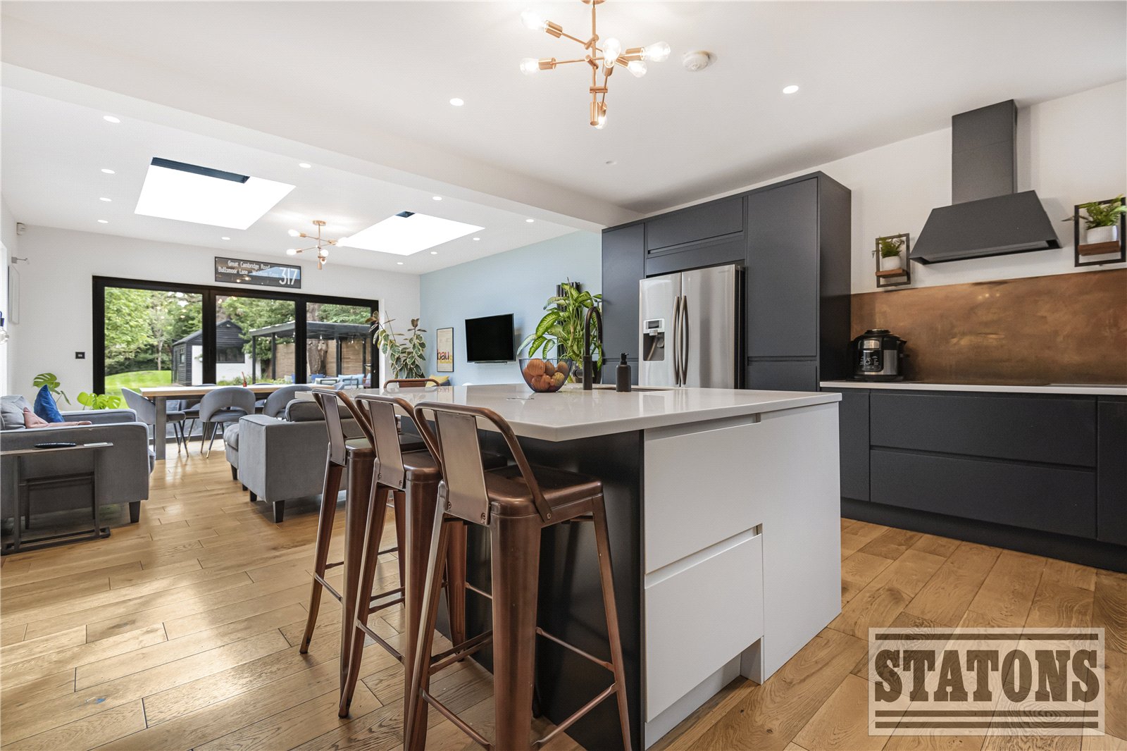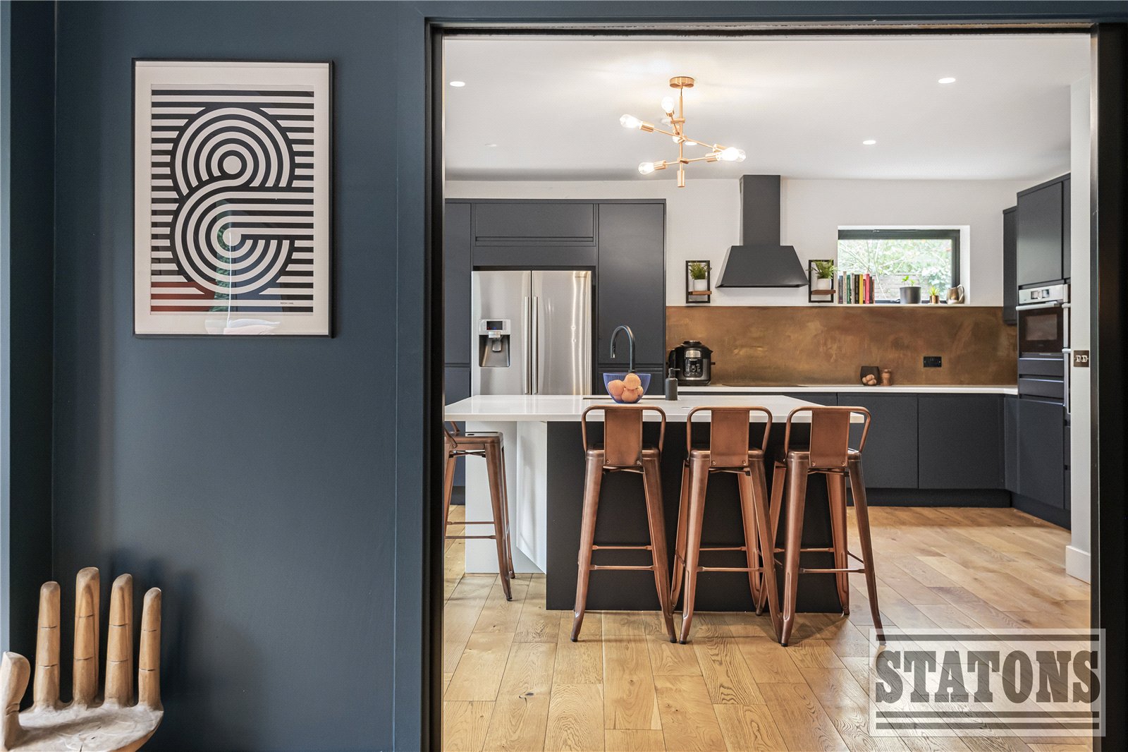 These rooms are served by a stylish downstairs family bathroom and a separate guest WC. A second reception large hallway leads into the impressive open plan kitchen/dining room, featuring a Corian central island with seating.