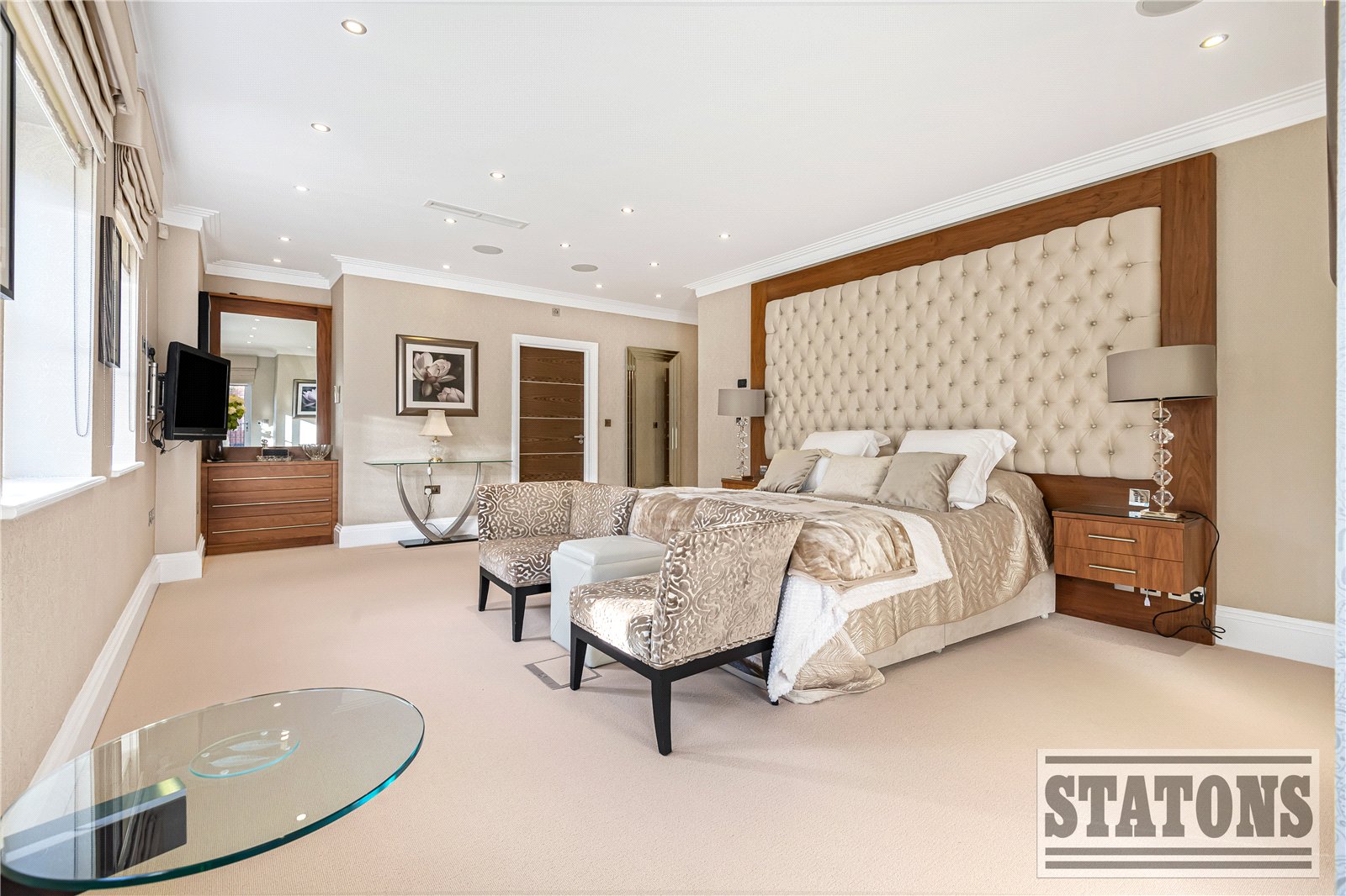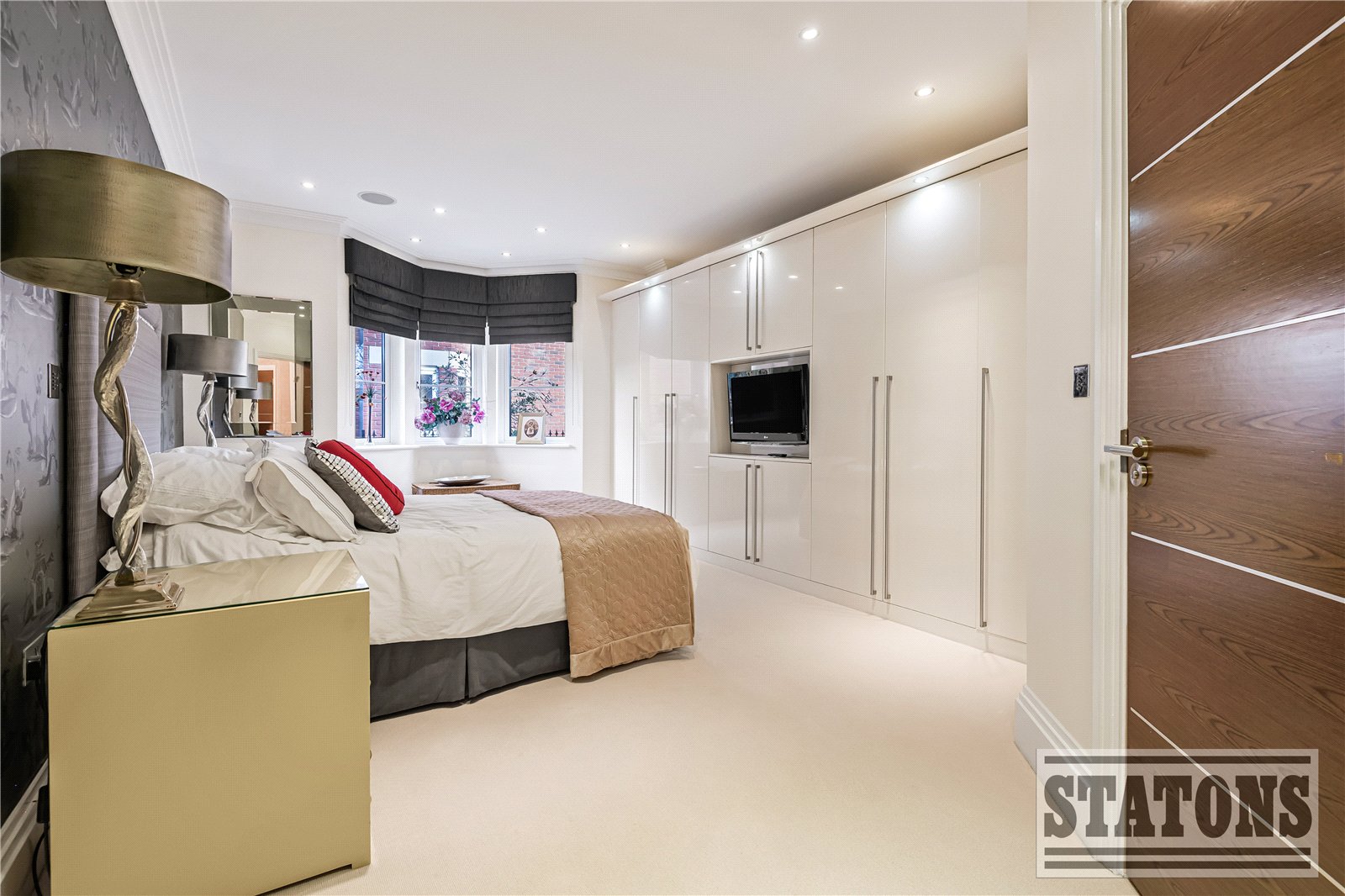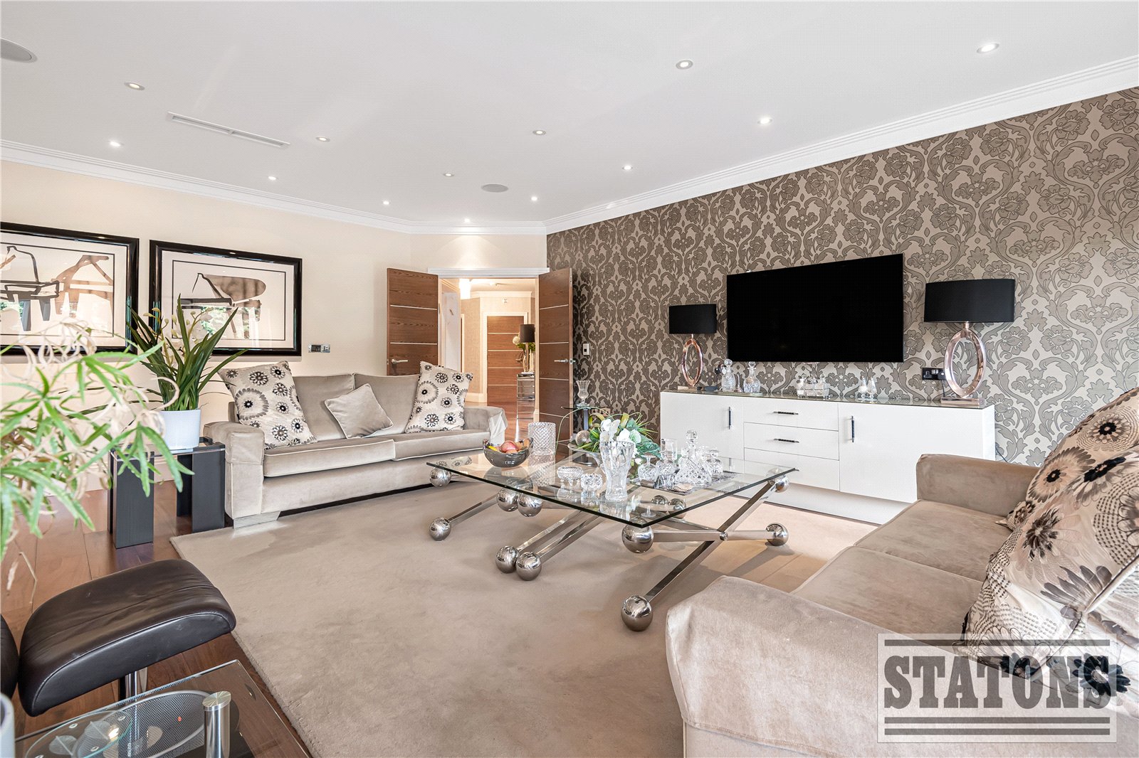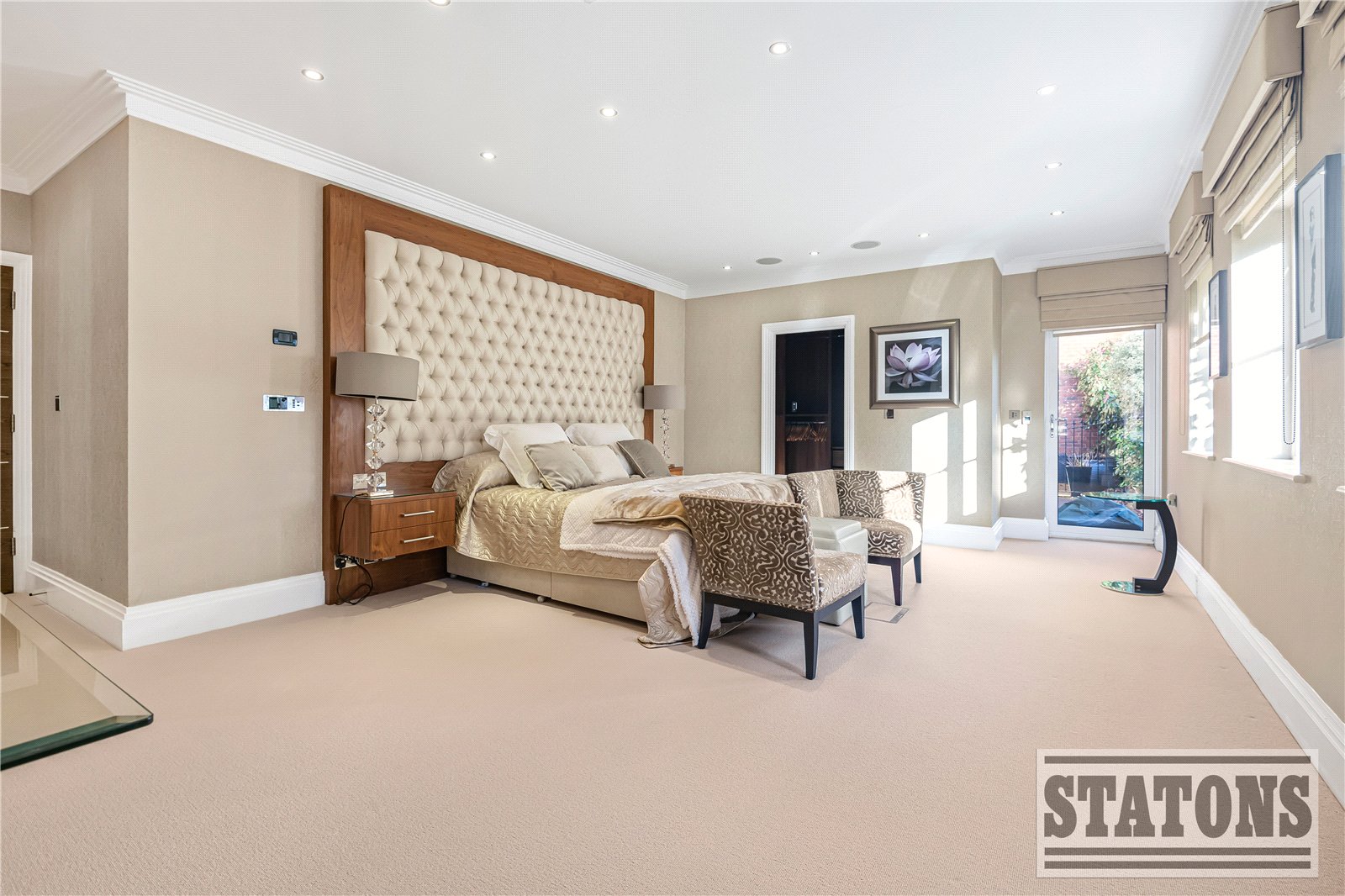 The principal suite is a sanctuary of calm, featuring direct access to a private balcony, a beautifully designed dressing room, and a luxurious five-piece en-suite bathroom finished to an exceptional standard. The second bedroom also enjoys its own en-suite, while the third bedroom currently arranged as a sophisticated study offers flexibility for guests or home working. A stylish guest WC and an impressive utility room further enhance practicality without compromising on design.