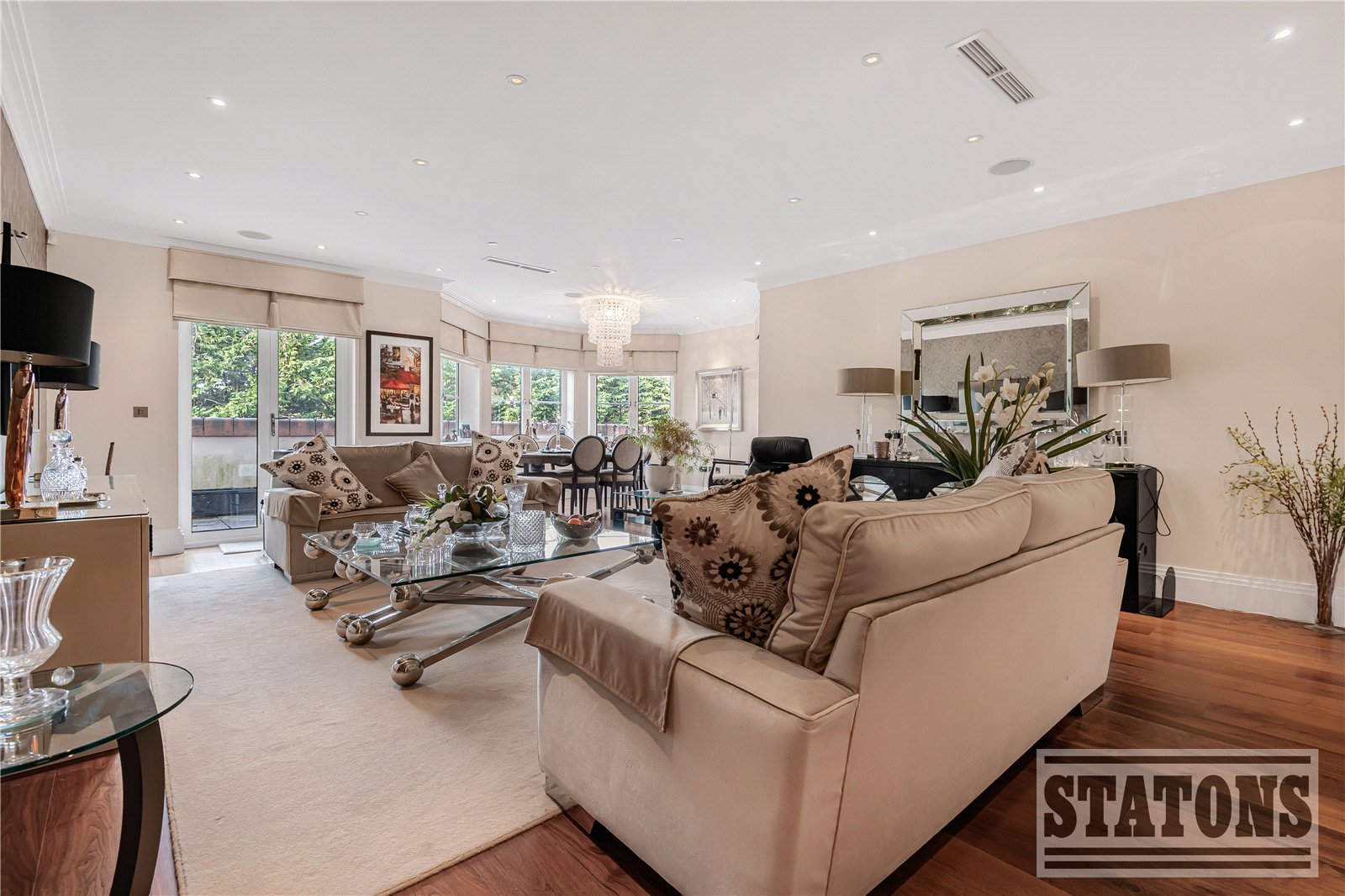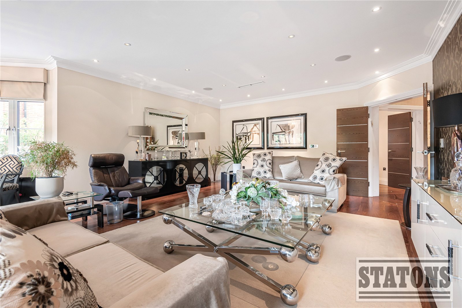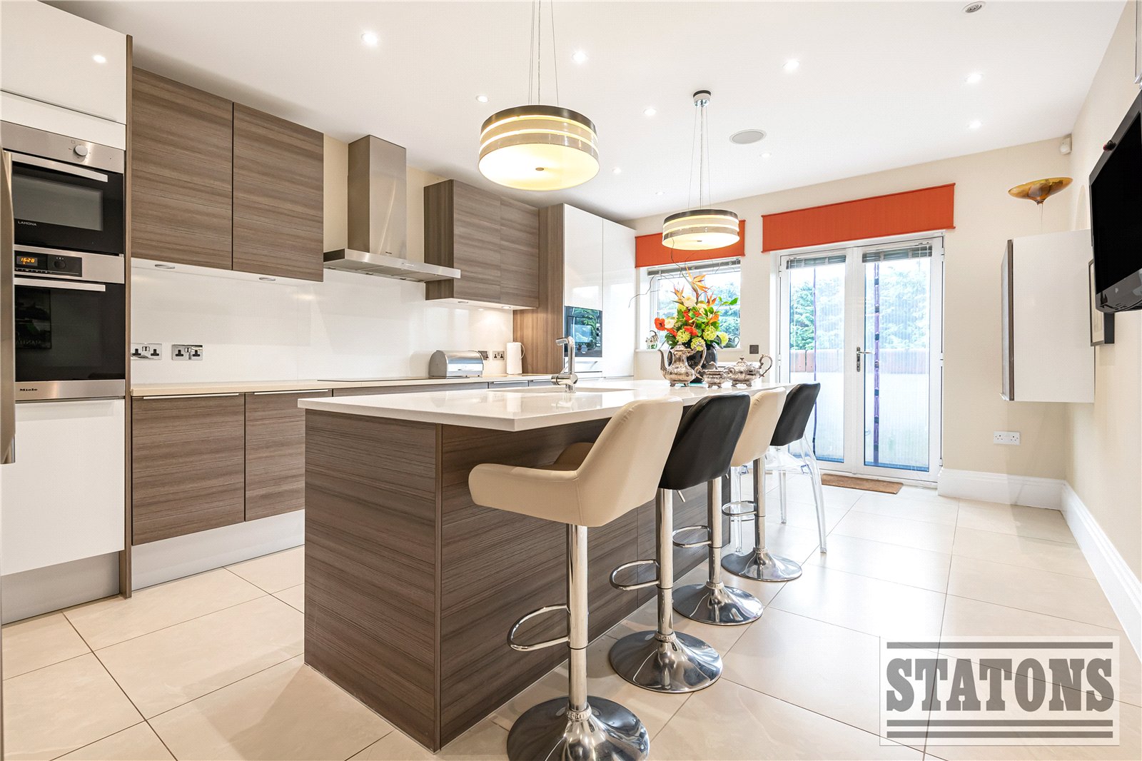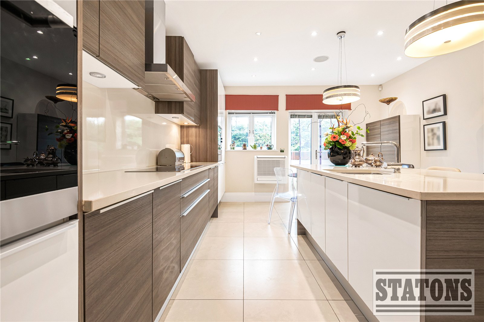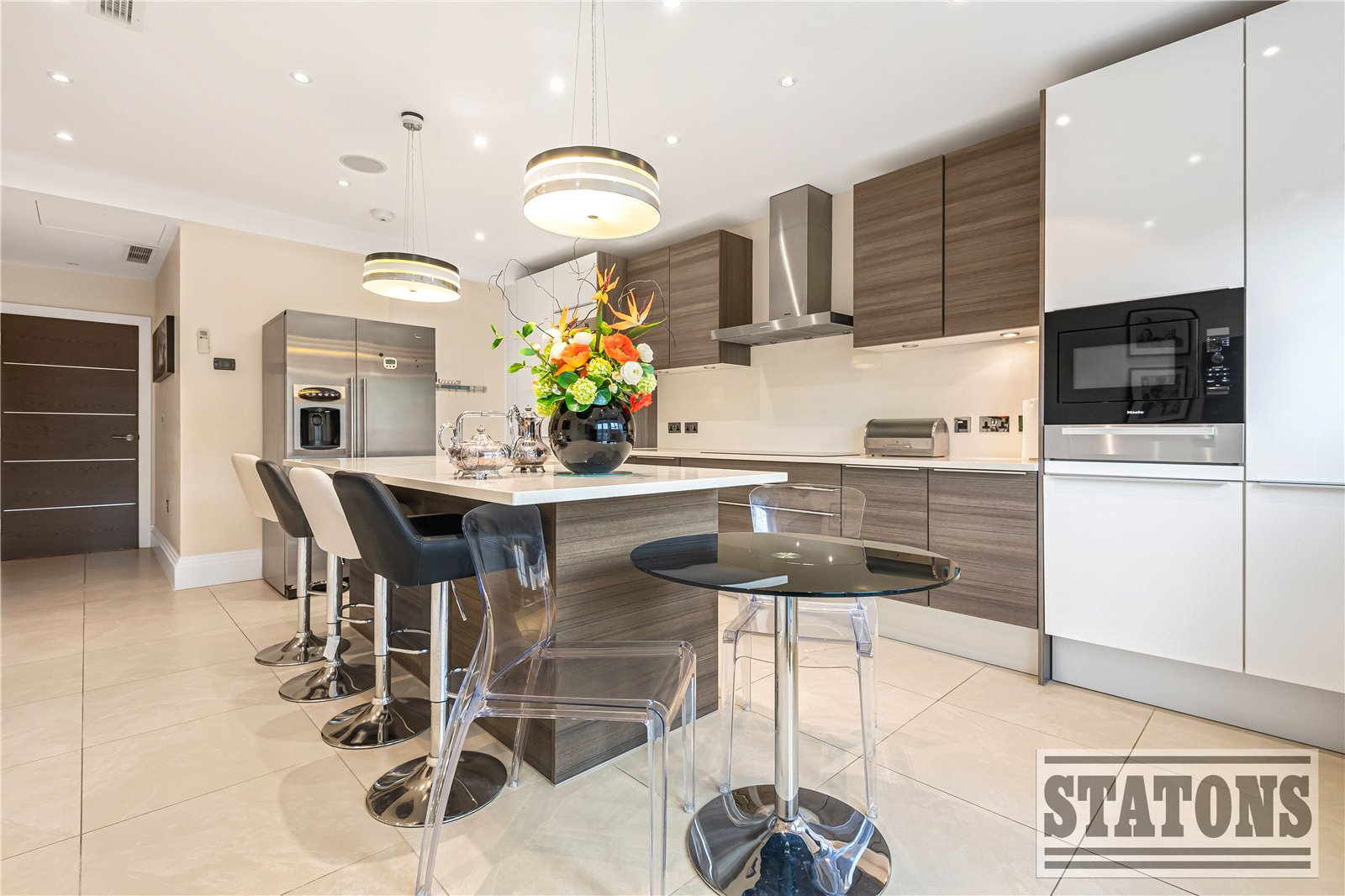 A grand entrance hall sets the tone, leading through to a stunning reception and dining space bathed in natural light. Floor-to-ceiling doors open onto a generous west-facing terrace, providing the perfect setting for elegant entertaining or tranquil sunset evenings. The bespoke Poggenpohl kitchen is a true statement of quality, fully equipped with premium Miele integrated appliances, including fridge freezers, oven and microwave oven and a dishwasher. Double doors extend the space onto a private terrace, seamlessly blending indoor and outdoor living.