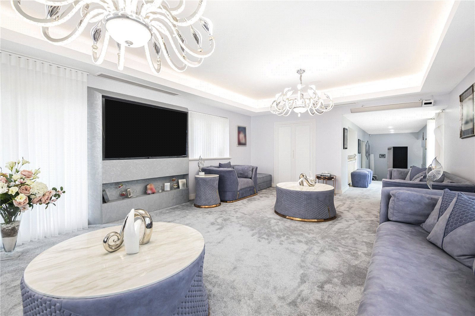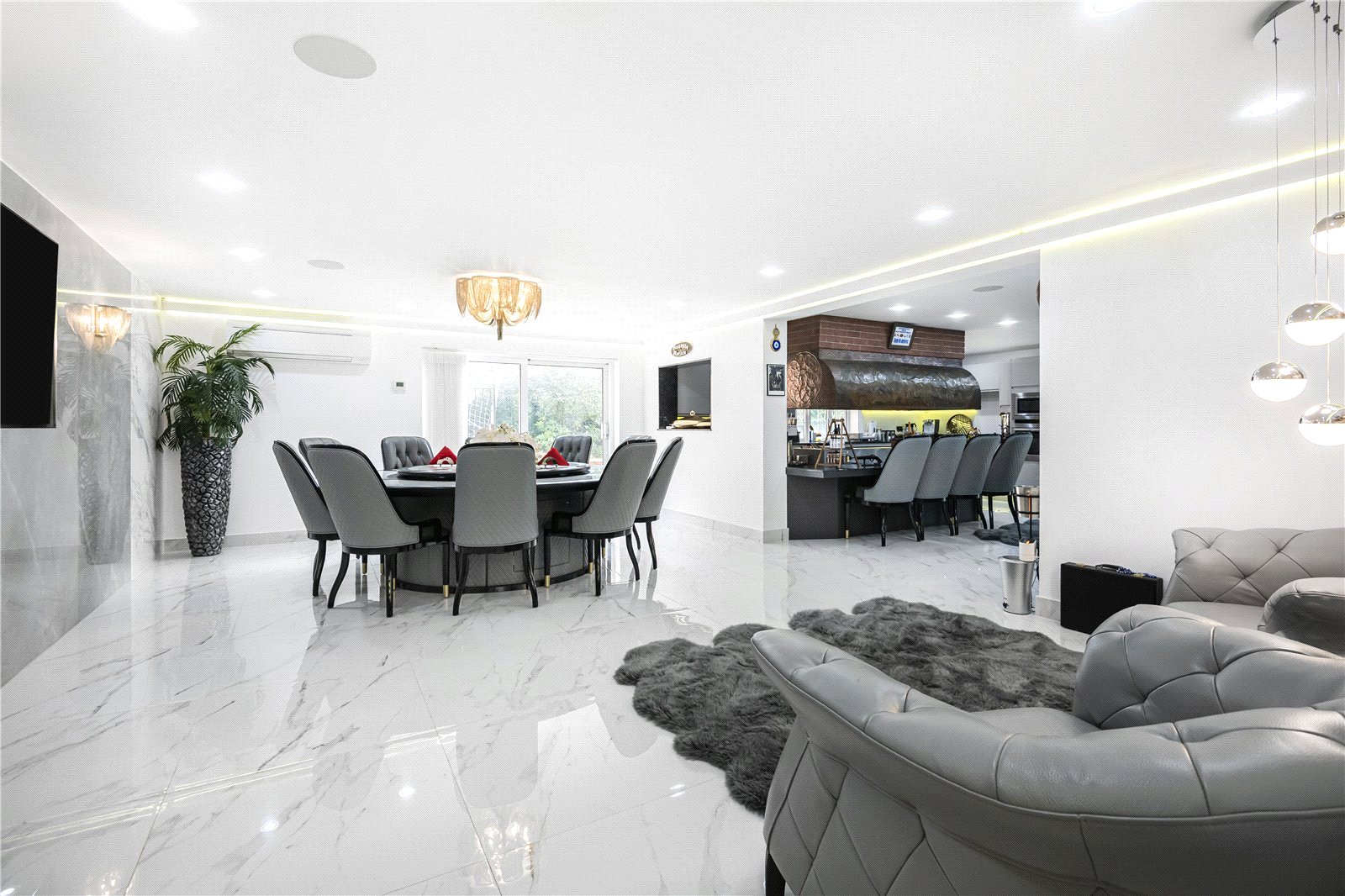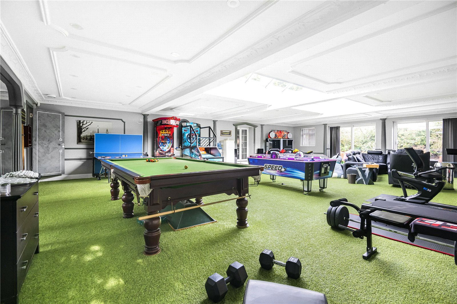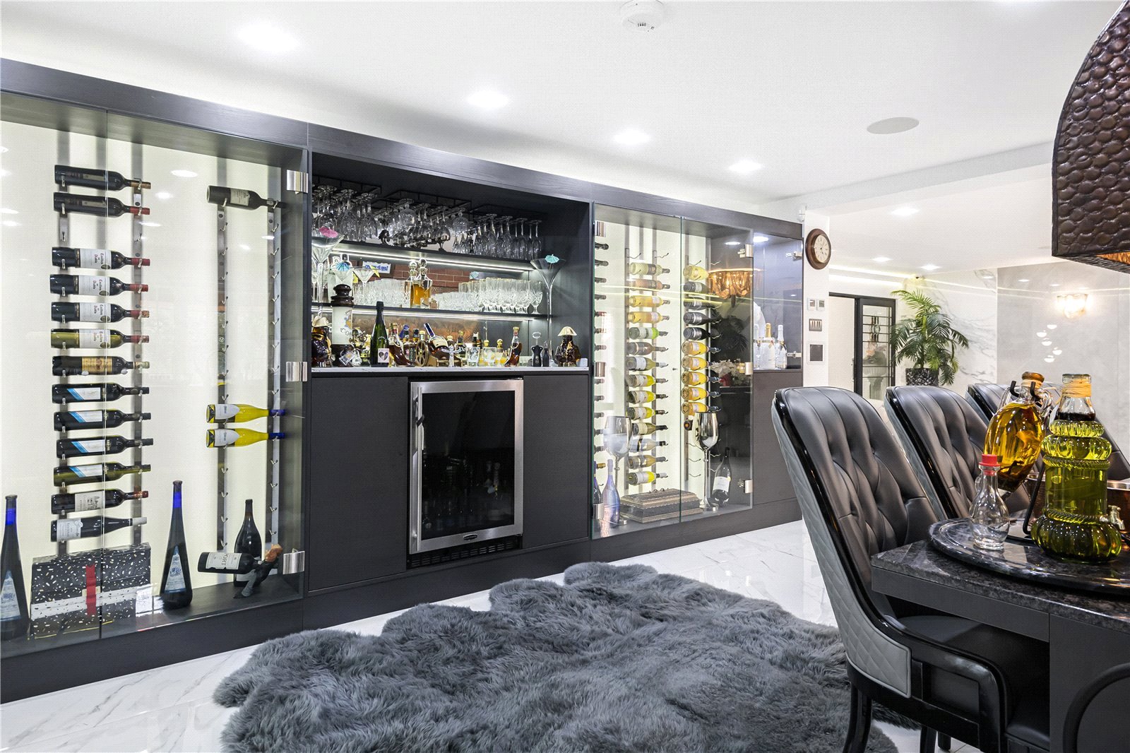 A staircase leads down to the ultimate entertaining space with dining area that leads to an indoor kitchen / BBQ with a feature glazed wine store. Double doors lead into a games / leisure suite which used to have an Indoor pool which could be reinstated.