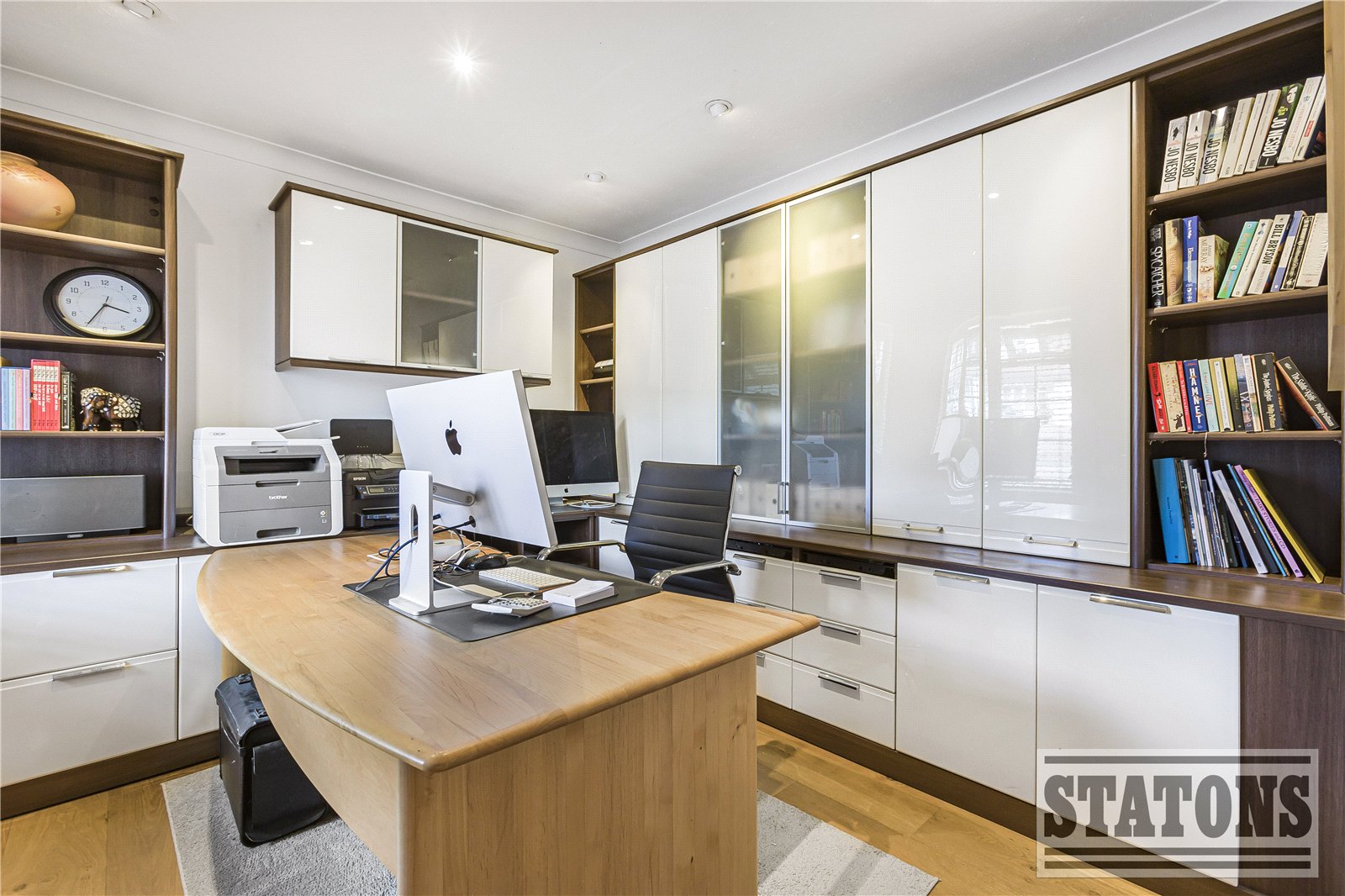 Upon entering, you are welcomed by a spacious hallway, complete with a contemporary downstairs W/C. To the left, a well-appointed study with fitted office furniture provides the ideal space for working from home.