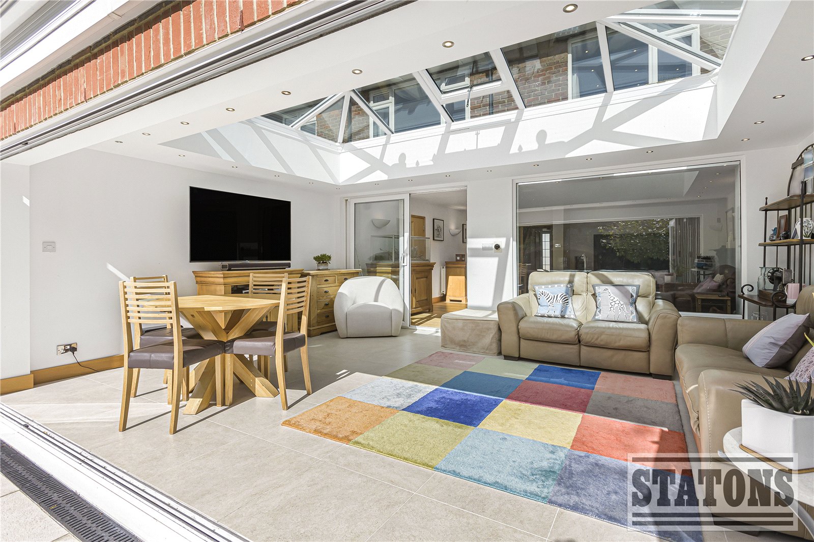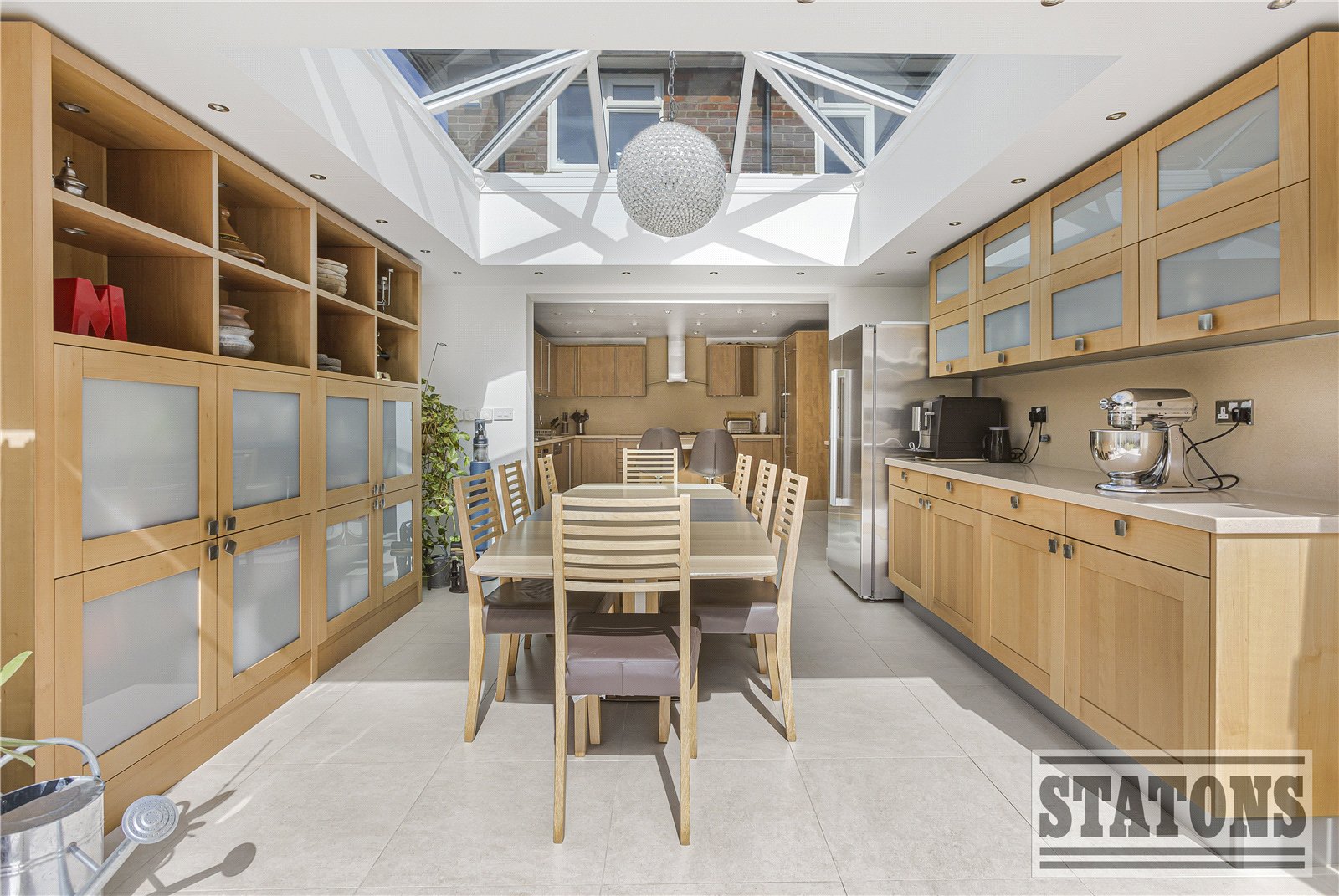 A full-width rear extension has created an exceptional downstairs living space, illuminated by two gigantic sky lanterns, giving the area a bright, airy feel. Additional conveniences include a utility room, integral garage with electric door.