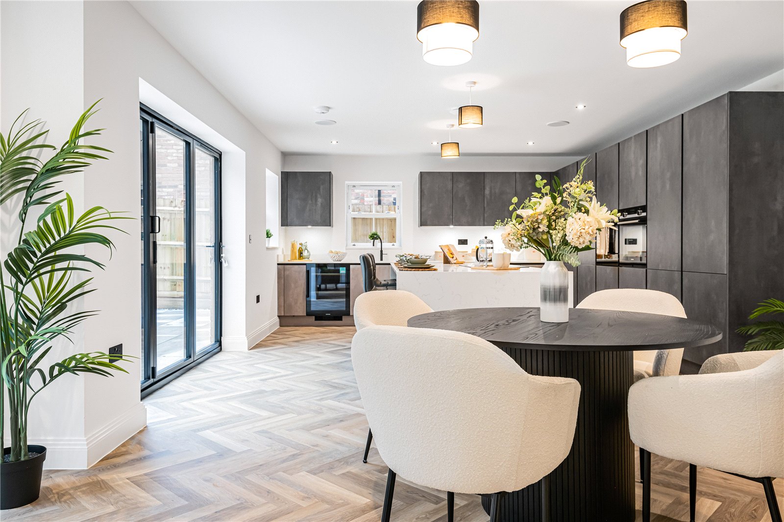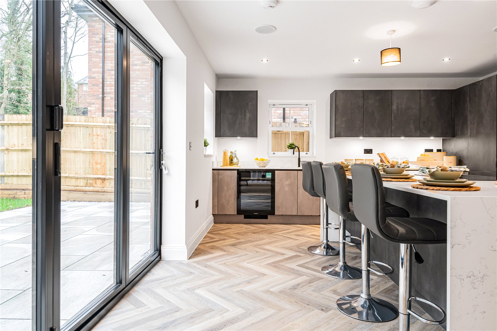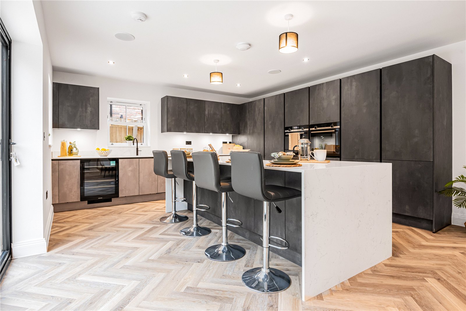 The kitchen boasts a sleek, modern design with handless cabinetry, quartz worktops, and a full range of premium integrated appliances including a double oven with microwave, induction hob with extractor, full-length fridge and separate freezer, dishwasher, wine cooler, and a hot water Quooker tap.