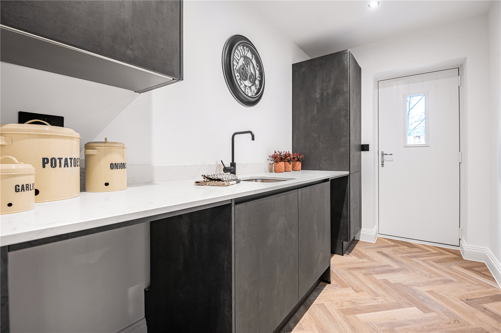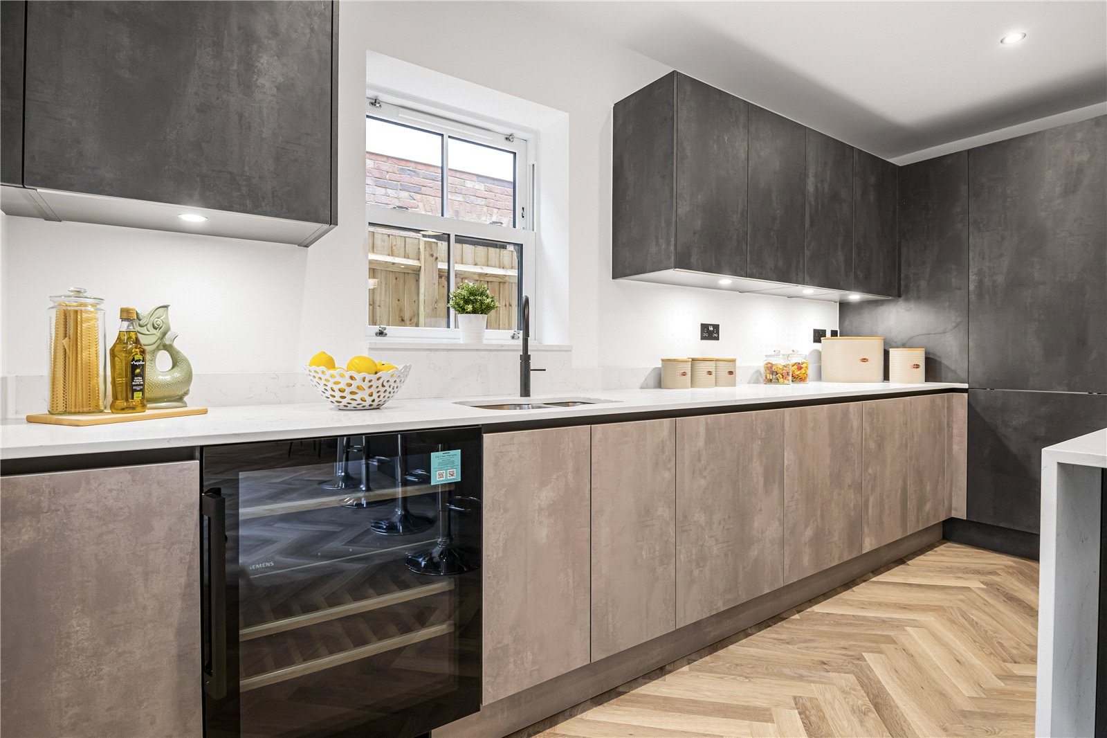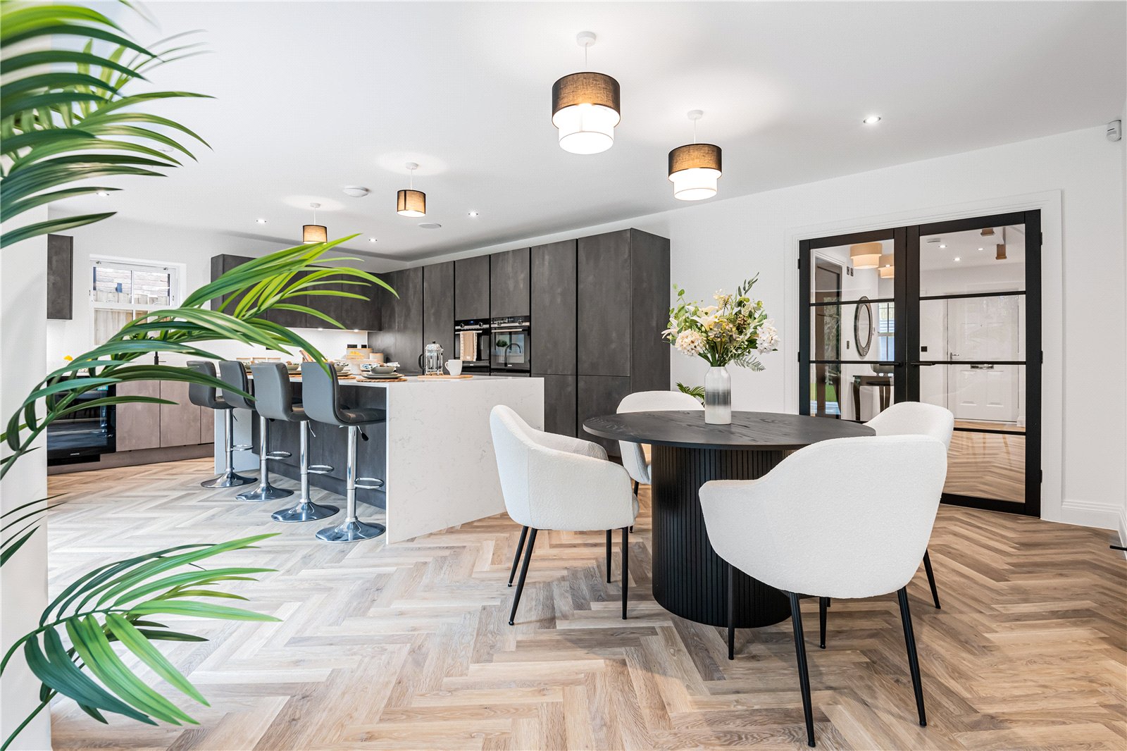 The kitchen boasts a sleek, modern design with handless cabinetry, quartz worktops, and a full range of premium integrated appliances including a double oven with microwave, induction hob with extractor, full-length fridge and separate freezer, dishwasher, wine cooler, and a hot water Quooker tap.