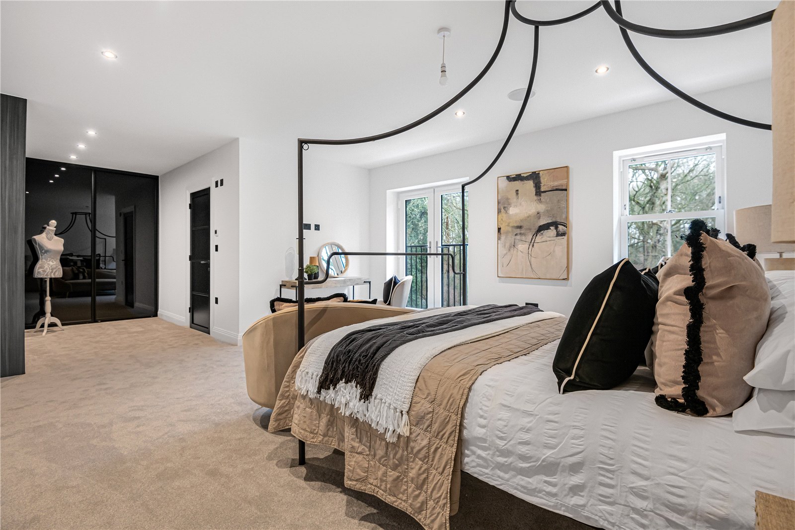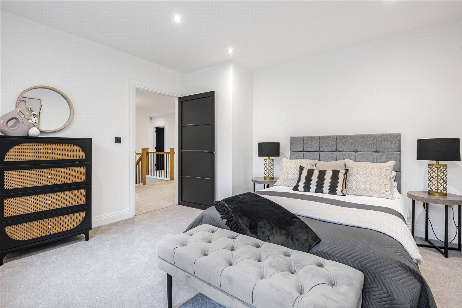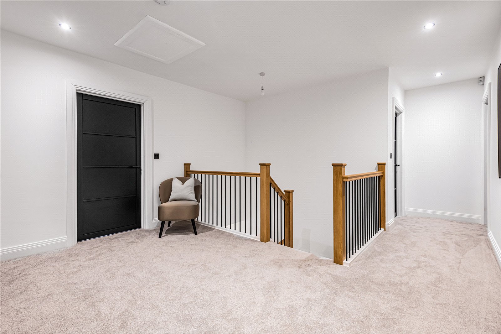 The bathrooms and en-suites feature luxury Porcelanosa sanitaryware and tiles, concealed cistern toilets, and Aqualisa shower controls to the master en-suite with a walk-in shower. PIR lighting adds a touch of sophistication to the en-suites, while plush fitted carpets grace the bedrooms, lounge, and first-floor landing.