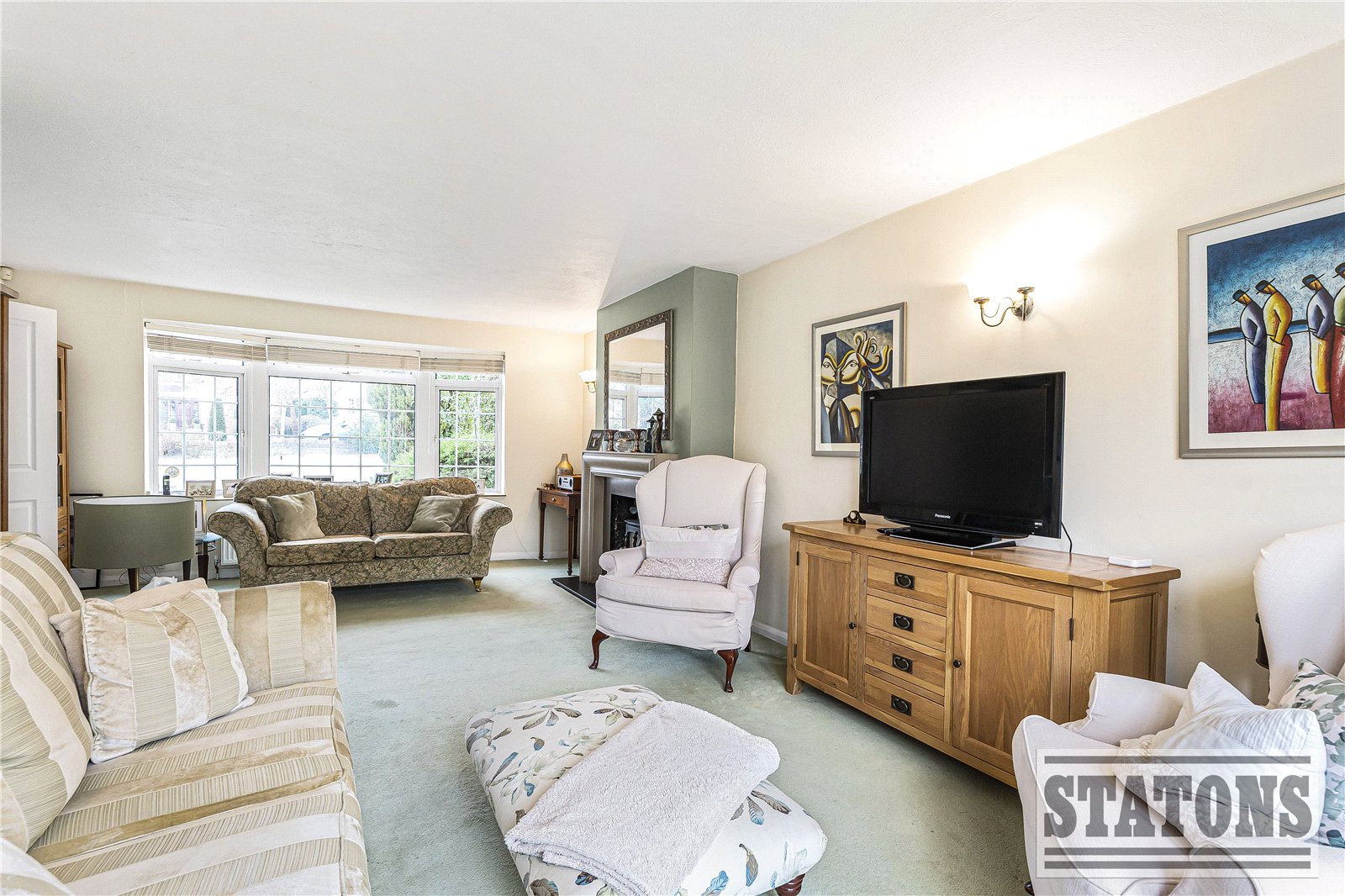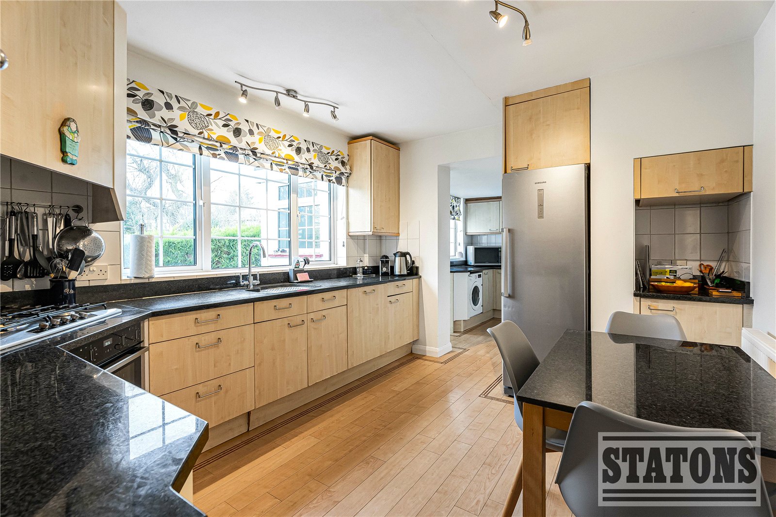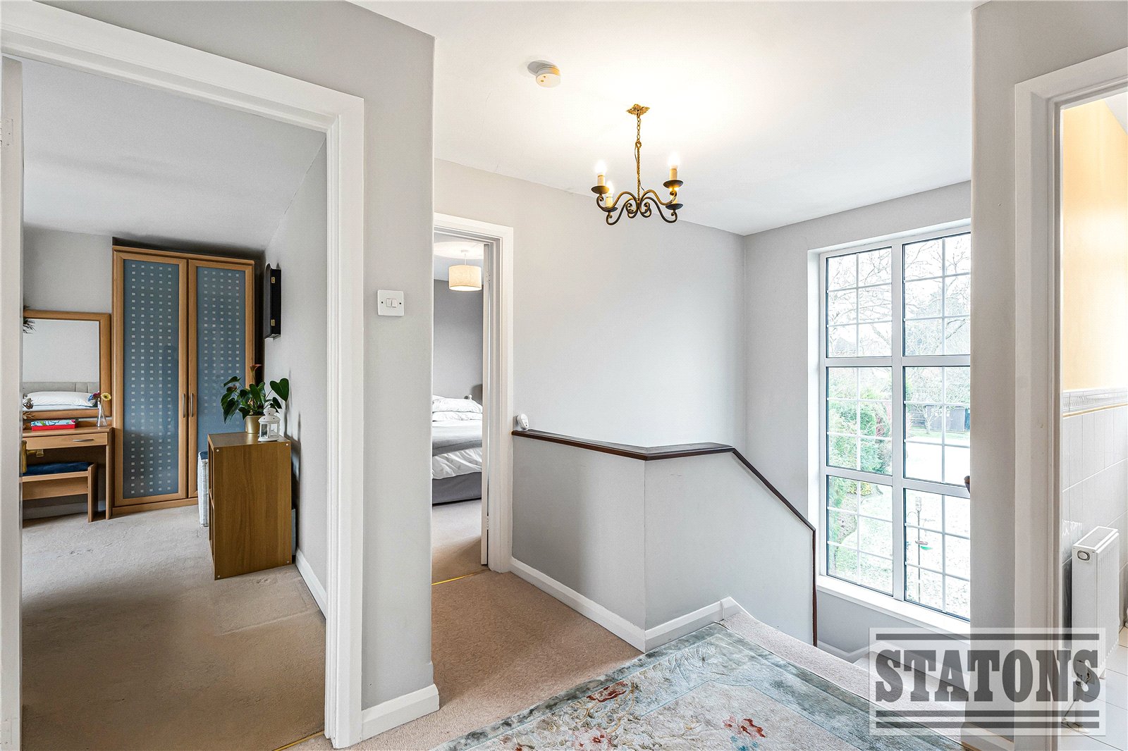 The large through lounge features a dual-fuel log-burning fireplace and French doors opening onto the patio and picturesque gardens. There is also a spacious formal dining room and a well-equipped kitchen that leads through to a utility room with dual internal access to both the garage and the patio. Completing the ground floor is a guest cloakroom.