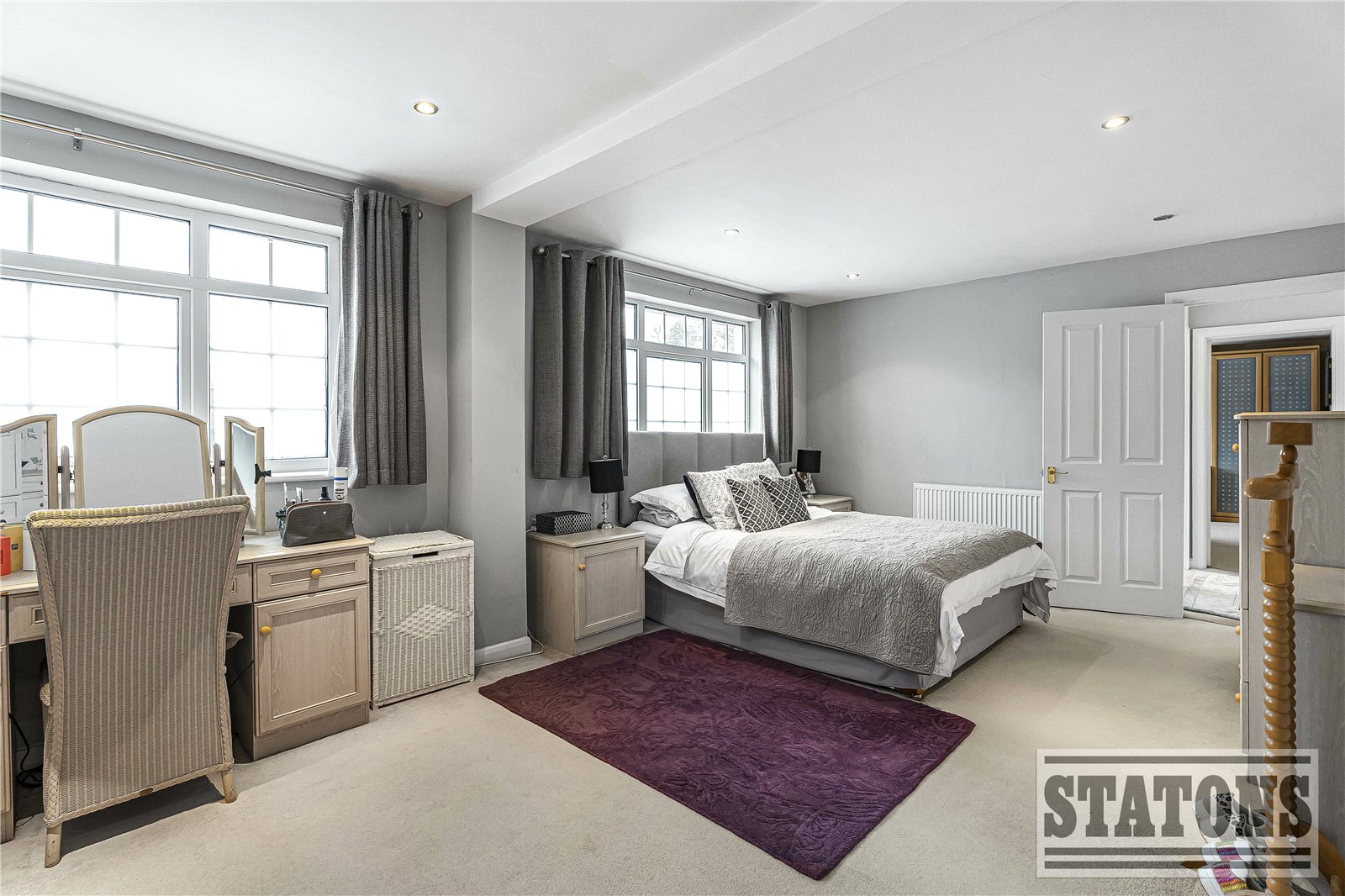 On the first floor, the property boasts a large principal bedroom with a range of bespoke fitted wardrobes and an en-suite bathroom with dual sinks. There are a further three double bedrooms, a family bathroom, and a separate WC.
