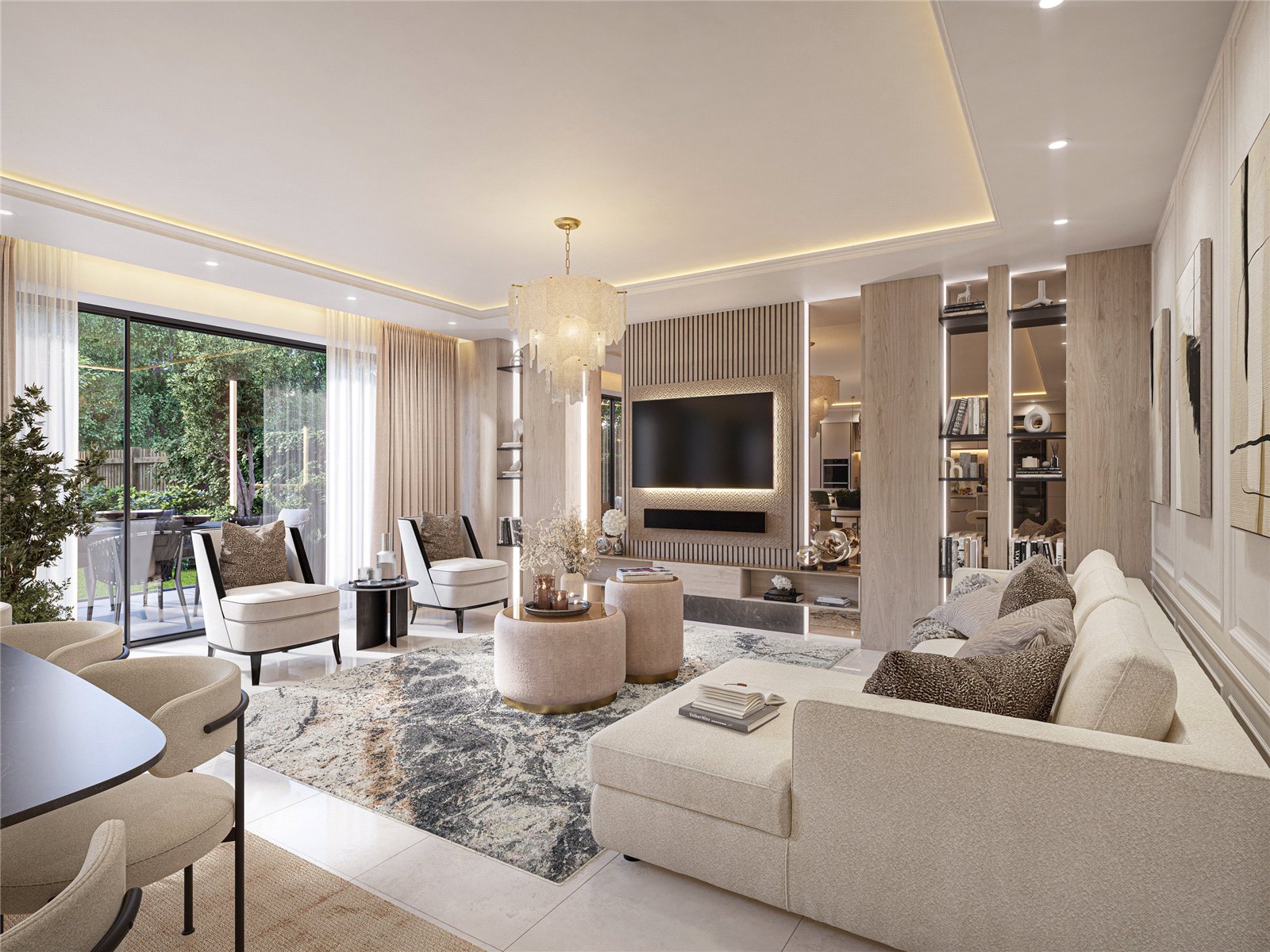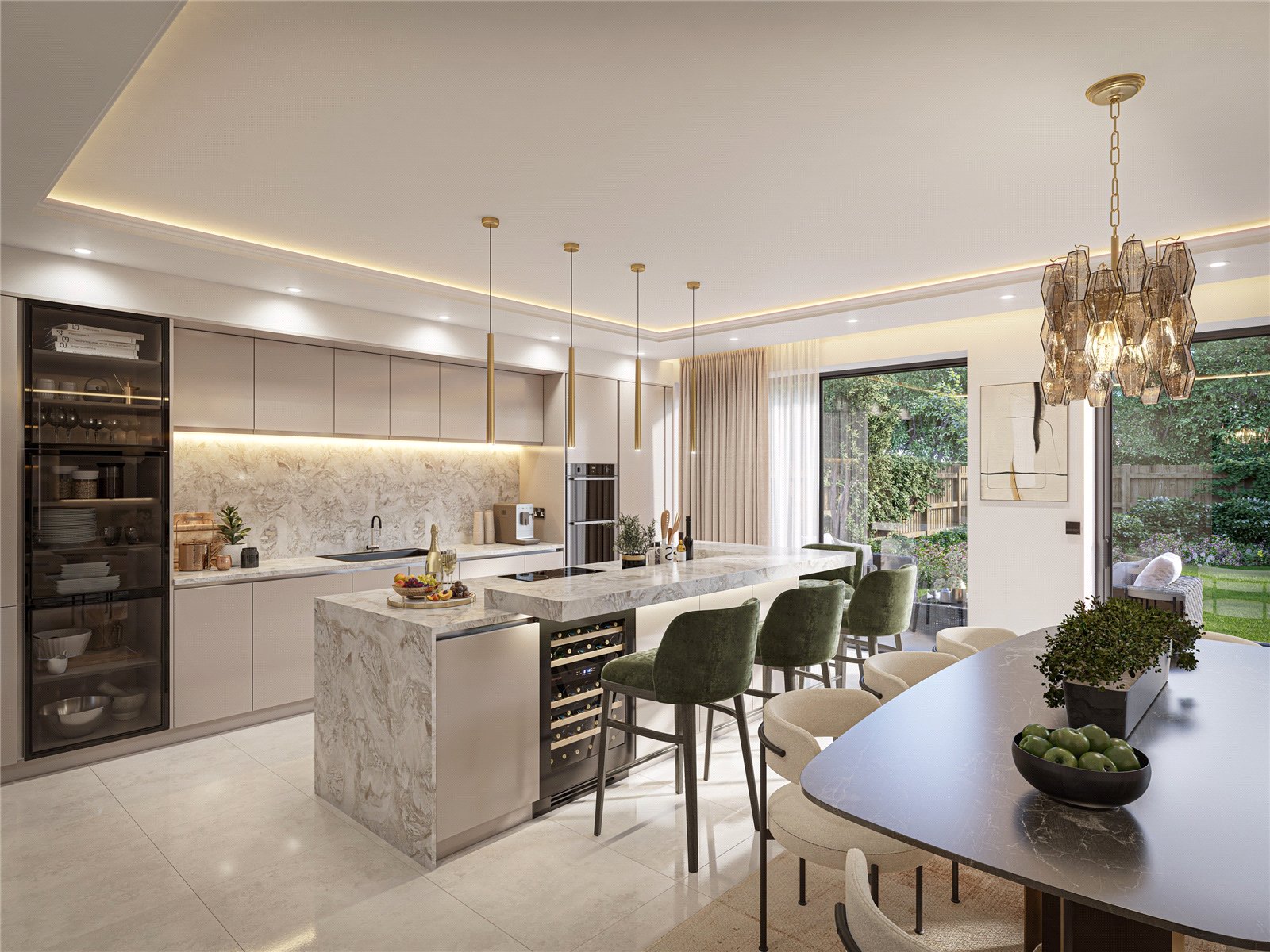 At the heart of each home is a spectacular open-plan kitchen, living and dining space, ideal for everyday family life and entertaining. A statement 3-metre island with Taj Mahal 50mm stone worktops anchors the room, complemented by bespoke handleless cabinetry, full-height stone splashbacks and premium Siemens appliances. Bi-fold doors open onto landscaped gardens, seamlessly blending indoor and outdoor living.