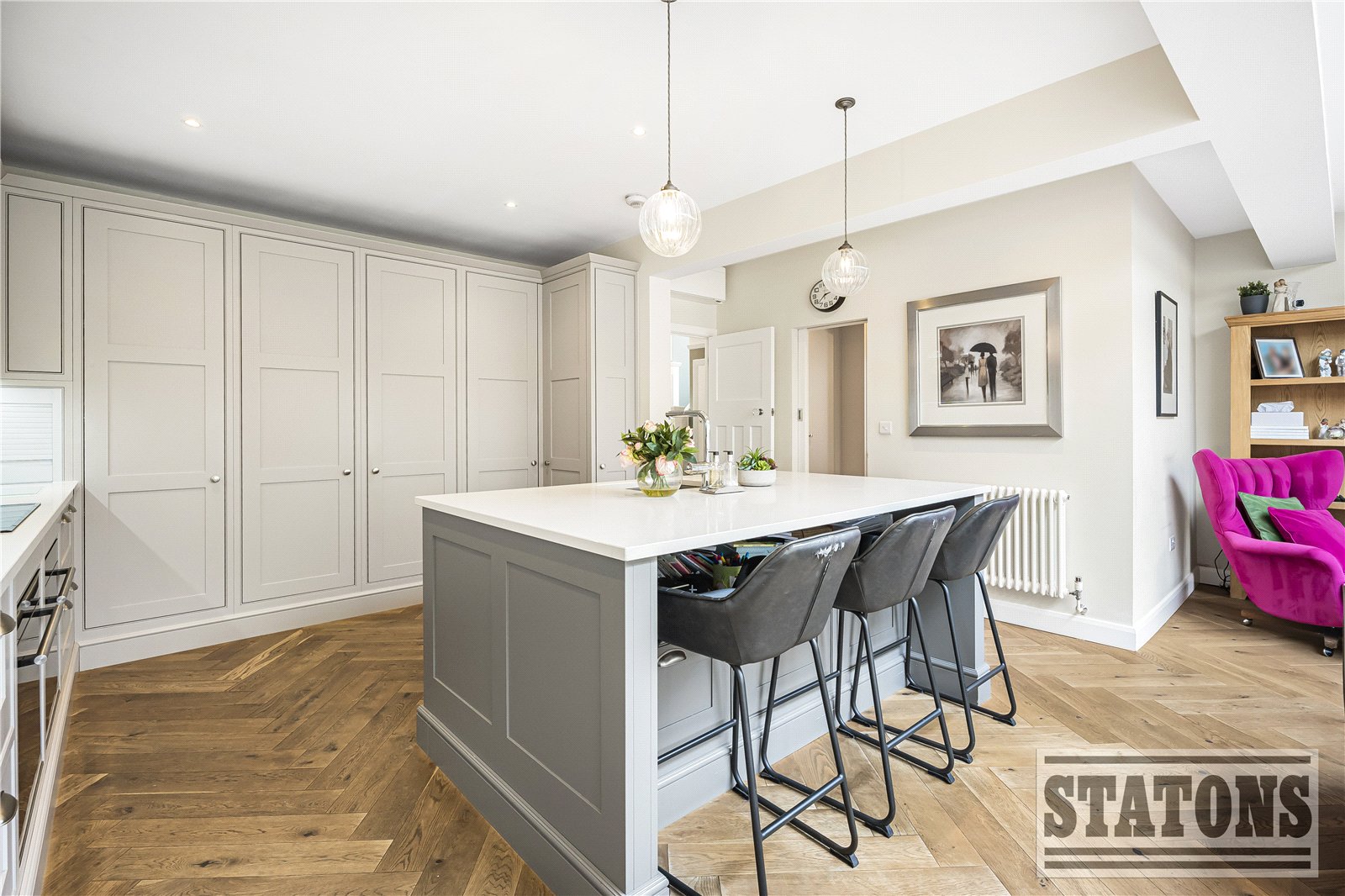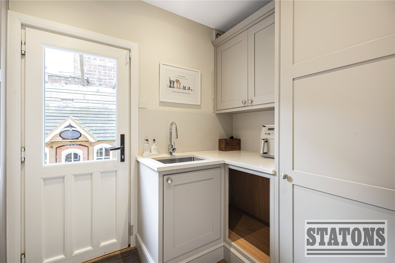 At the heart of the home lies a stunning bespoke shaker-style kitchen, individually designed and crafted to an exacting specification. Complete with custom cabinetry and premium work surfaces, this impressive space is perfectly suited for everyday living and entertaining. Adjacent to the kitchen is a utility room with a convenient side entrance, while the courtyard garden, featuring a pergola, provides a peaceful outdoor retreat.