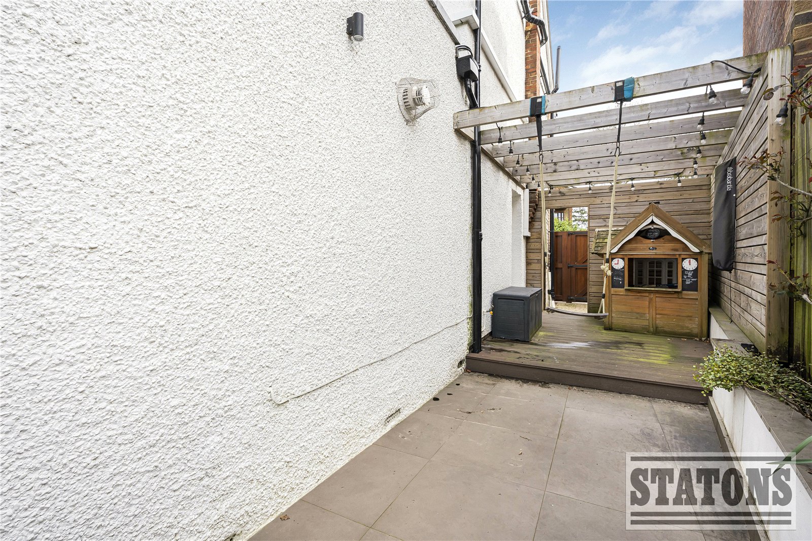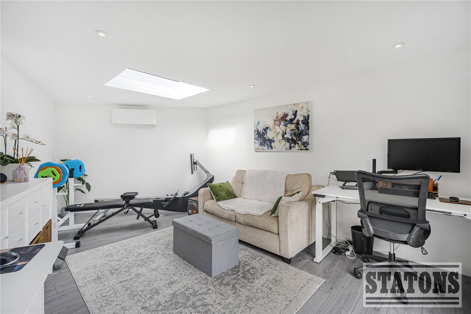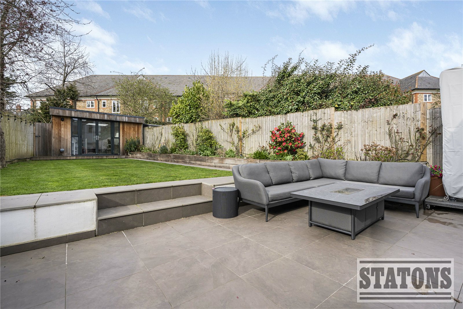 The rear garden is a private and inviting space, featuring an expansive patio terrace with planted borders, seamlessly flowing into a lawned area. A tiled pathway leads to a versatile garden studio, currently used as a combined office and gym, providing additional functional space for work, leisure, or fitness.