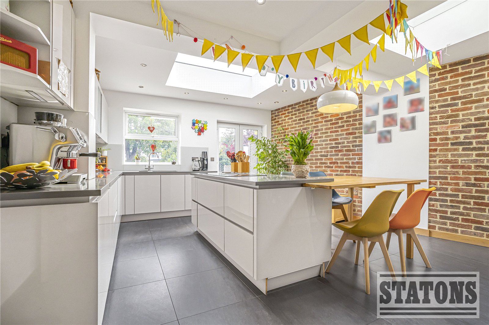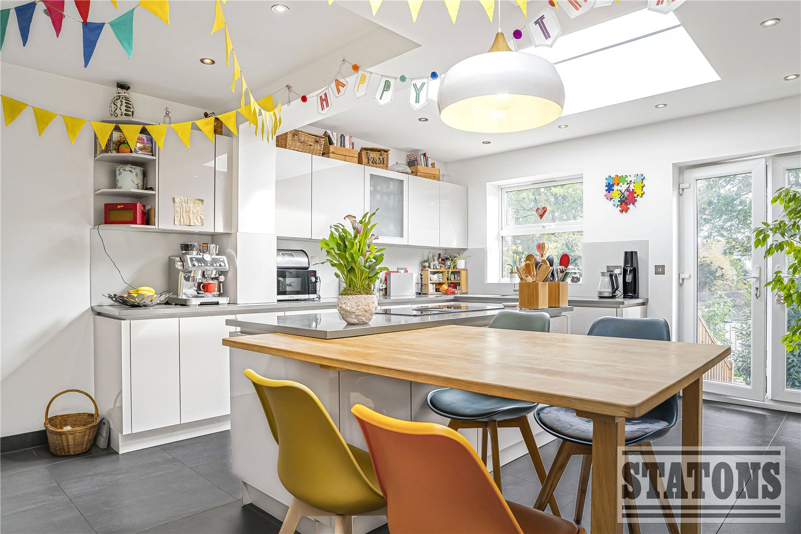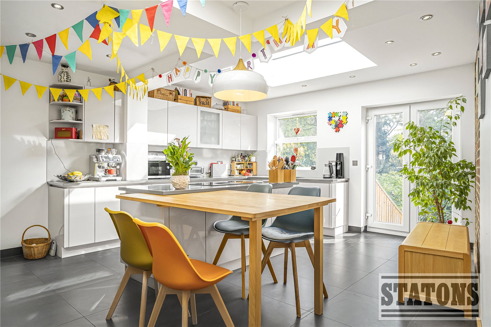 On the ground floor, a welcoming hallway leads to a spacious living room with a bay window, a formal dining room, and a truly stunning kitchen/breakfast room complete with modern fittings and direct access to the secluded rear garden—perfect for entertaining. The ground floor further benefits from a utility room, guest cloakroom, storage space, and access to the garage and driveway.