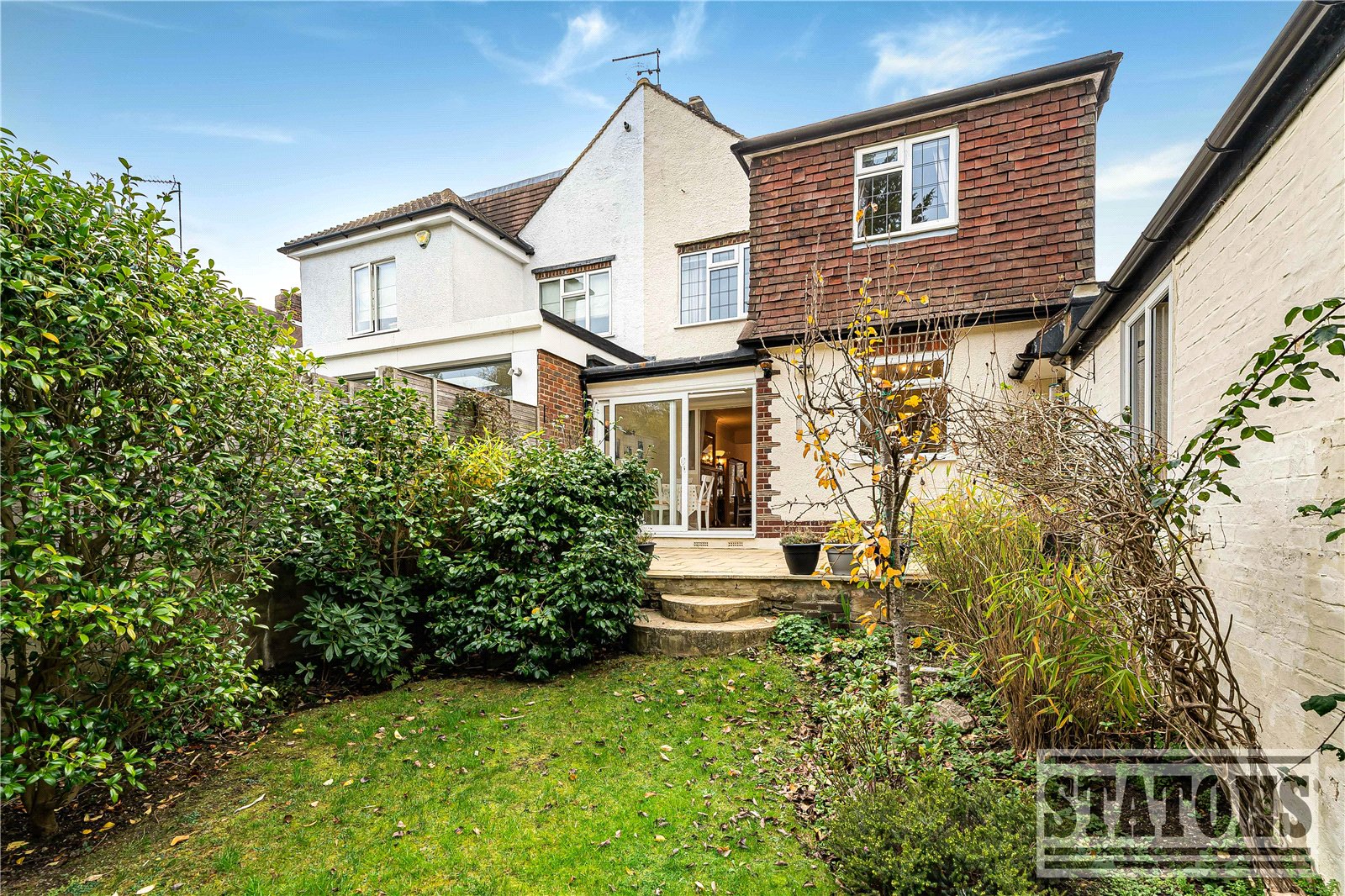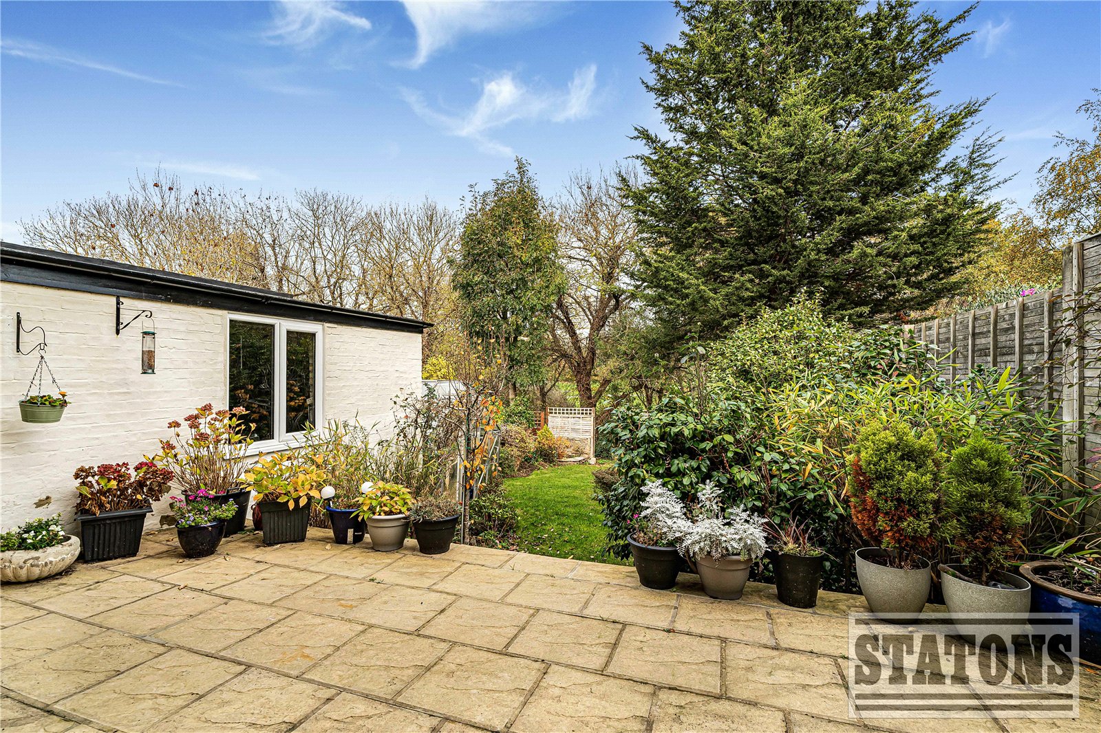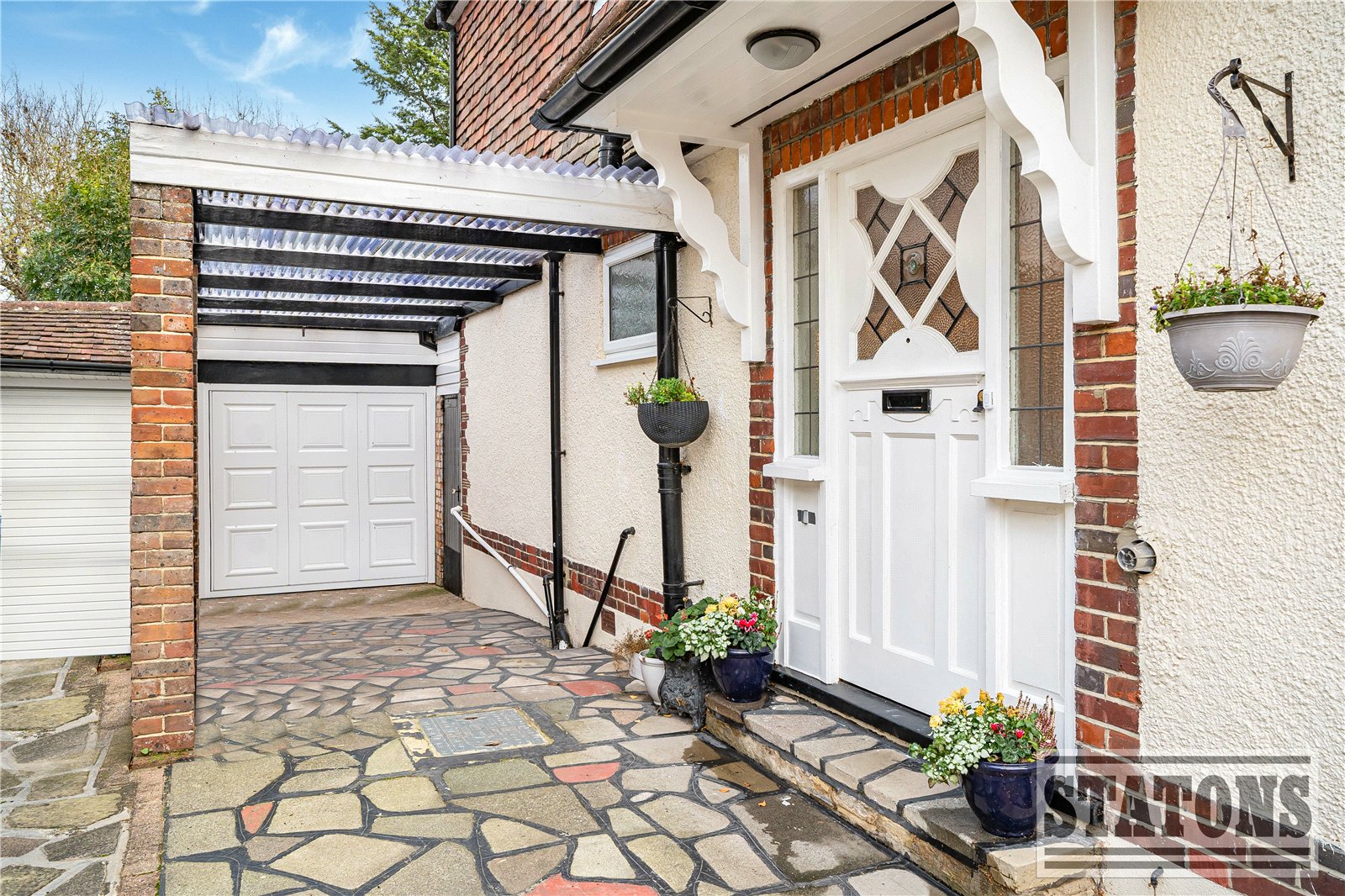 Outside, the property features a private rear garden with patio area, greenhouse, and access to a detached garage. The front driveway provides additional off-street parking.