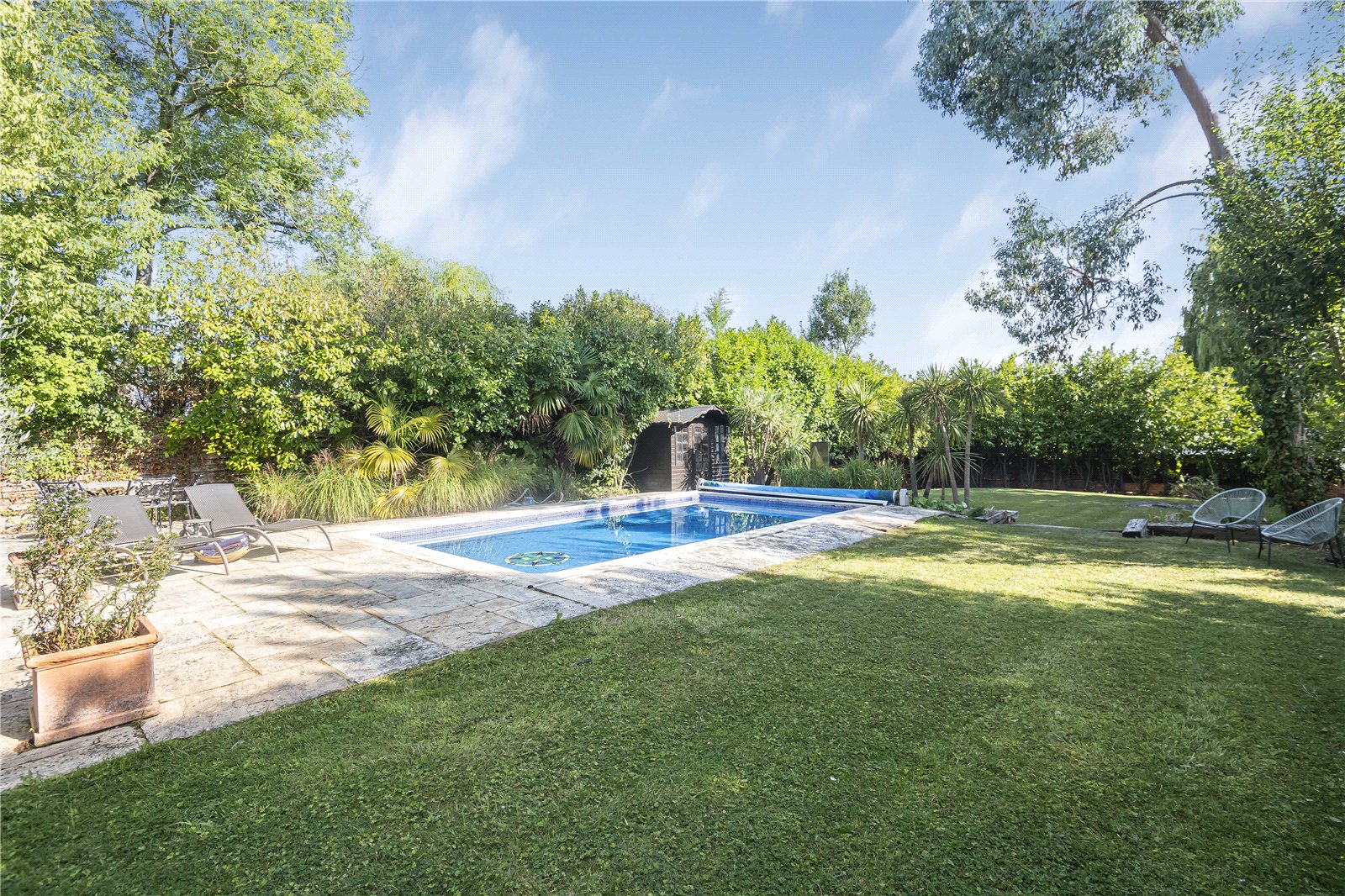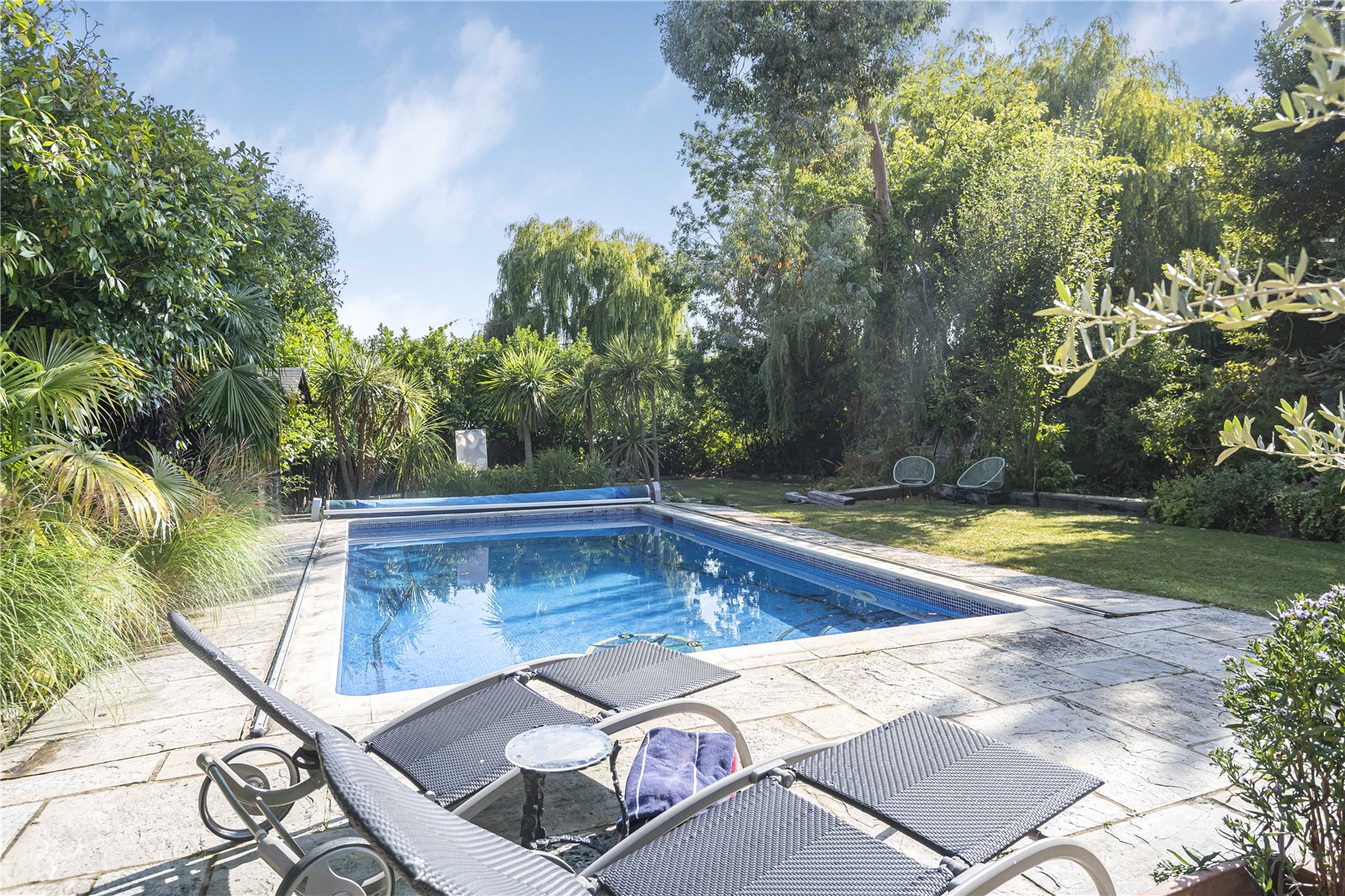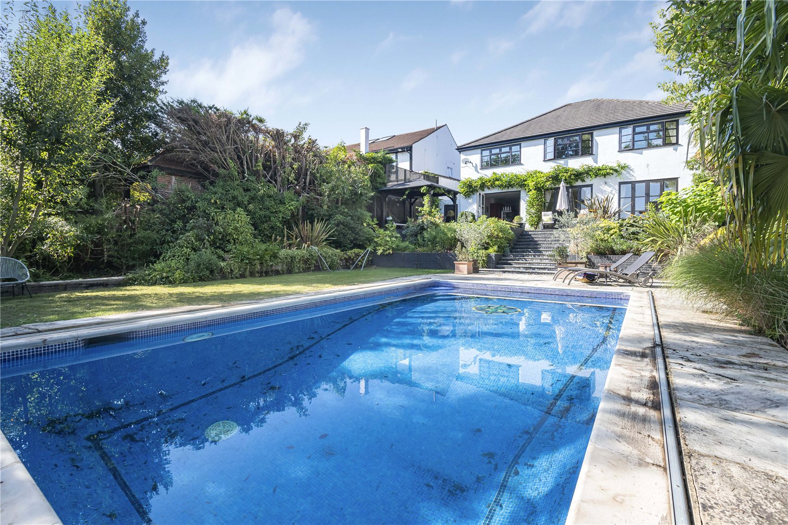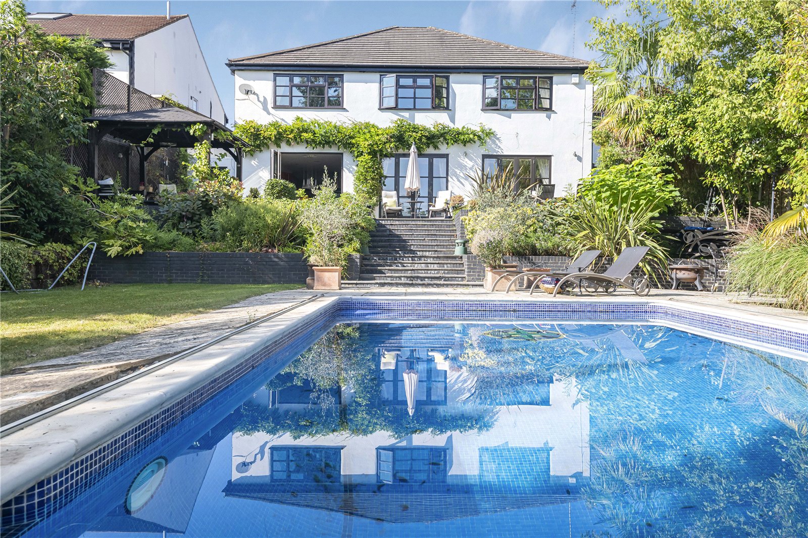 The modern kitchen is equipped with modern appliances and ample storage space. The landscaped garden provides a tranquil outdoor retreat which includes a glorious outdoor pool, perfect for relaxing or entertaining guests. Additional highlights include off-street parking and a well-maintained exterior.