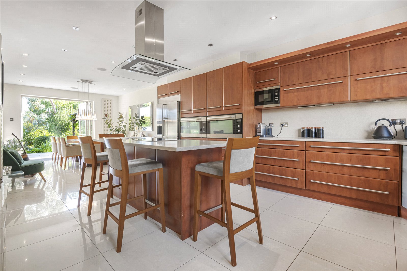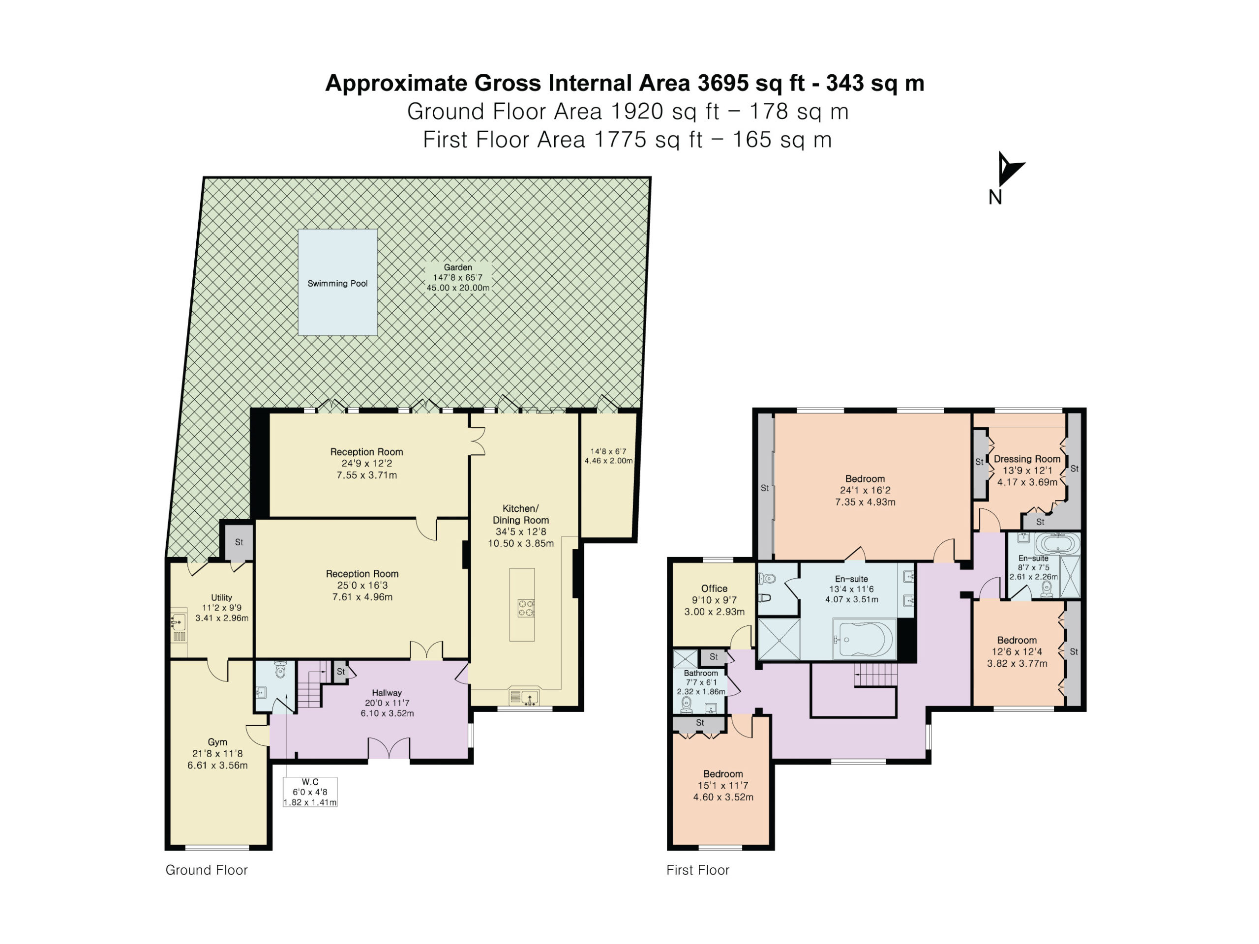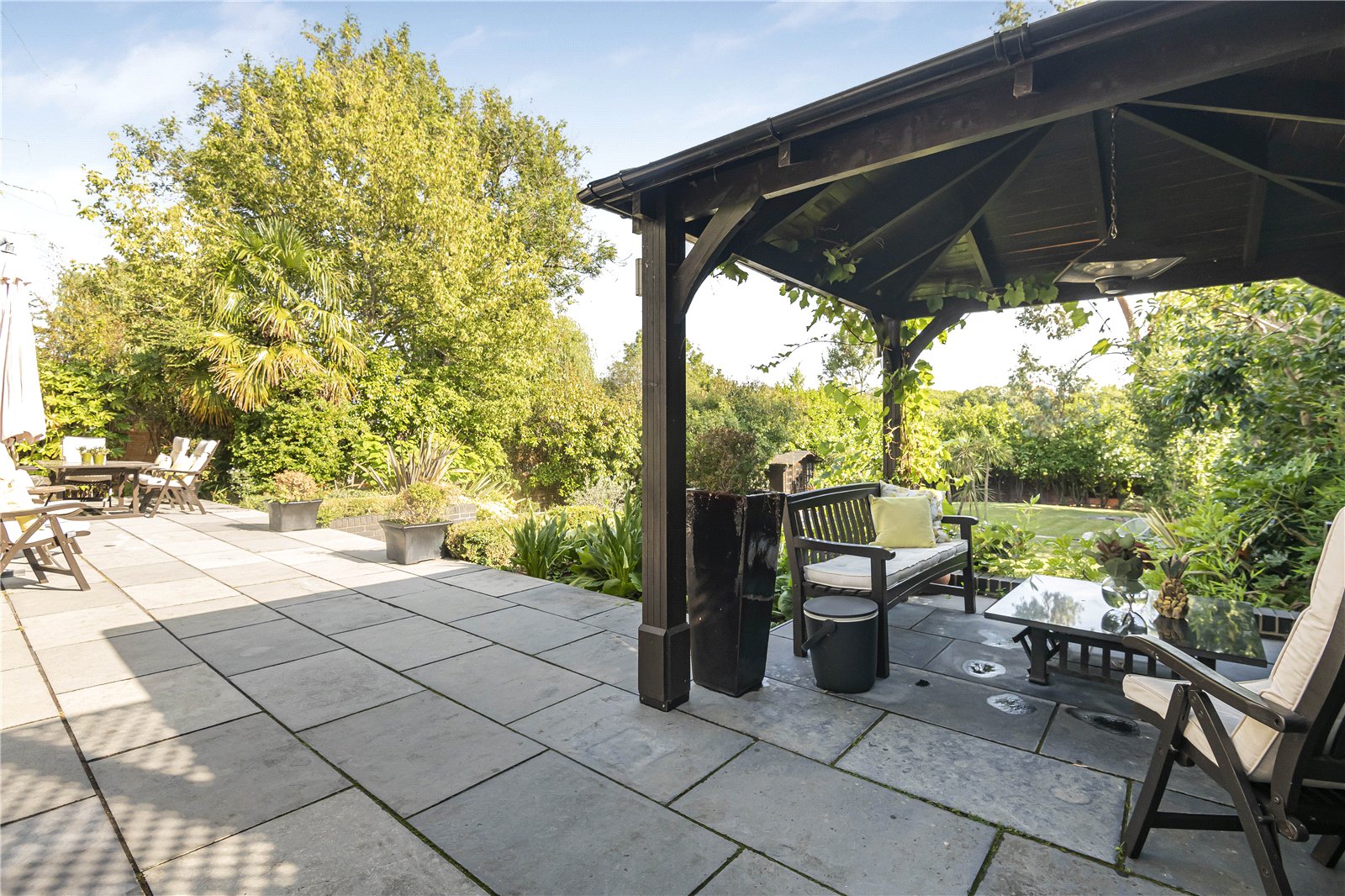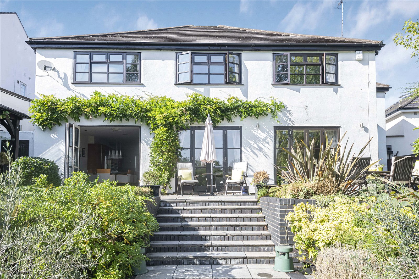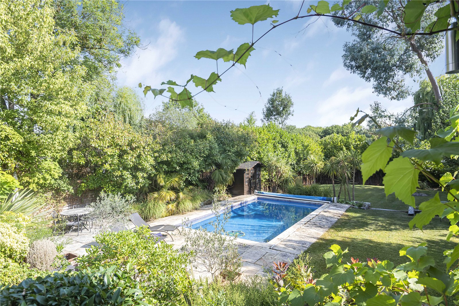 The modern kitchen is equipped with modern appliances and ample storage space. The landscaped garden provides a tranquil outdoor retreat which includes a glorious outdoor pool, perfect for relaxing or entertaining guests. Additional highlights include off-street parking and a well-maintained exterior.