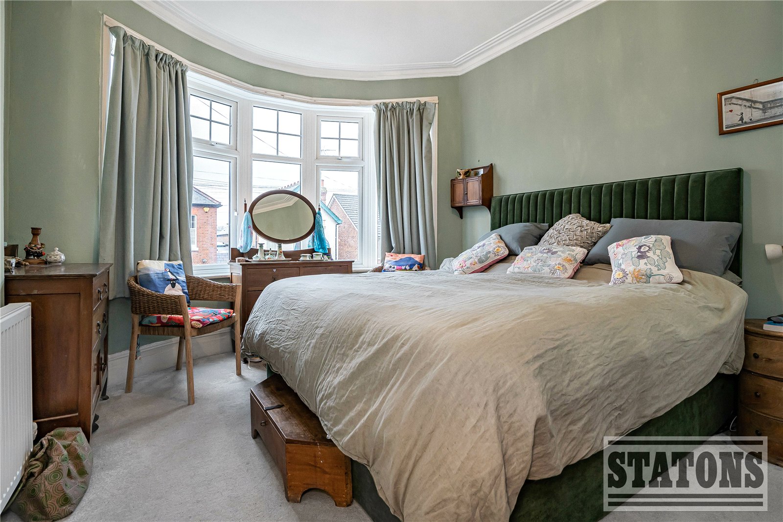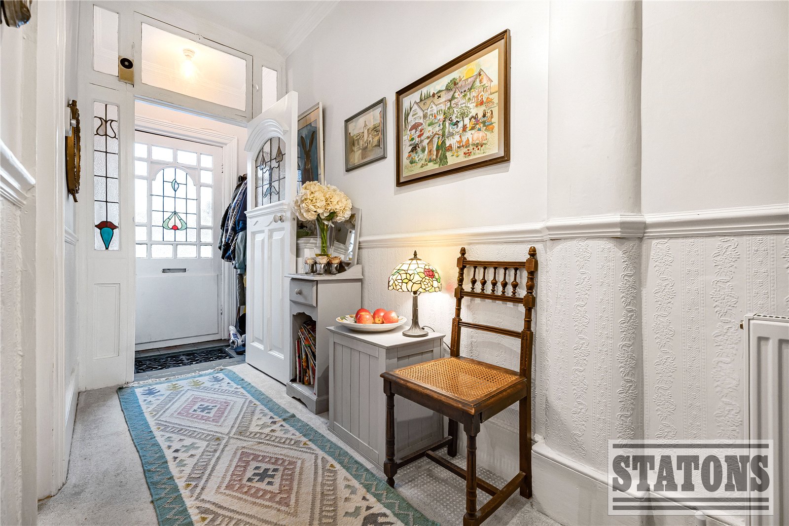 The property is entered via a welcoming hallway, providing access to the main living areas and stairs to the first floor. To the front of the house is a bright and comfortable living room, featuring a curved bay window that allows for excellent natural light.