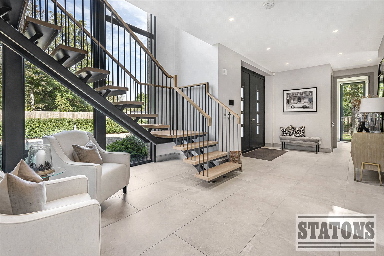 Accessed via a secure gated entrance, the property features a spacious driveway offering ample off-street parking, as well as a double garage. Upon entering, the sense of light and space is immediately apparent, with a grand entrance hallway setting the tone for the elegant interiors beyond.
