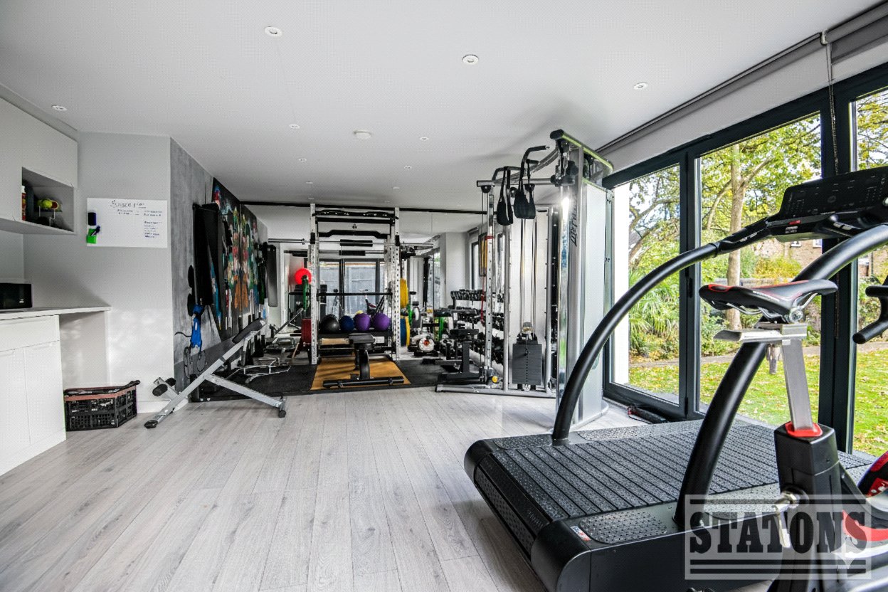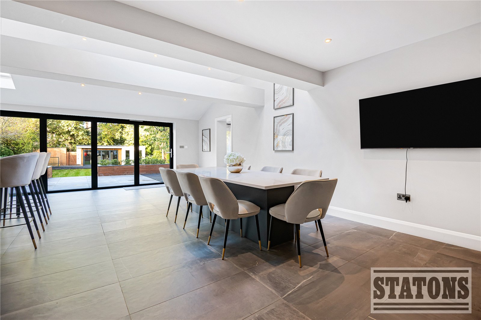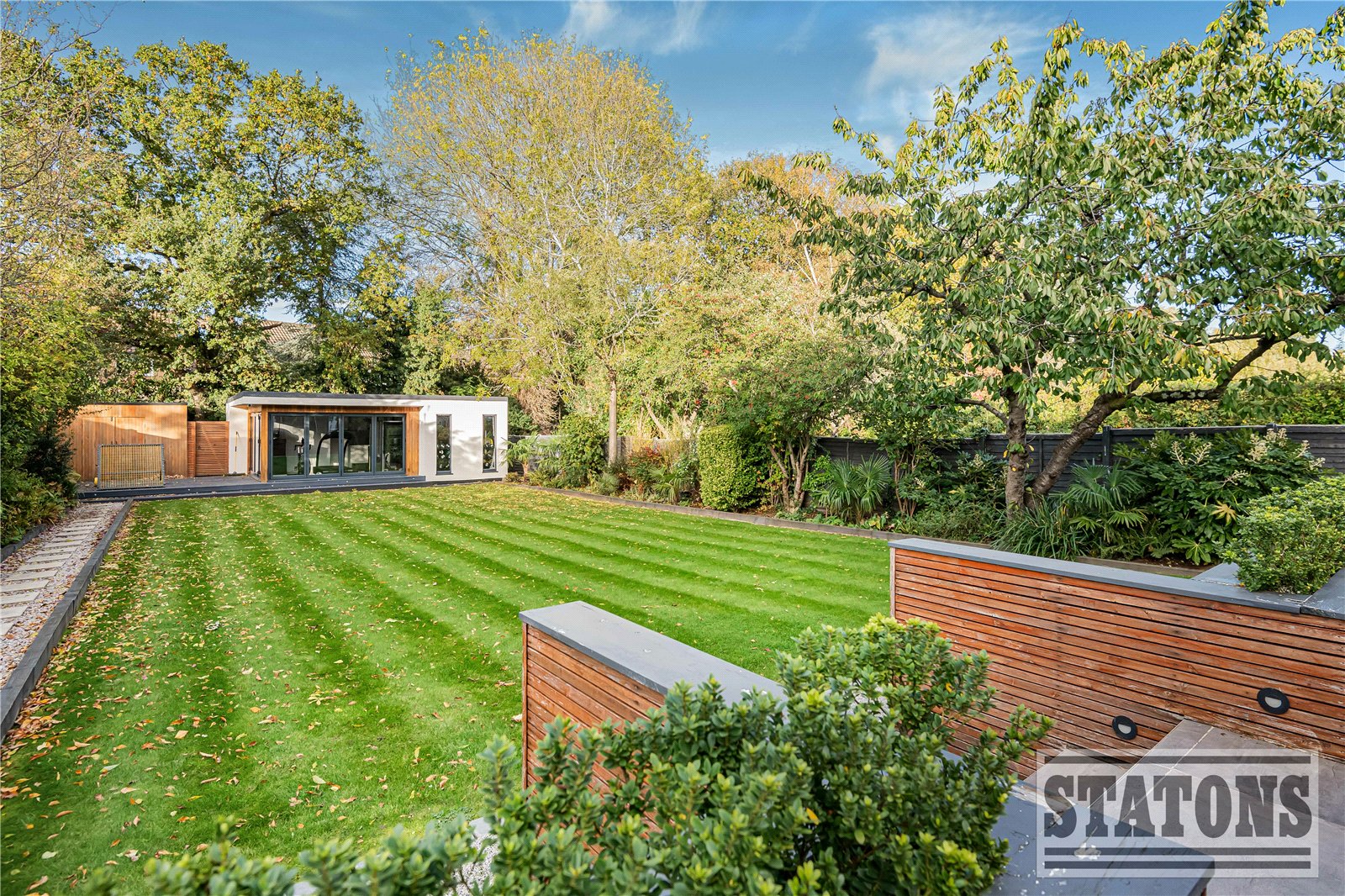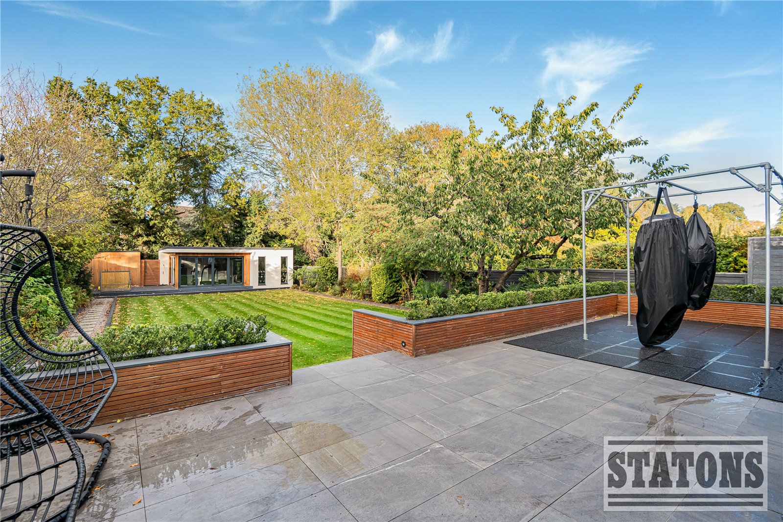 The rear garden offers a generous patio area, perfect for outdoor dining and entertaining, leading onto a lawn surrounded by mature shrubs and trees. At the rear is a decked terrace with a garden store, as well as a contemporary garden room with bi-folding doors, underfloor heating, and a WC/shower room — ideal as a gym, office, or guest space.