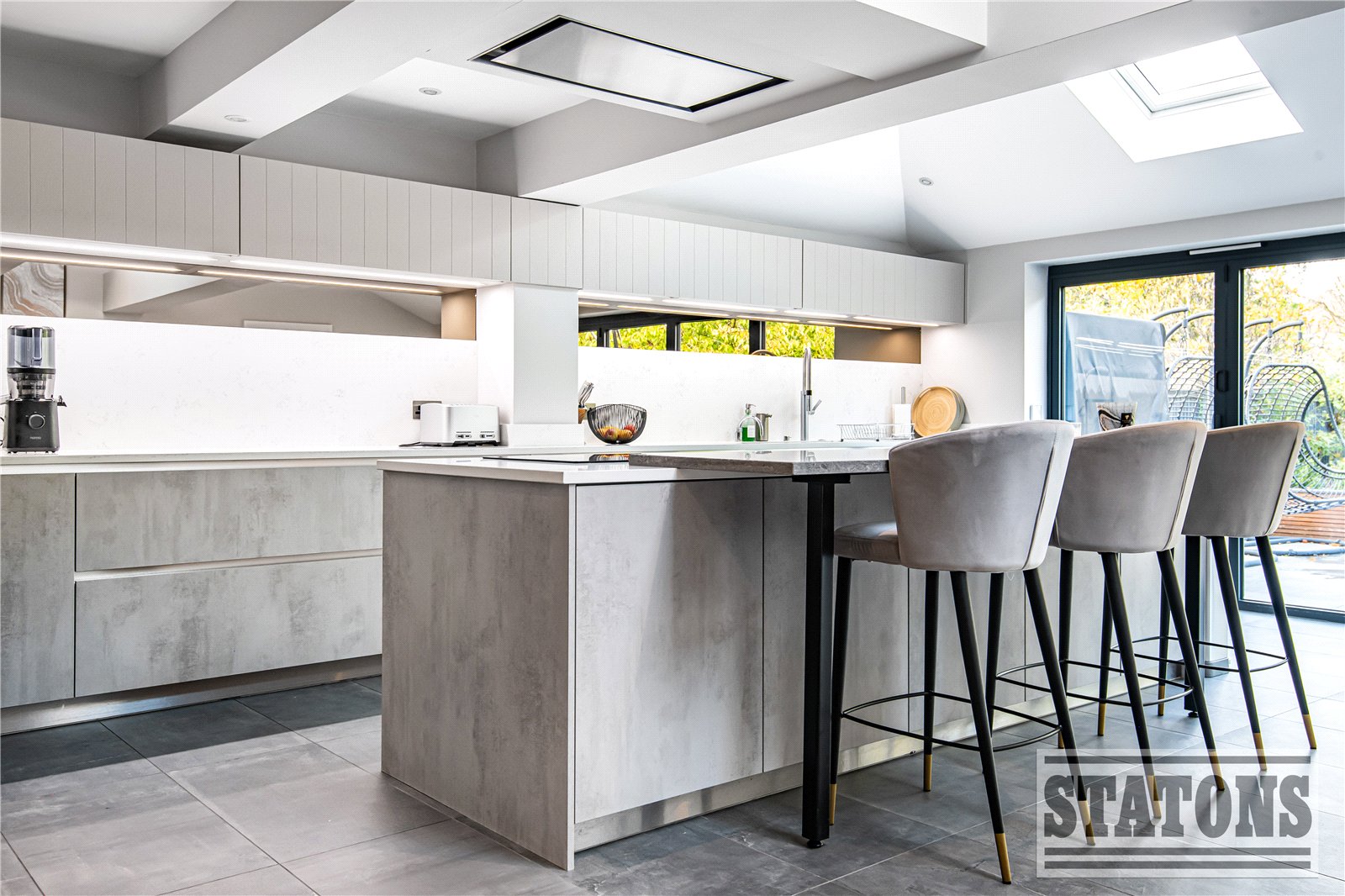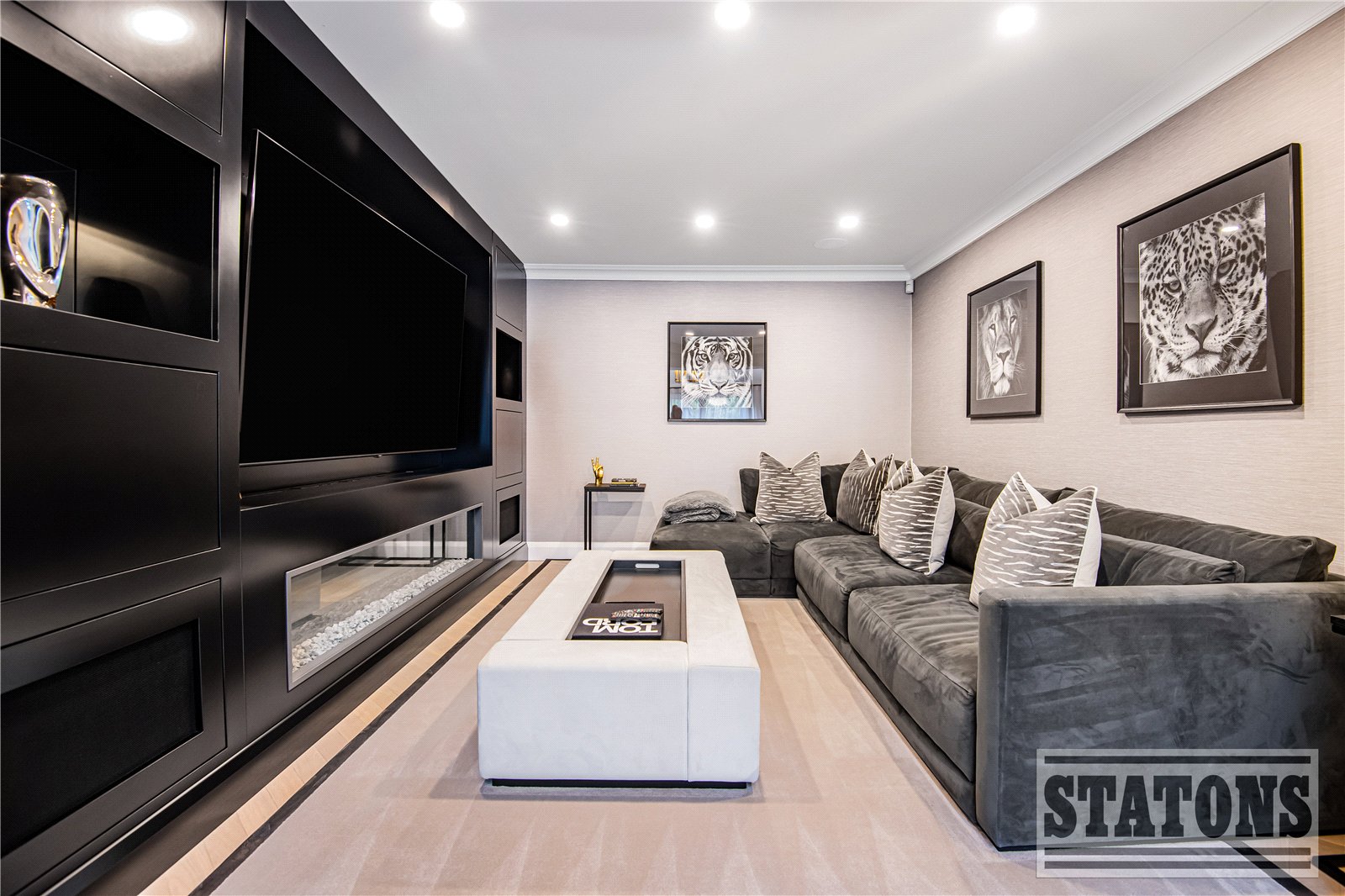 The contemporary fully fitted kitchen features a natural stone breakfast bar, offering lovely views across the garden, and stone-tiled flooring with underfloor heating extends seamlessly through to the morning room and media room. A separate utility room and guest WC, both with underfloor heating, are located off the hallway. The principal reception areas also benefit from an integrated Sonos sound system with custom-installed speakers.