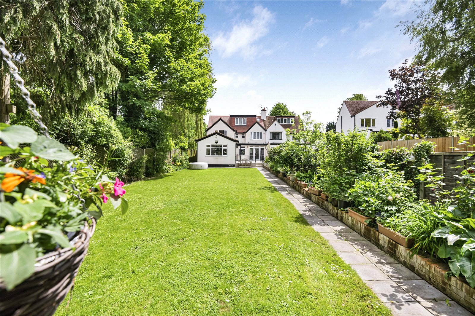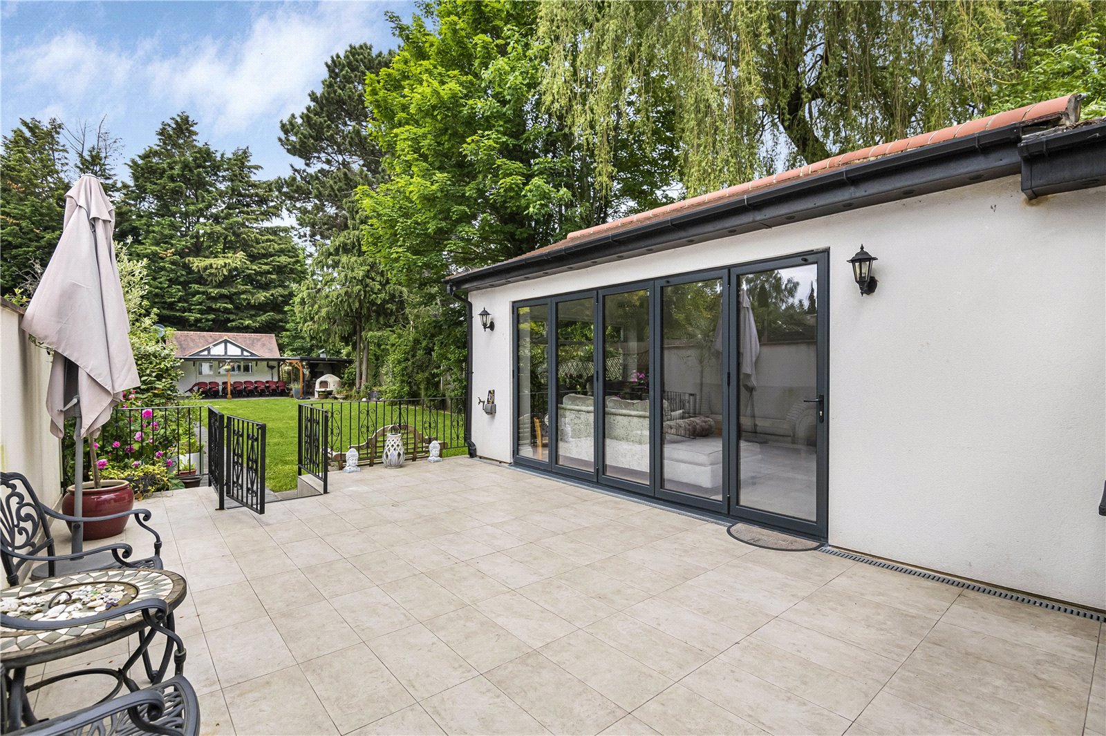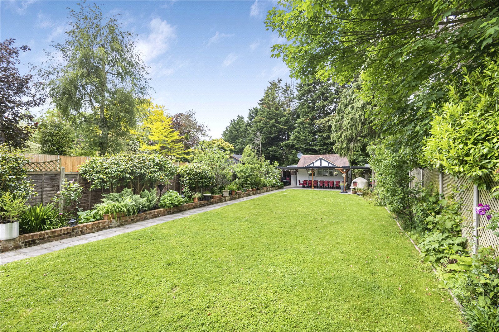 The rear garden has been designed in two sections with a formal garden from the rear terrace that is broken up by beds of matures shrubs and trees that lead to a rear section of garden with mature fruit trees. The garden is approx. 150ft in length and has a purpose-built garden room along with a fitted kitchenette and separate showroom/WC. A large pergola is also attached for outdoor entertaining and cooking.