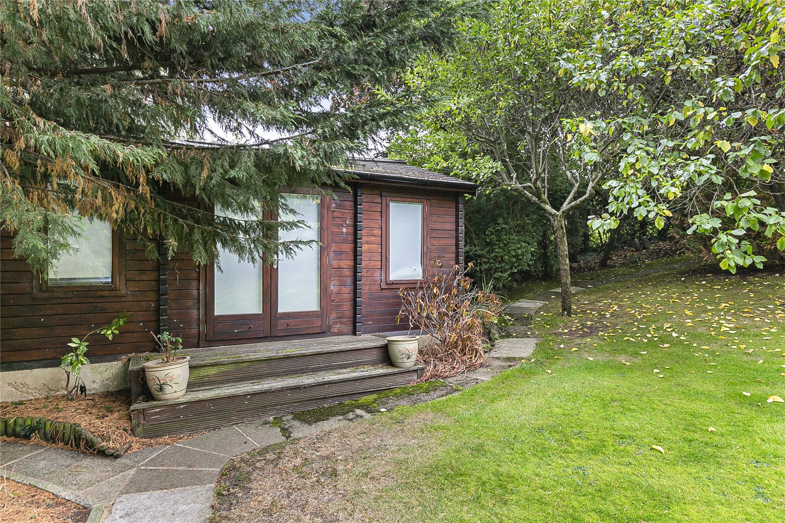 The open plan lounge-dining room is entered through double doors from the hall with sliding doors to the rear from which you step onto the full width raised south facing terrace overlooking the landscaped secluded south facing garden, with steps leading to a sunken second terrace, and mature orchard where nestles a fully insulated log cabin, presently home to an Endless' exercise infinity pool, but with a multiplicity of possible other uses.