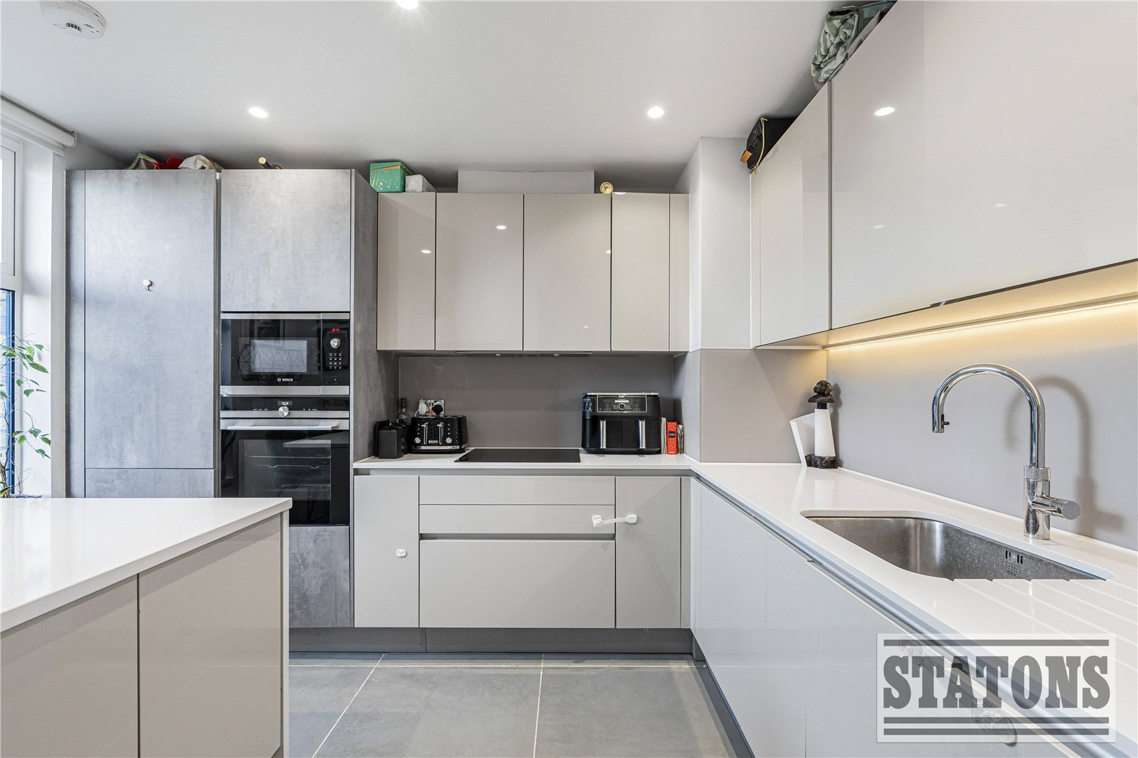 The ground floor features a stylish fully equiped contemp kitchen complete with quartz worktops and a central island and a Quooker instant hot water tap, creating the perfect space for both everyday living family life. To the front of the property there is a convenient guest WC, along with a practical utility room. A few steps lead down to a generous open-plan reception area with bi folding doors leading to direct access to the south-facing garden. The newly installed patio provides an ideal setting for outdoor dining and relaxing in the sunshine.