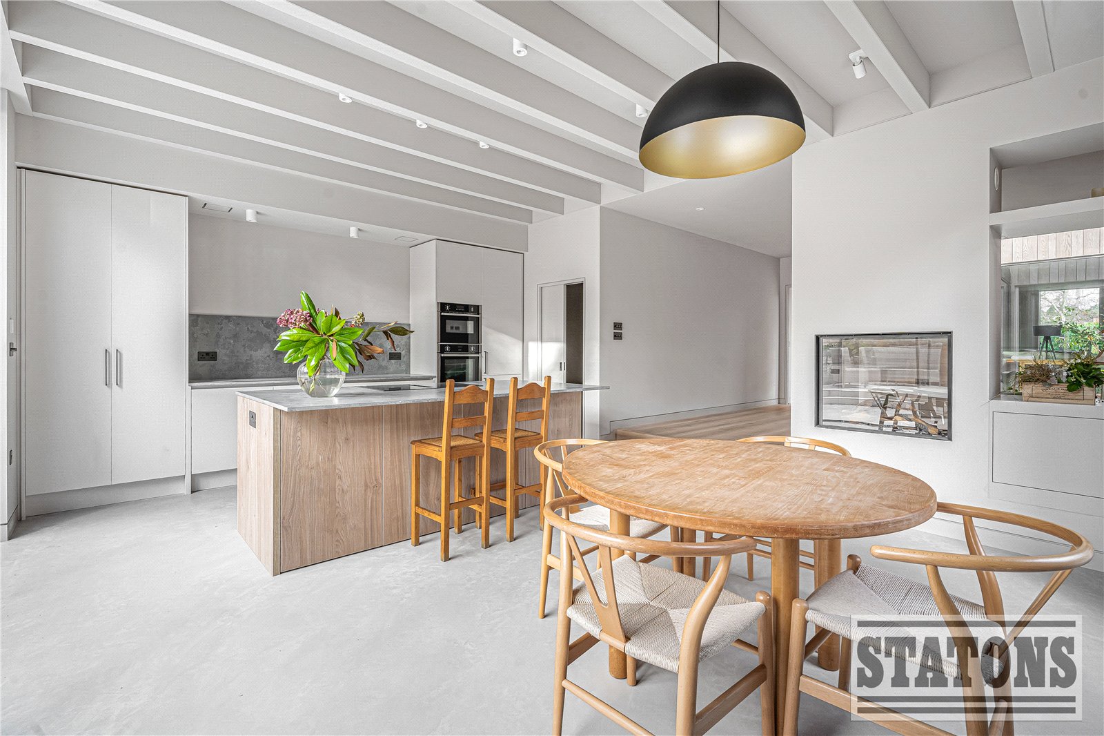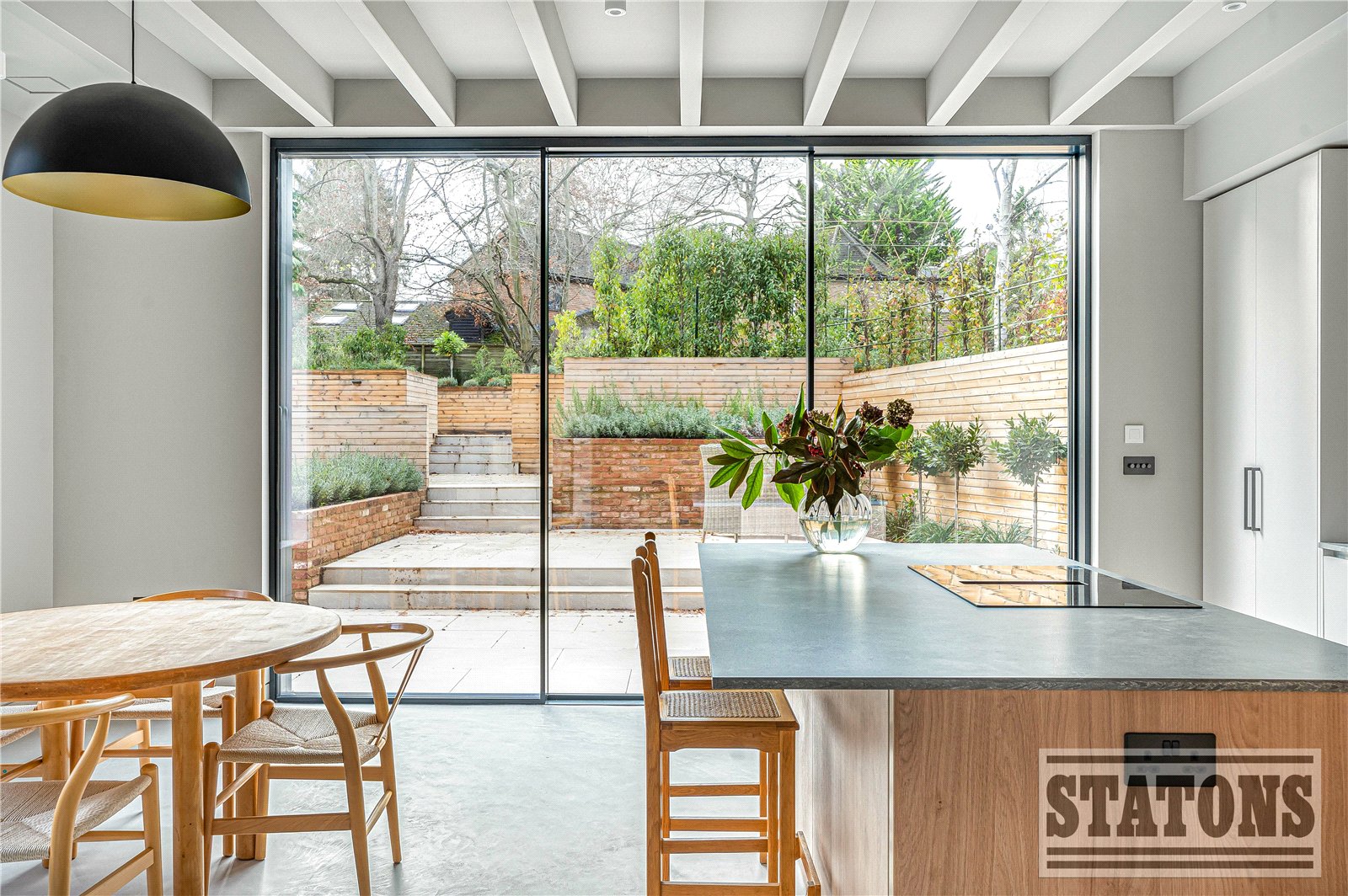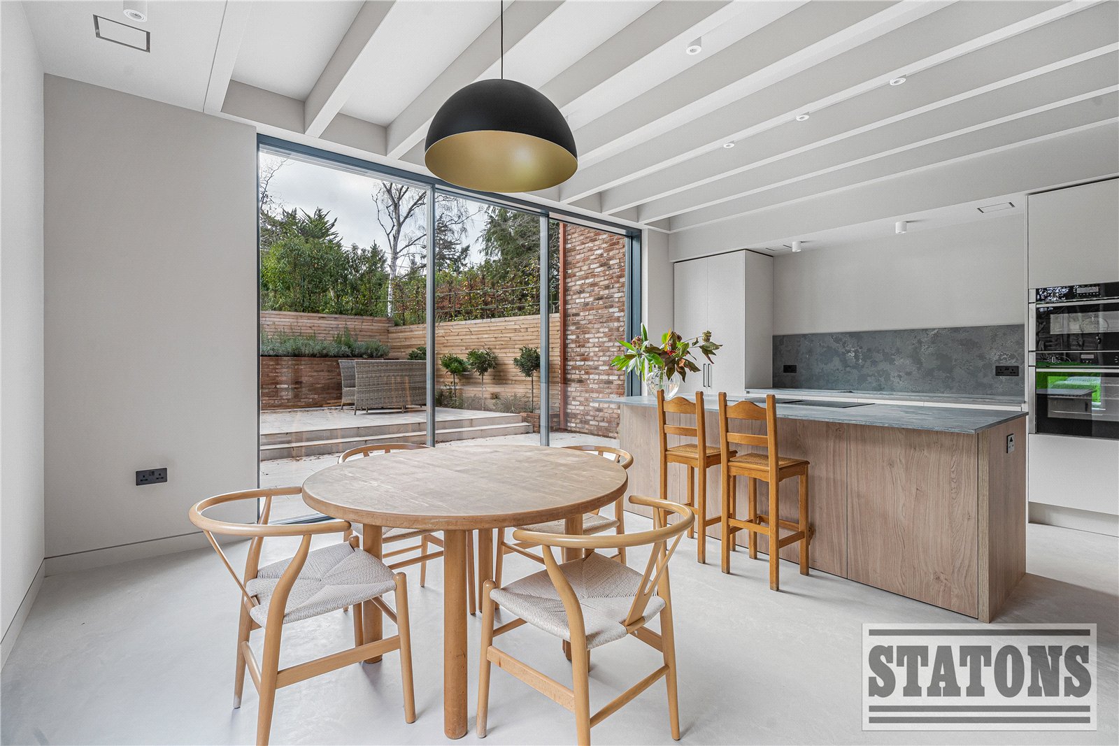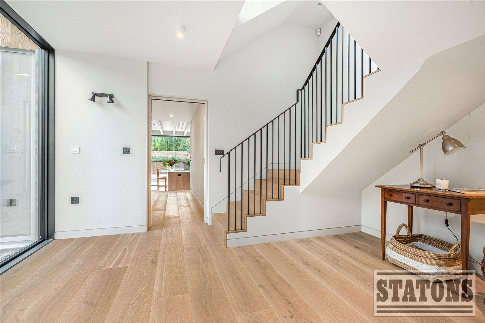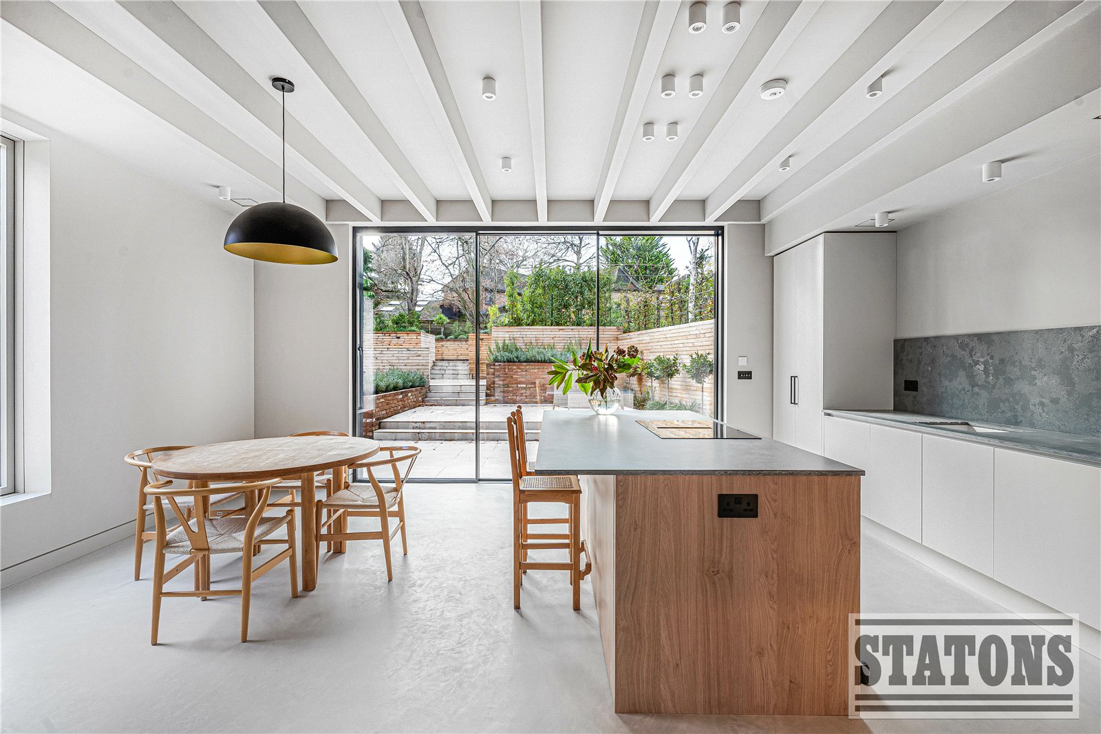 The ground floor centres around a welcoming entrance hall and comprises a generous dual-aspect study/family room, guest cloakroom and a formal living room. To the rear, the heart of the home is an impressive 20’ open-plan kitchen and dining area with a central island and full-width sliding doors opening directly onto the landscaped rear garden, ideal for both entertaining and everyday family life. A separate utility room sits discreetly off the kitchen.