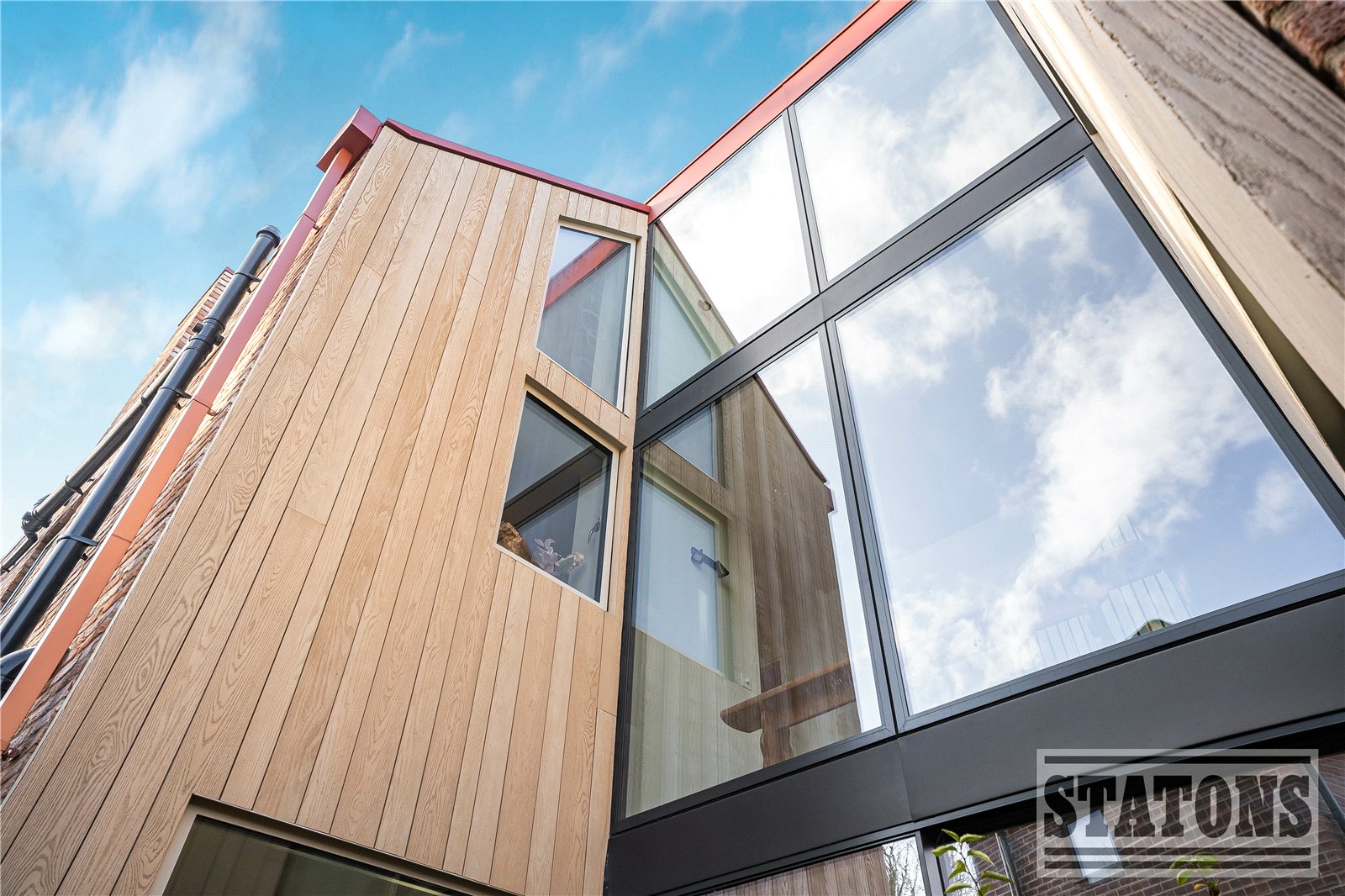 The property presents a striking exterior, featuring warm toned brickwork, expansive glazing and an attractively gated landscaped frontage, creating an immediate sense of quality and understated elegance.