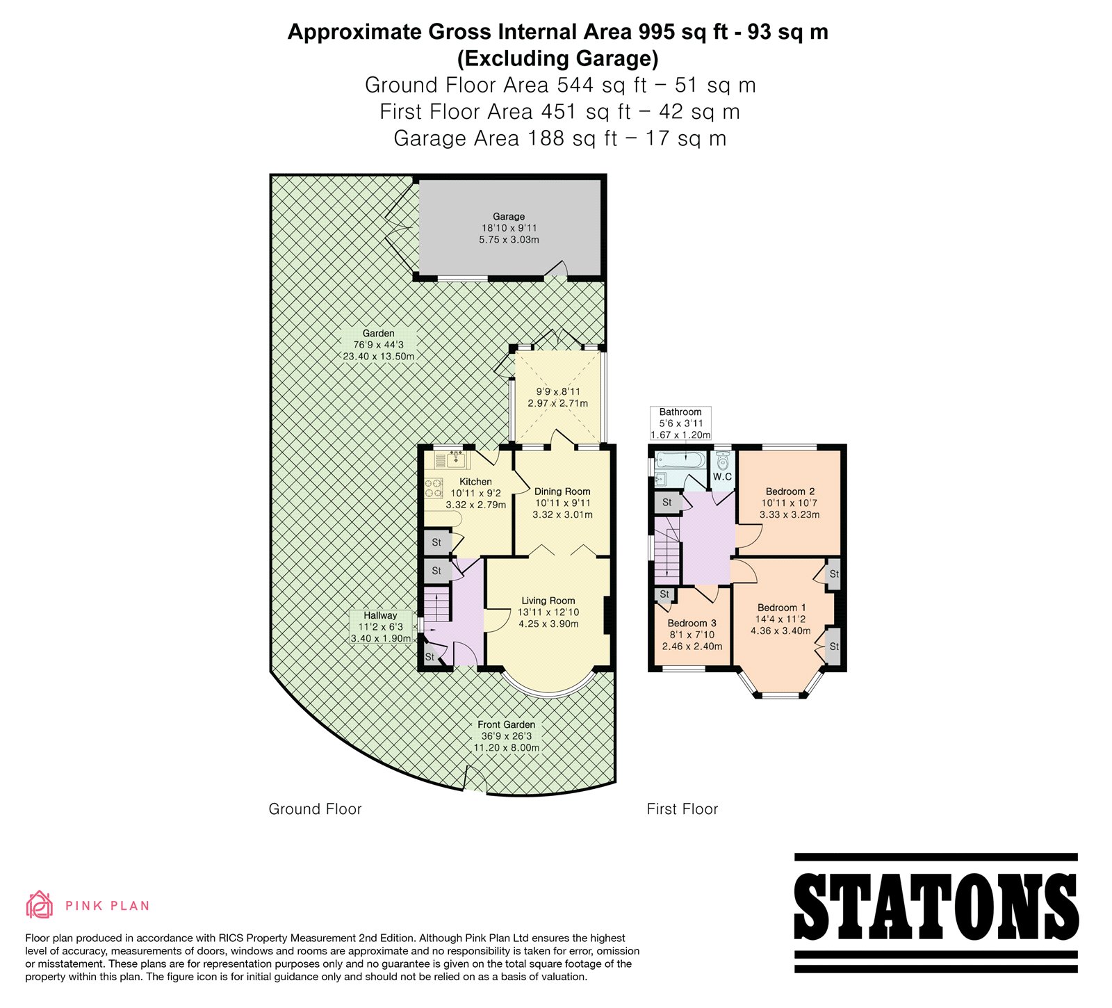 Upstairs, the first floor offers two generous double bedrooms and a good-sized third bedroom, along with a family bathroom and a separate WC.
