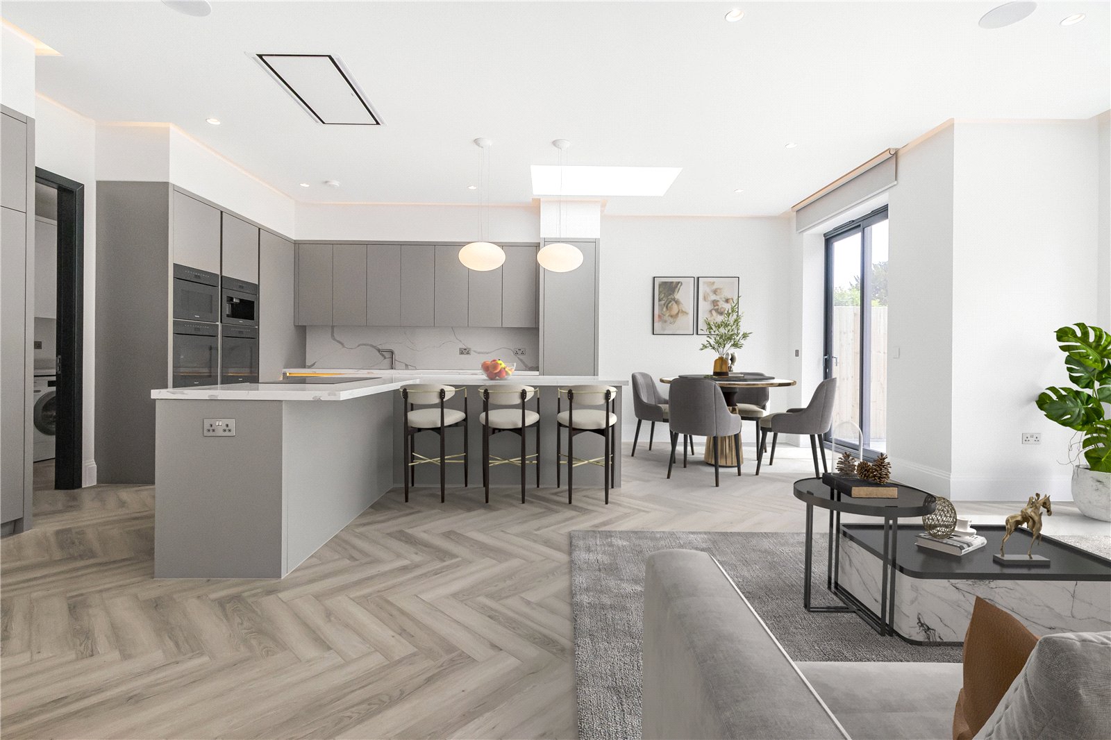 This beautifully presented property boasts a spacious landscaped garden, ideal for outdoor entertaining, along with secure off-street parking for convenience. The ground floor comprises a spacious reception hall entrance, a bright and airy living room complete with an original period feature fireplace, large guest cloakroom/wc, a modern bespoke designed fitted kitchen with integrated Miele and Siemens appliances, and a separate open plan dining area with bifold doors that lead directly onto the garden, plus a fully fitted laundry/utility room complete with Miele appliance.